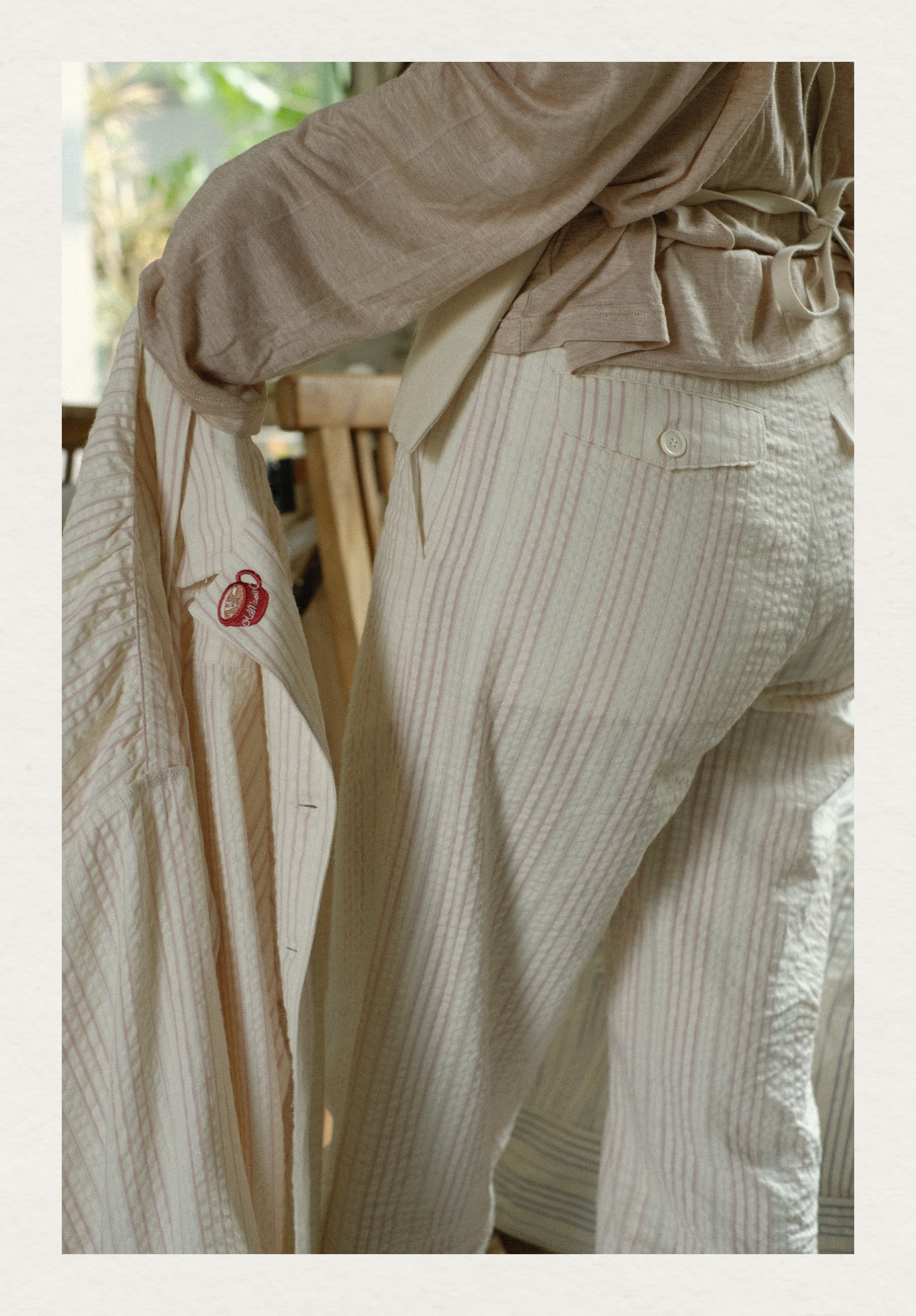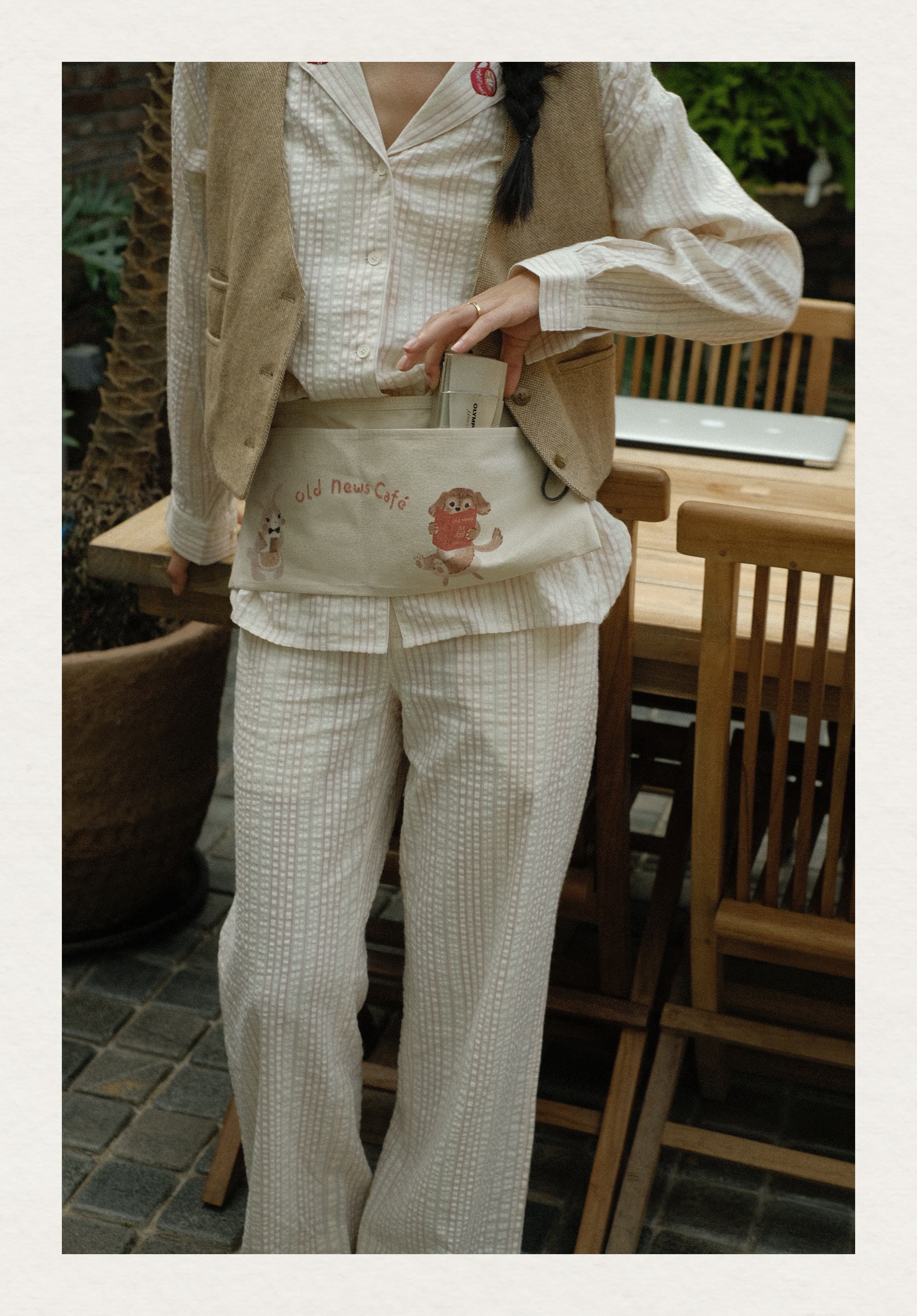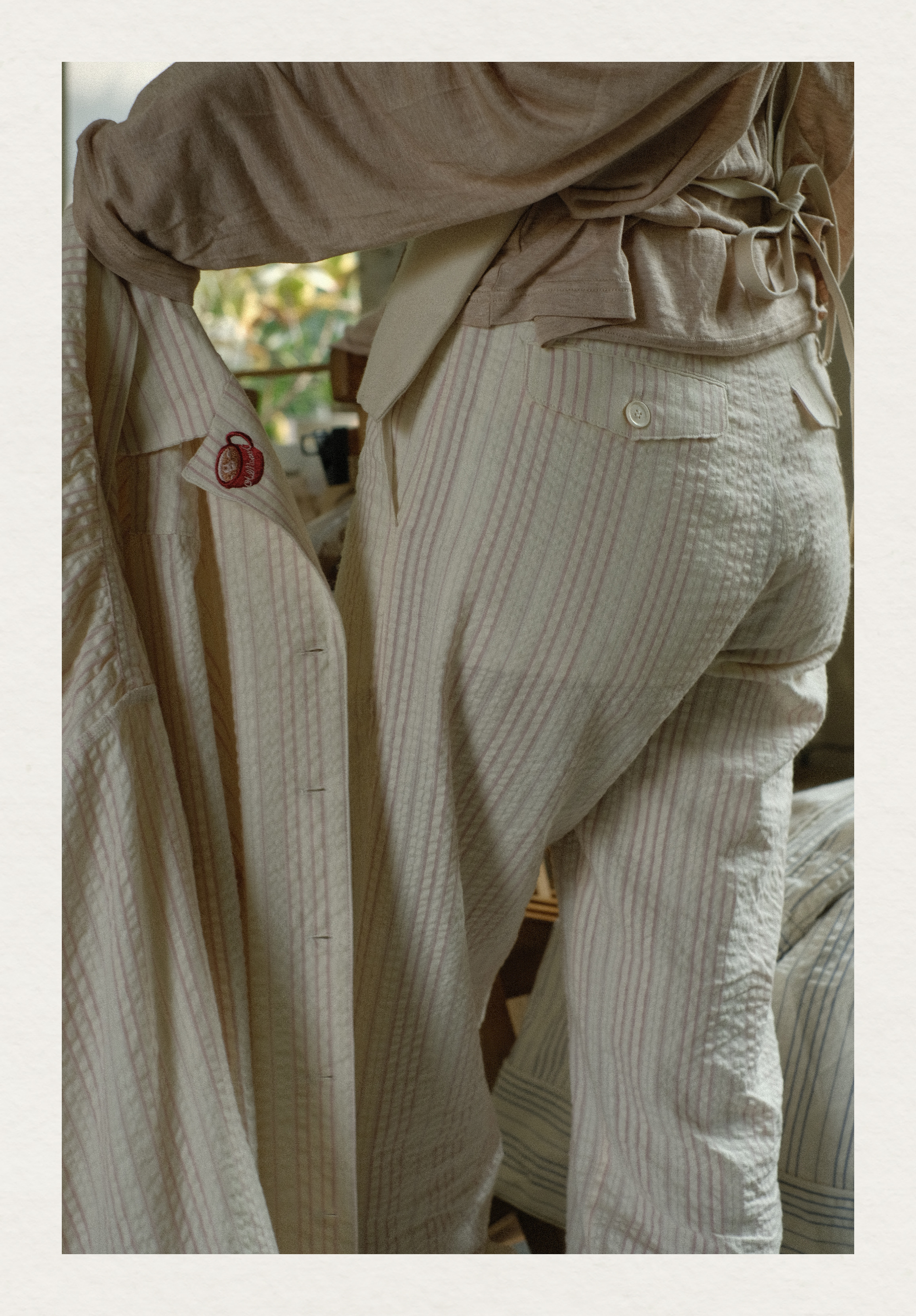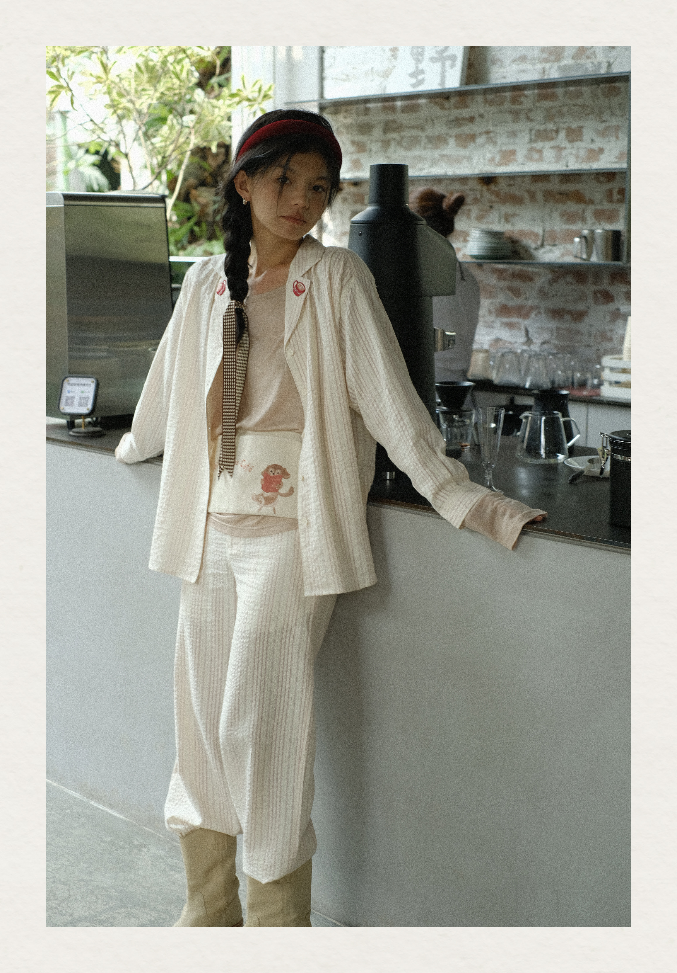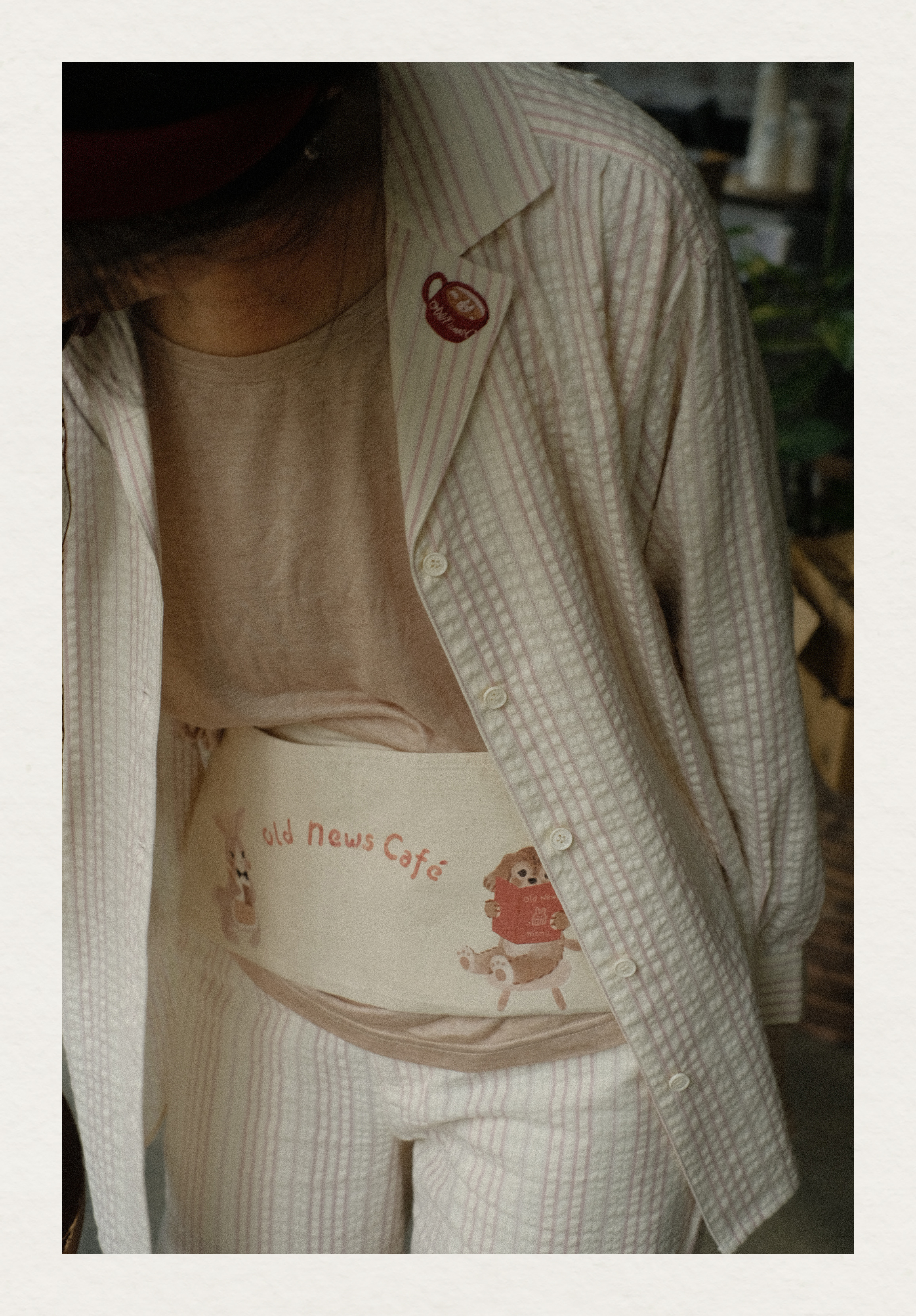 「Bunny Café」粉色条纹小兔咖啡杯刺绣衬衫套装