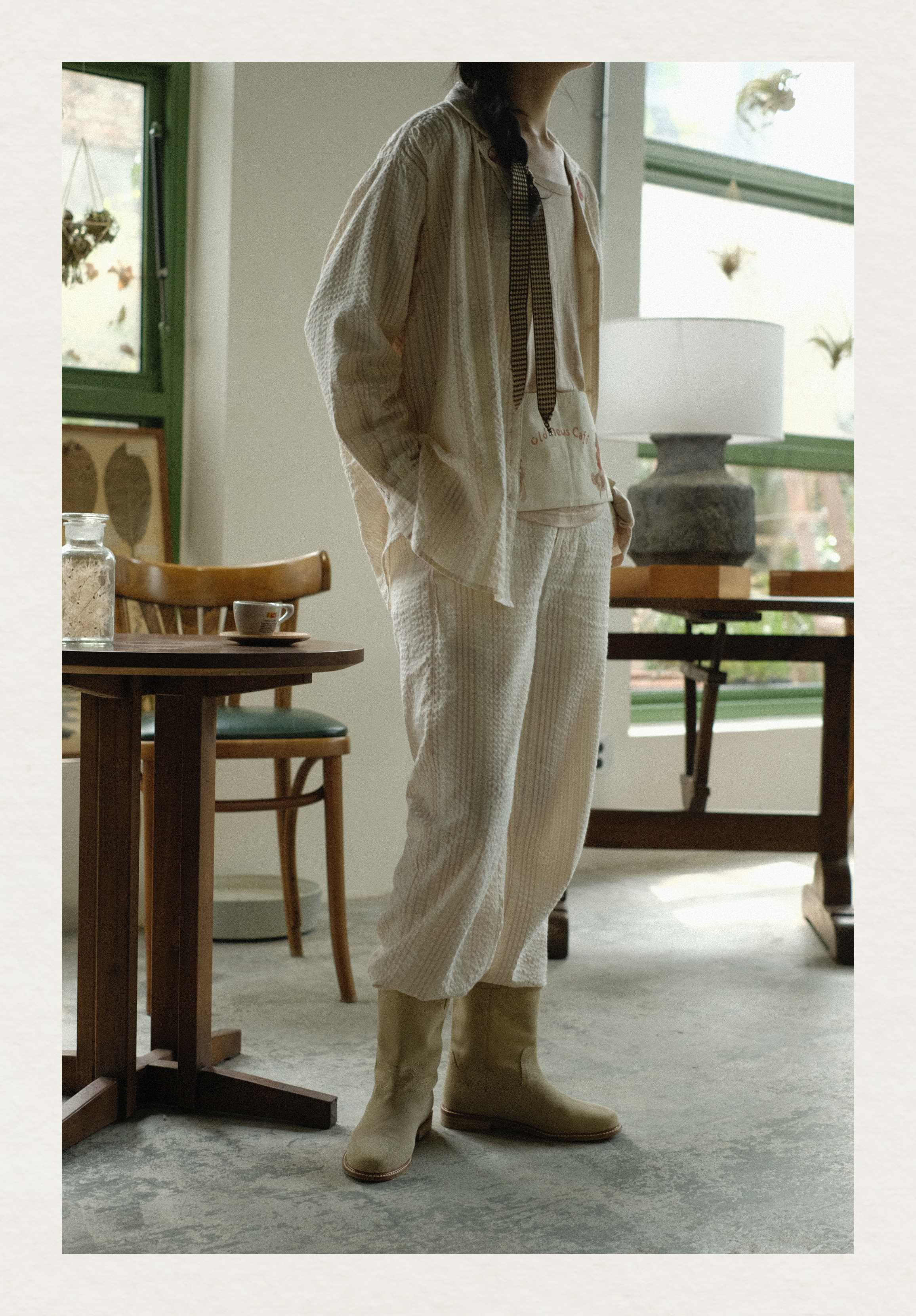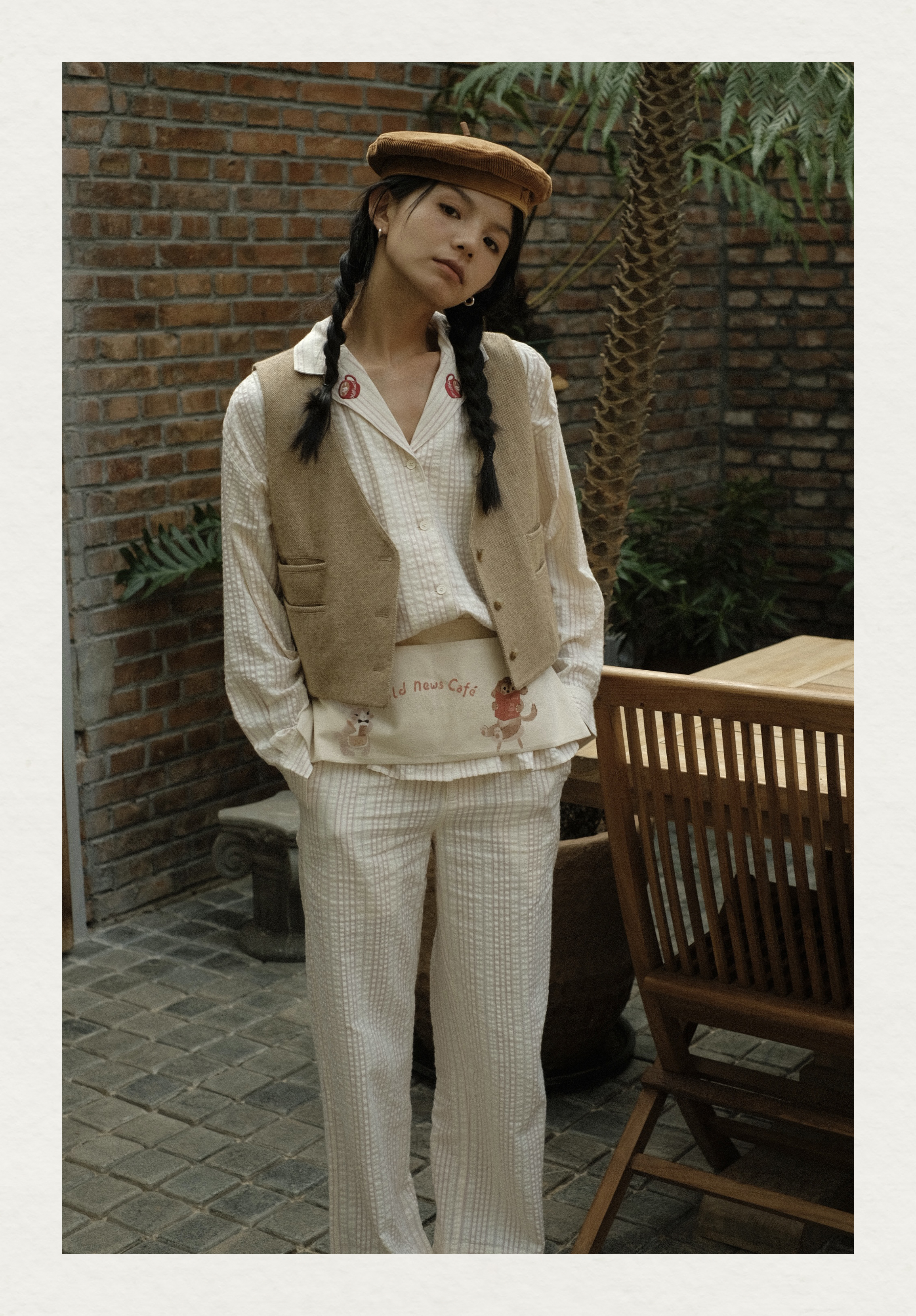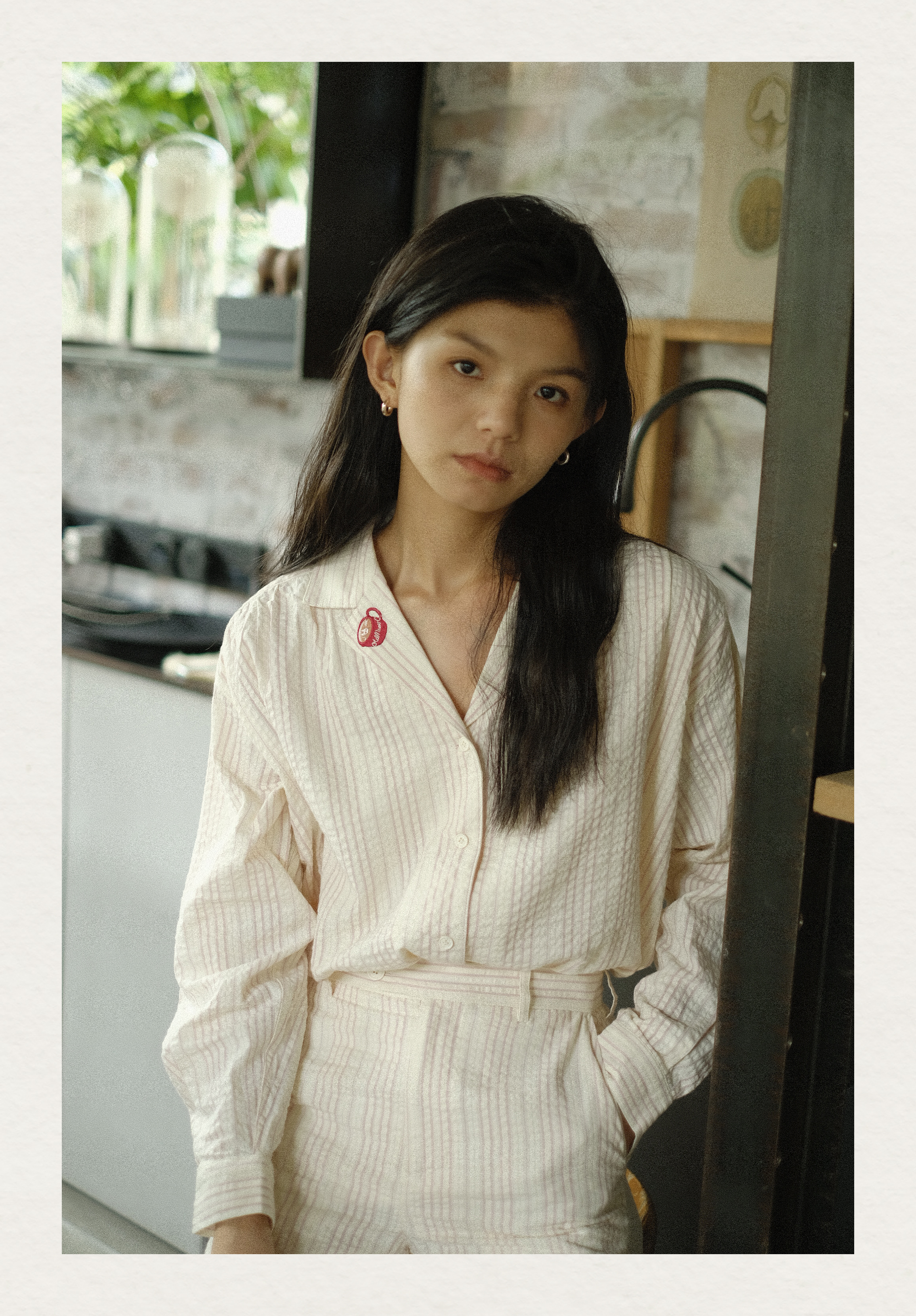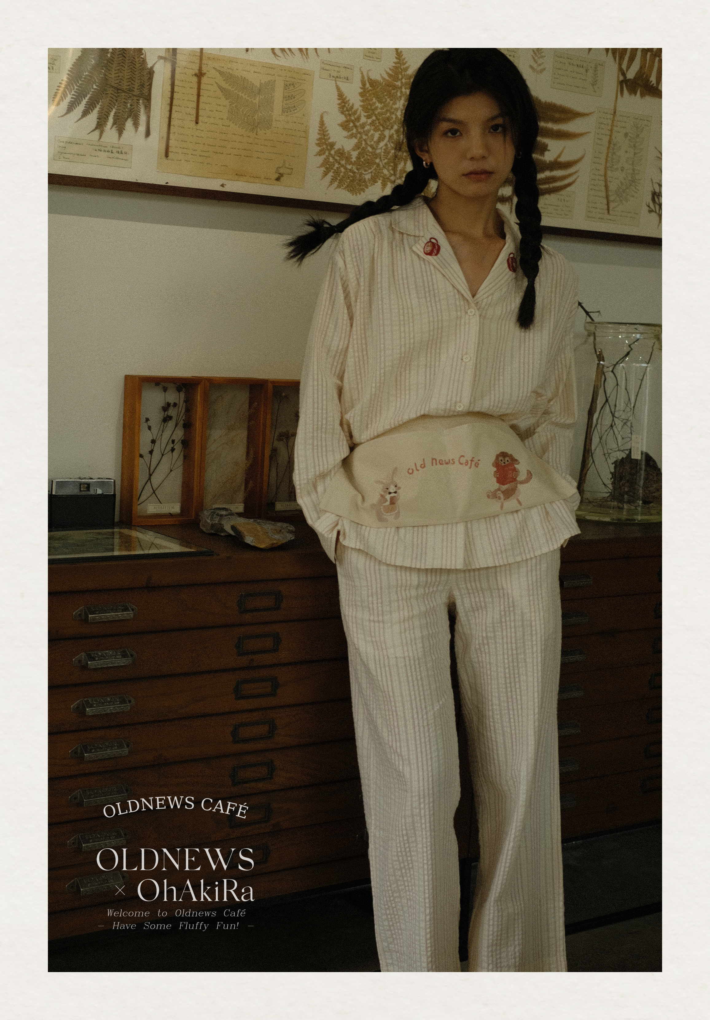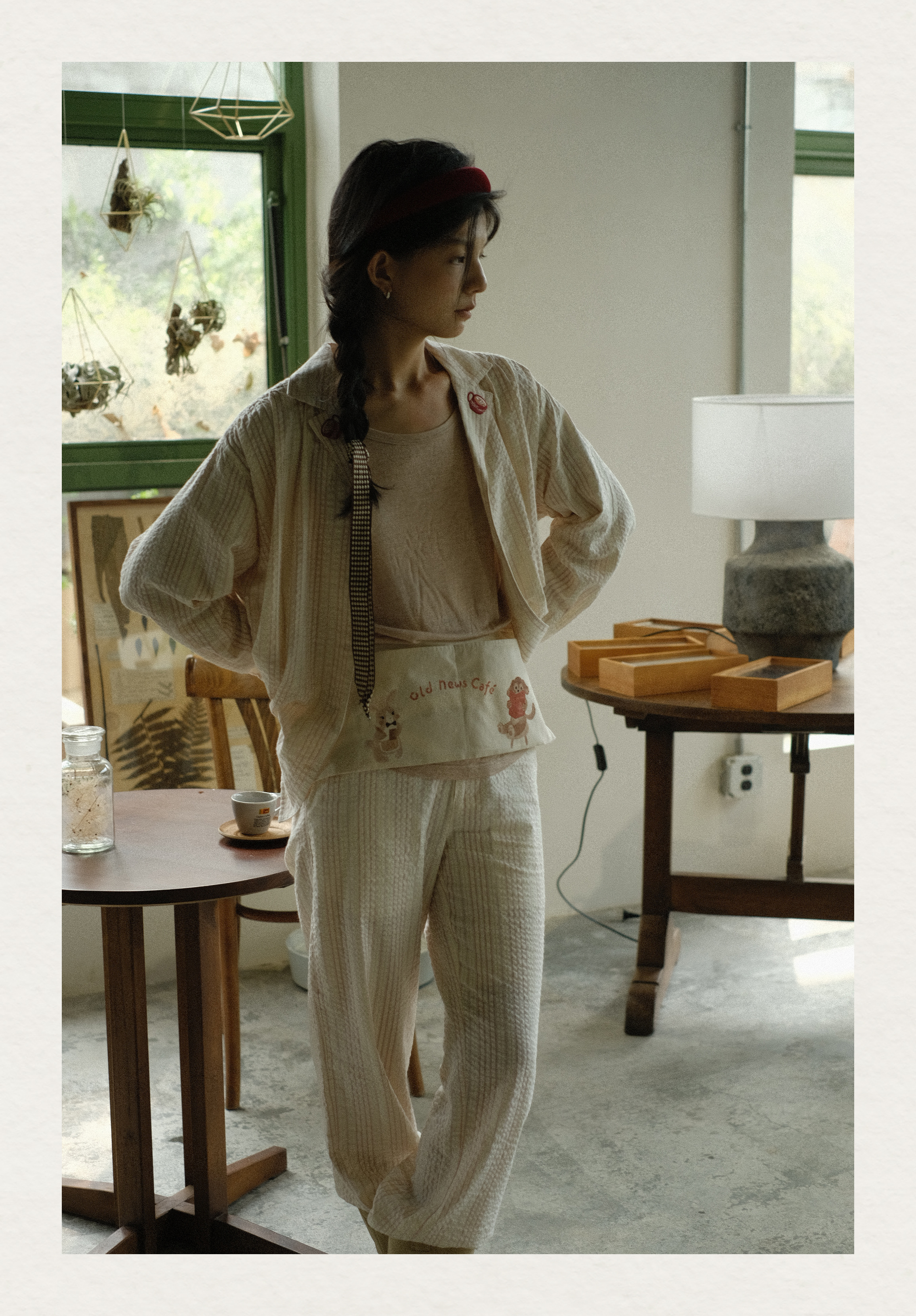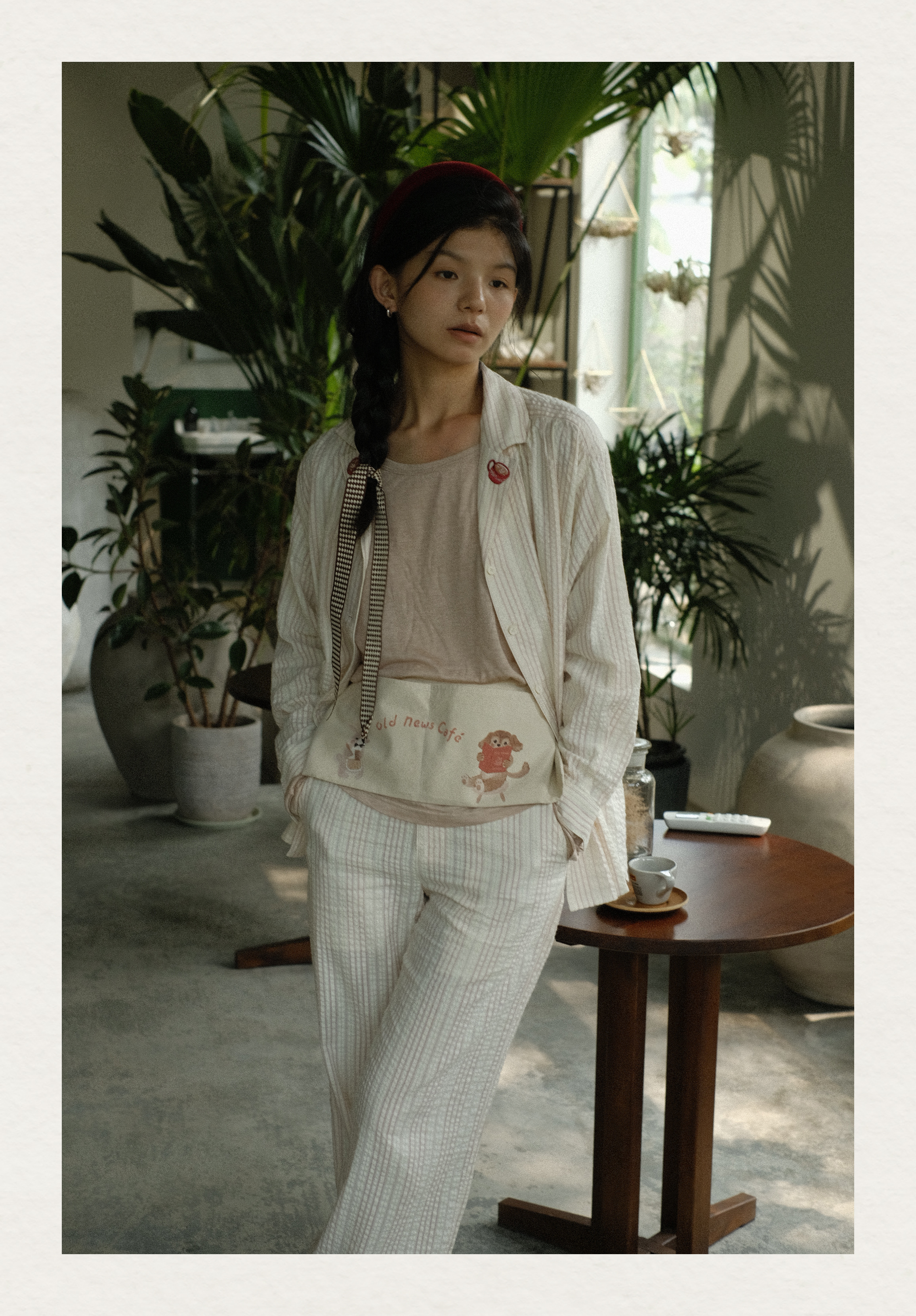 「Bunny Café」粉色条纹小兔咖啡杯刺绣衬衫套装