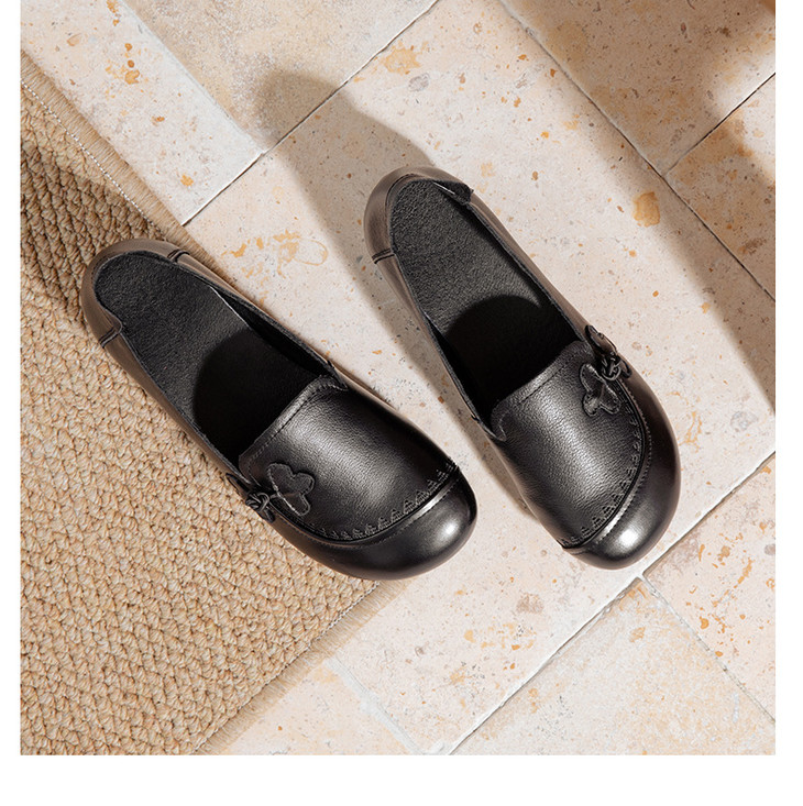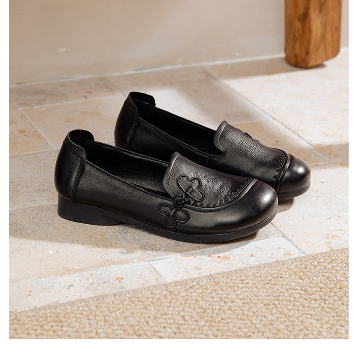 真皮圆头复古妈妈单鞋,民族风舒适平跟牛筋软底老人鞋MLD8583