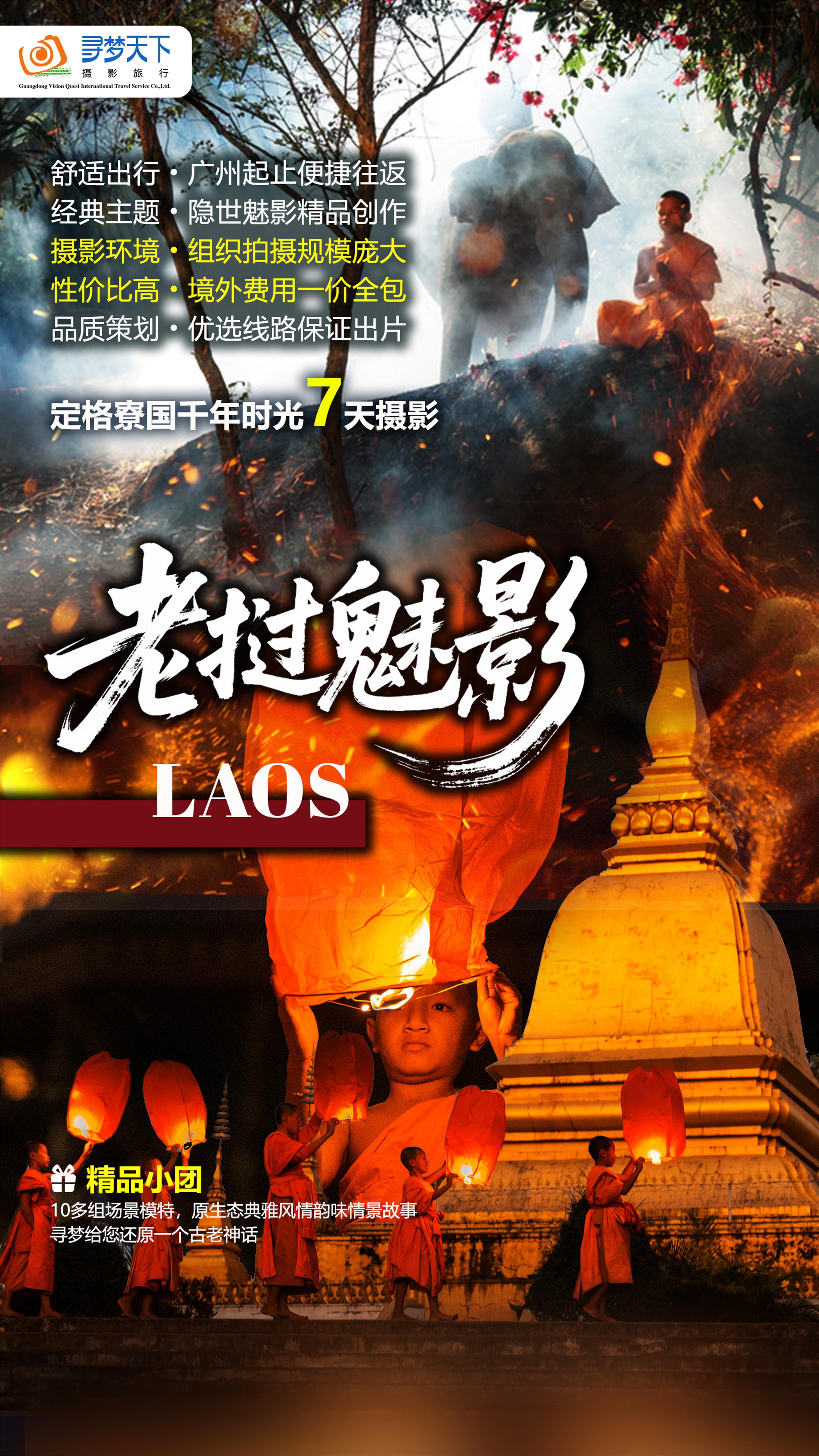 拍摄计划:早上约5点半出发寺院拍摄千年布施全过程(僧侣起床-晨钟-化缘-回寺),清晨的布施开始,你的快门根本就停不下来:每天清晨时分,穿着橘红色僧袍的僧侣们便会缓缓走在大街小巷中,等待虔诚的人们布施;之后约7点半出发拍摄水中镜月禅意大象与僧侣,美女创作(约1名模特和3名僧侣);下午时分拍摄剧情人像农家传统《舀米》和东南亚特色剧情环境人像老挝少女(约模特2名、摄影辅助团队约2-3名人员);