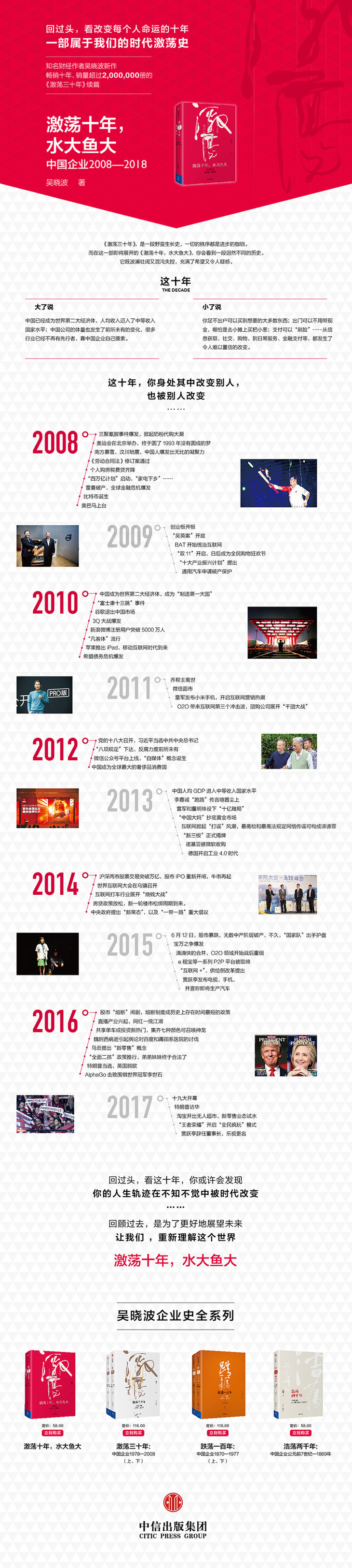 作为时代记录者,吴晓波有意识地从1978年中国改革开放伊始,记录中国翻天覆地的变化和对我们影响至深的人物与事件,串成一部我们每个人的时代激荡史。而最新的这十年,无疑更壮观,也更扑朔迷离。
