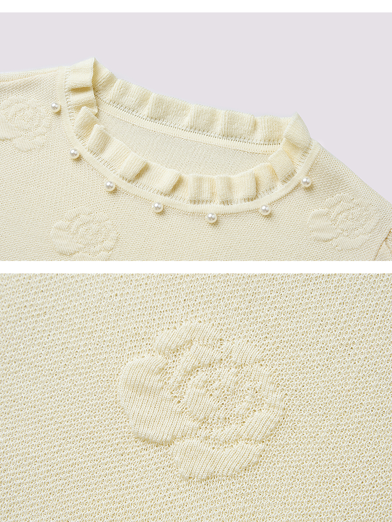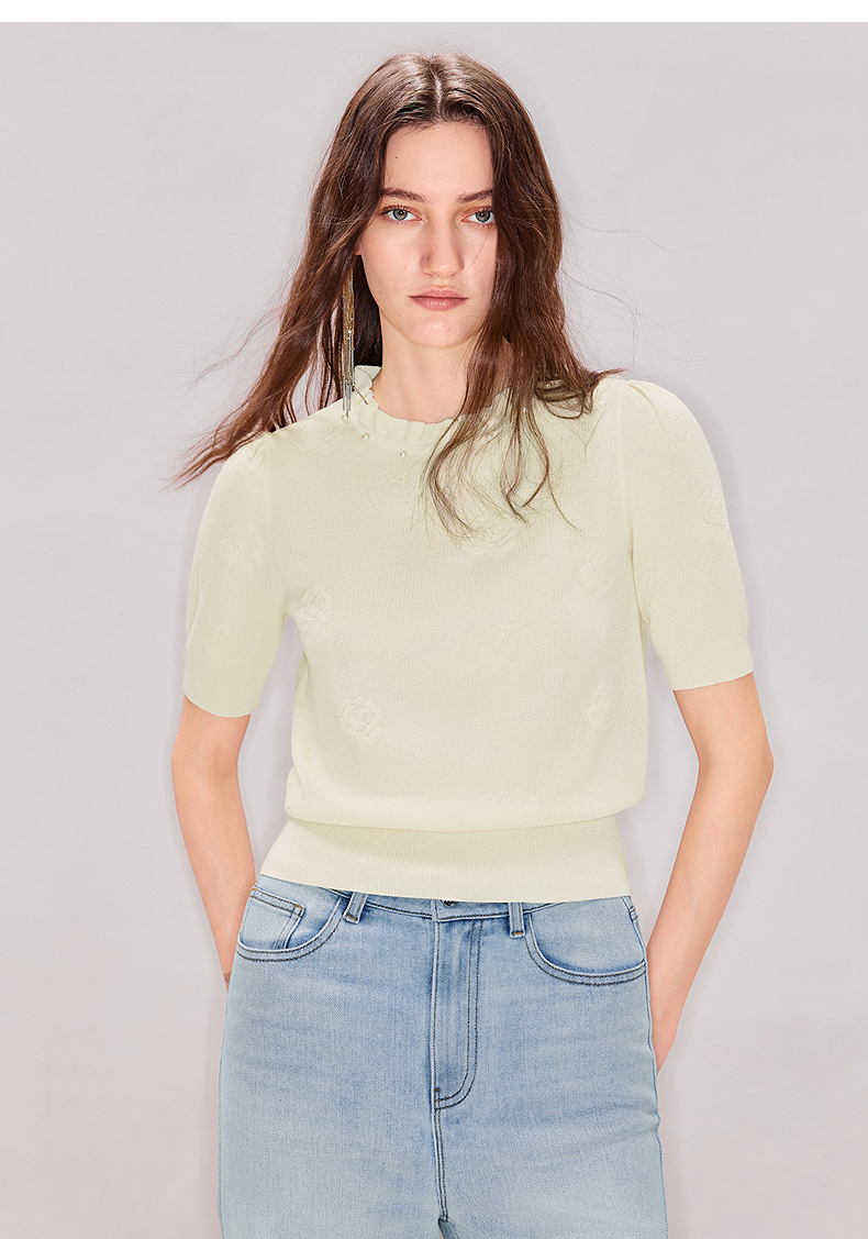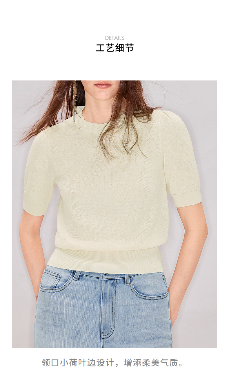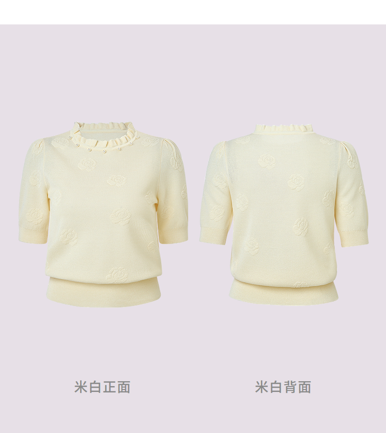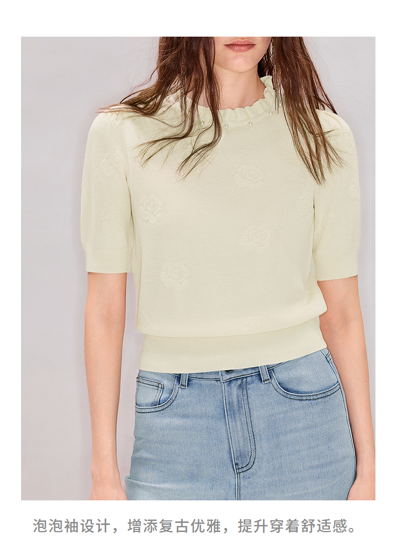 MAXRIENY宫廷风玫瑰提花针织衫26春季新款套头仿珍珠圆领短袖针织(货号:MF80SW007)