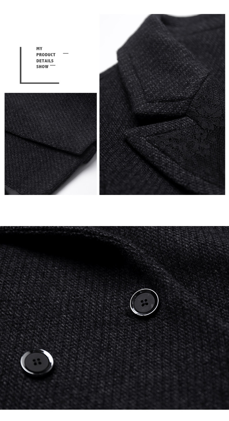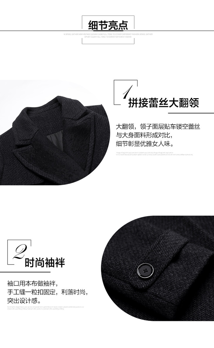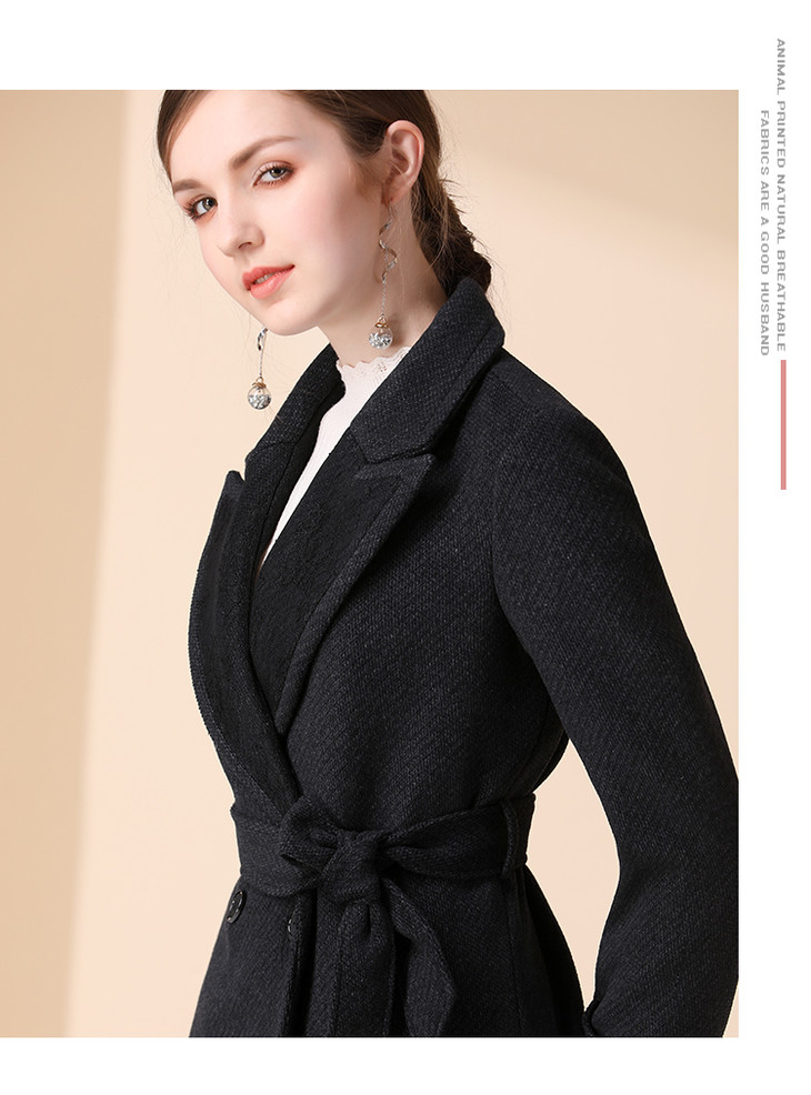 洛诗琳黑色毛呢大衣中长款拼接大翻领女士收腰外套冬季新款