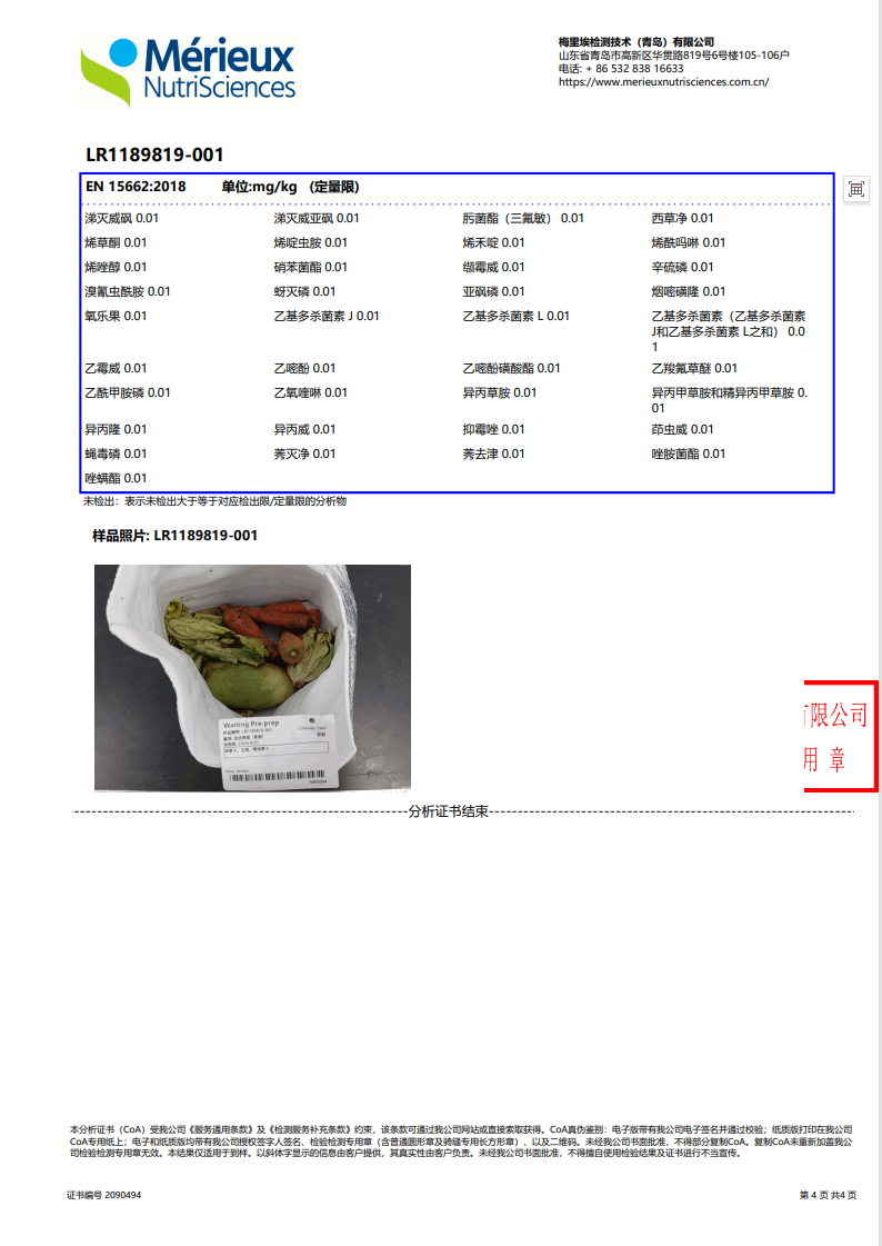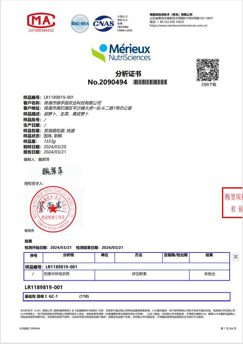 蔬菜上架前,绿家也送检了第三方机构,检测287项农残(无检出)。