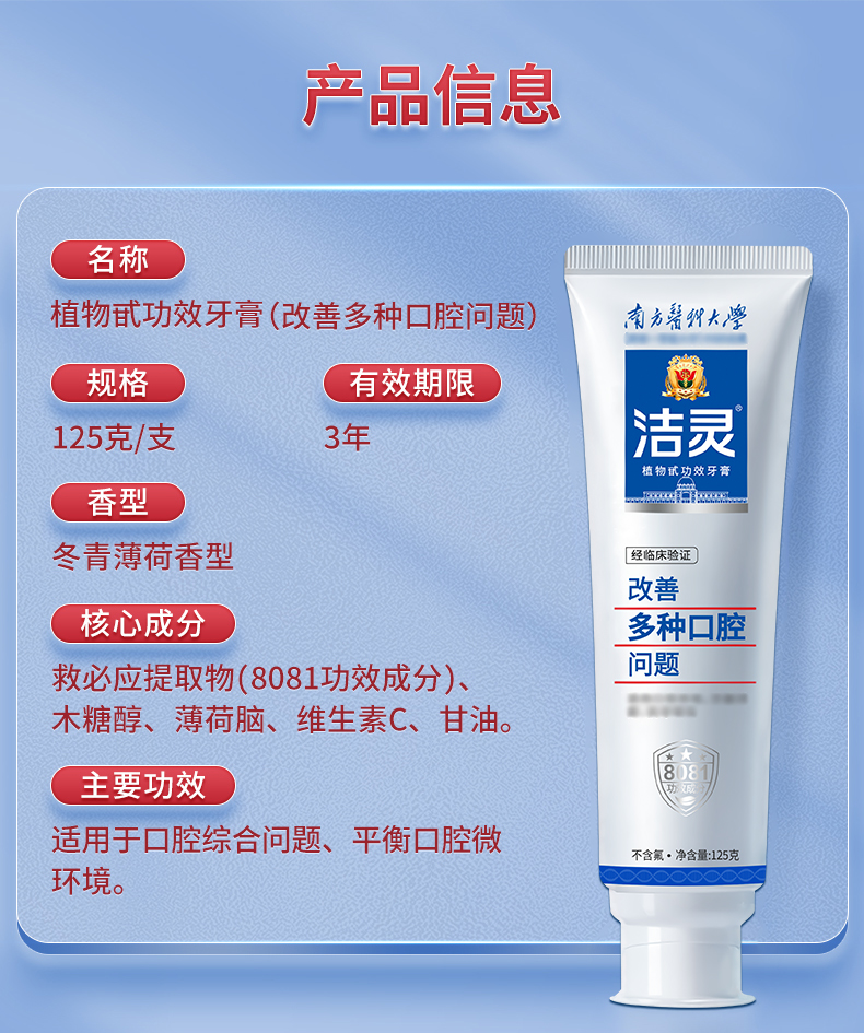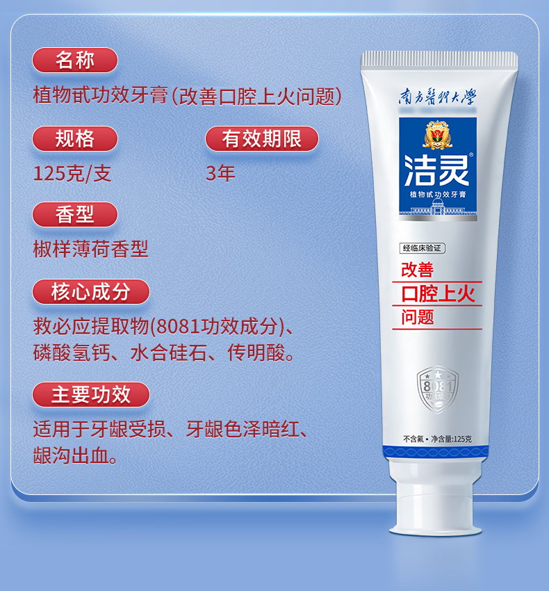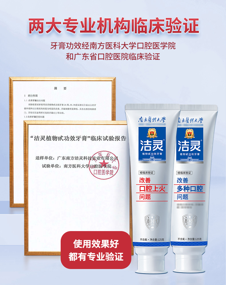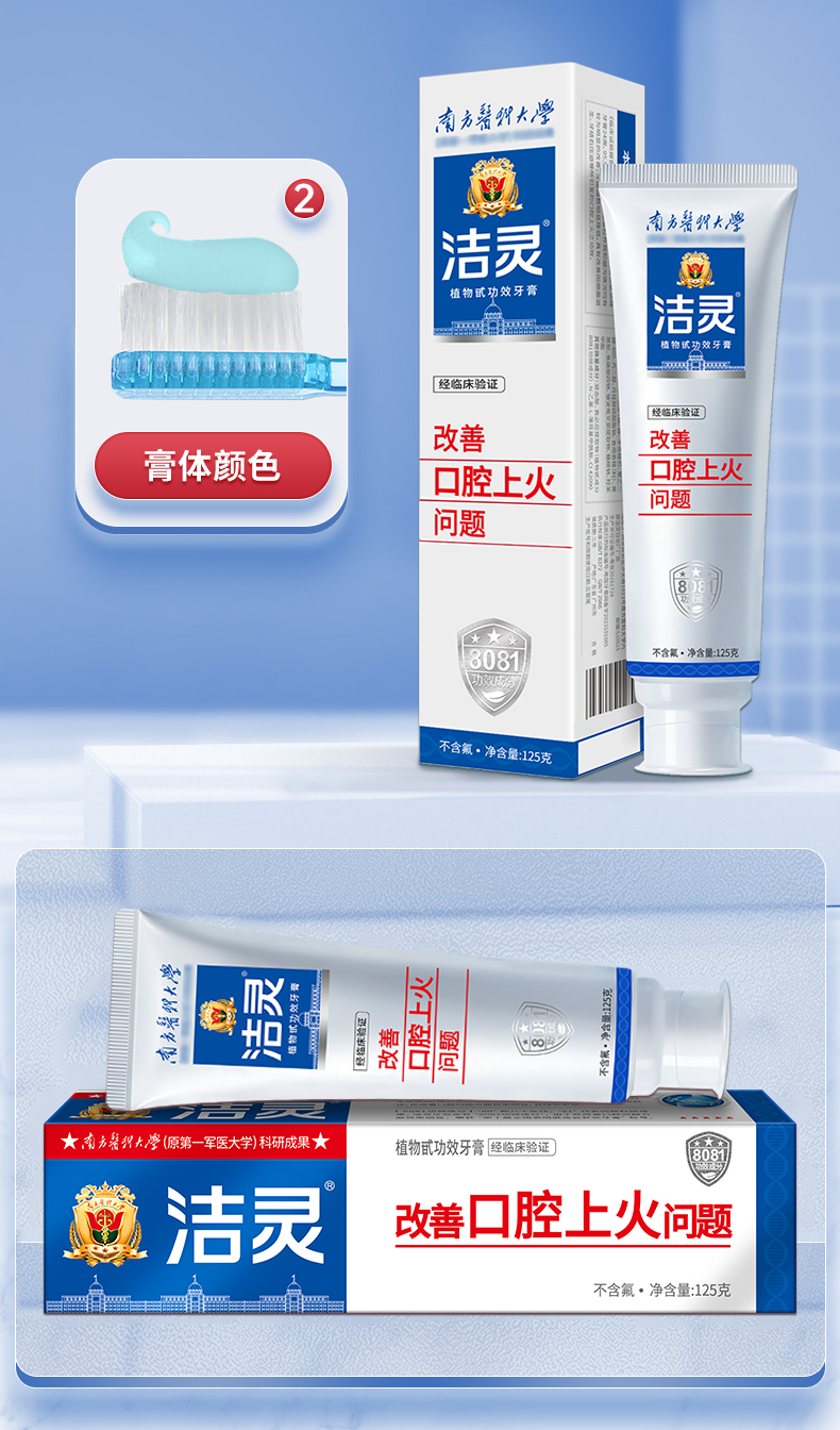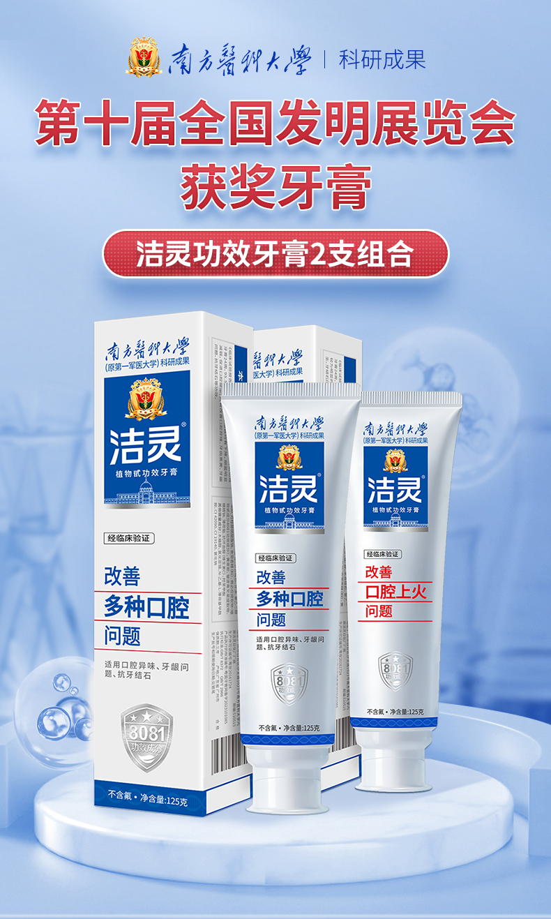 - 洁灵牙膏,由南方医科大学研制,牙膏的核心8081功效成分效果出众,在第十届全国发明展览会成为获奖牙膏。