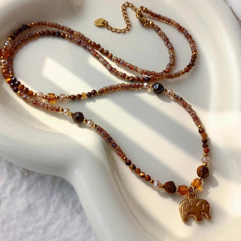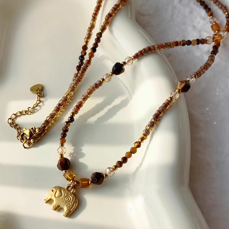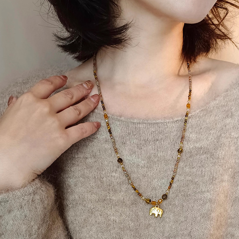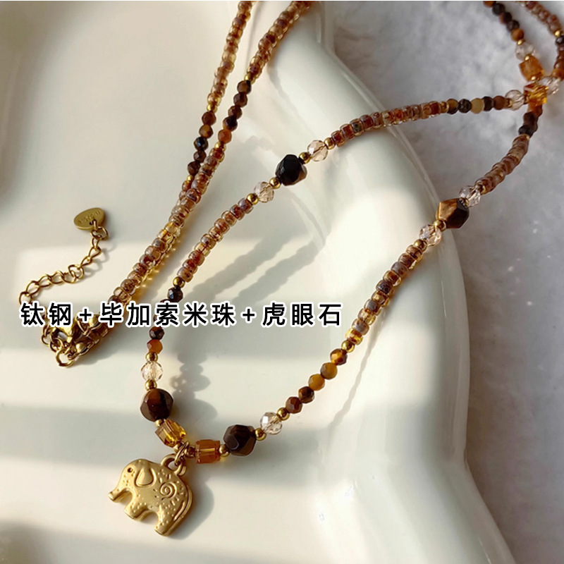 雀说 咖色小象串珠虎眼石项链轻奢小众高级感气质长款高档毛衣链配饰NK433