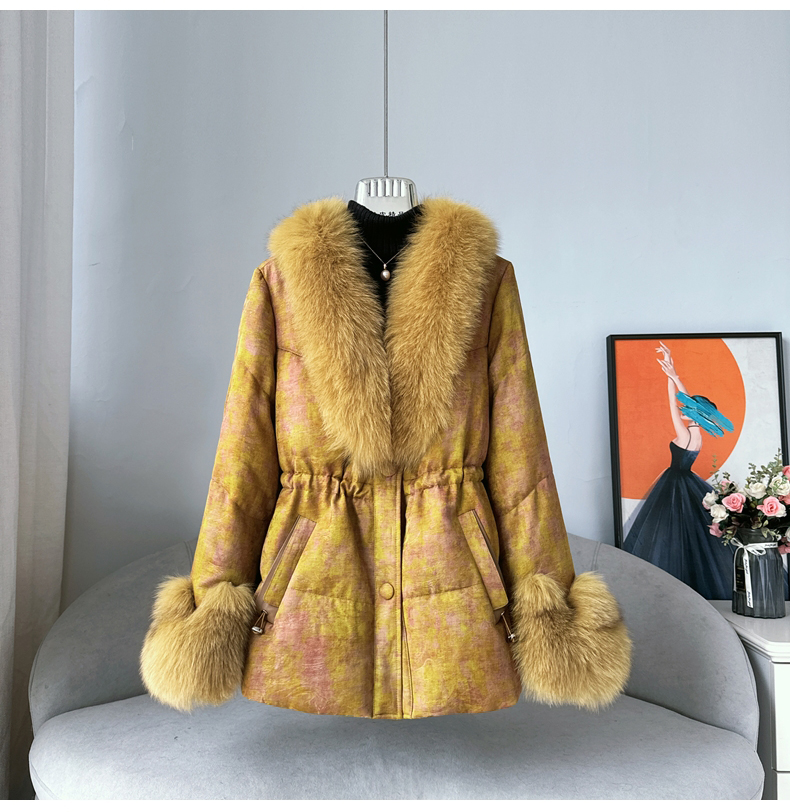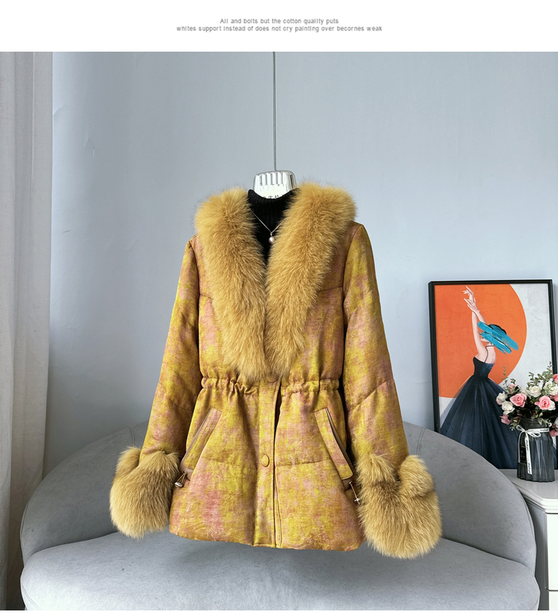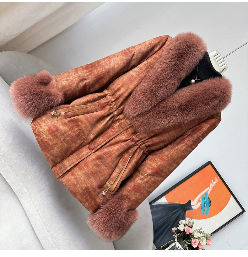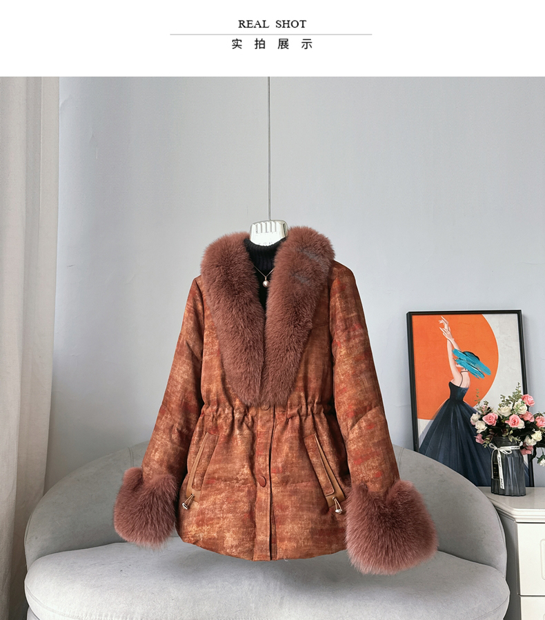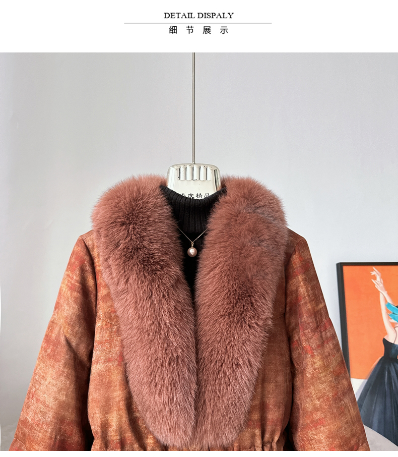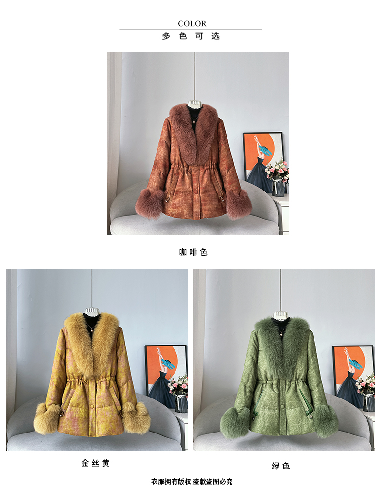 SR 266329狐狸毛皮草中长款显瘦白鹅羽绒服外套国风提花