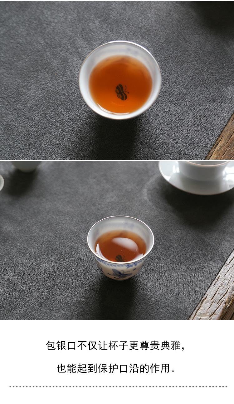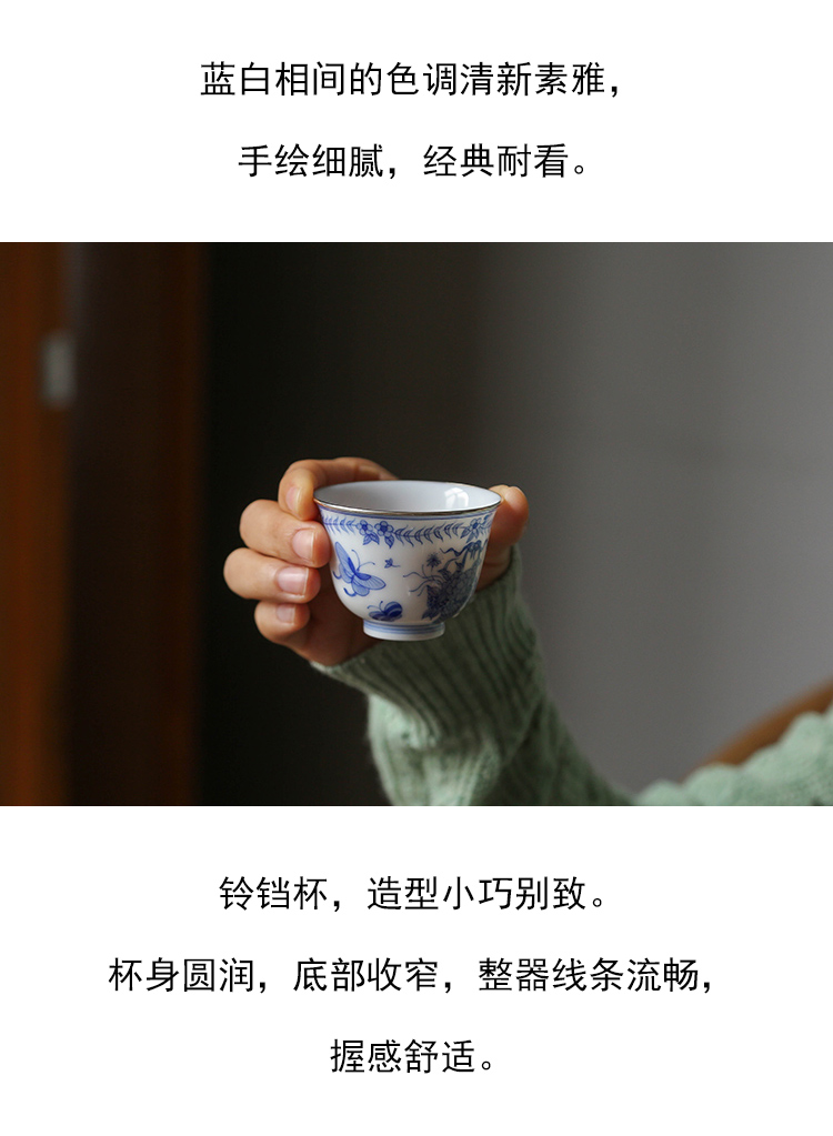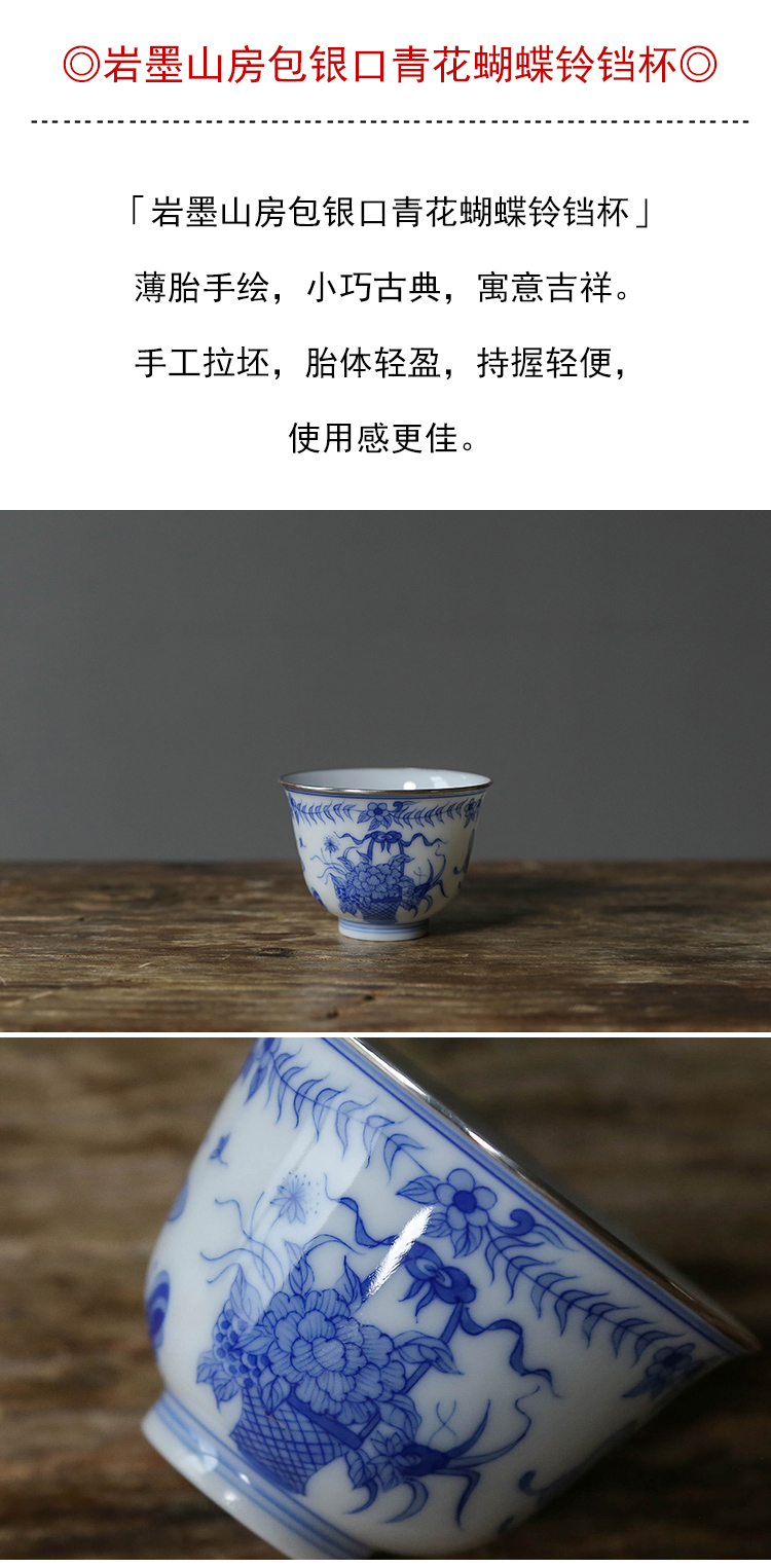 茶香记 岩墨山房包银口青花蝴蝶铃铛杯50ml陶瓷手绘茶杯主人杯