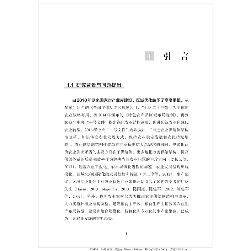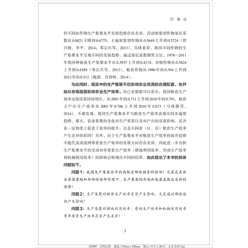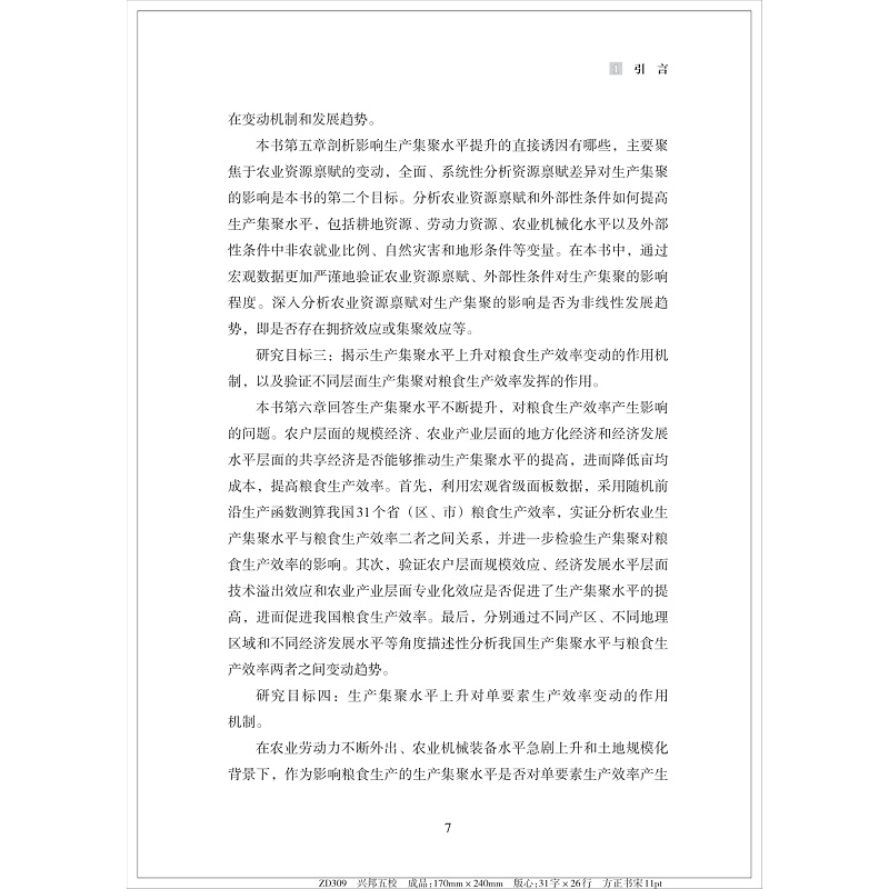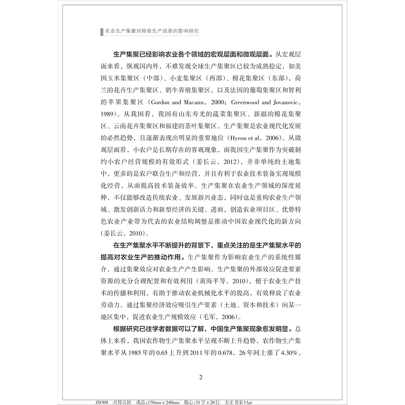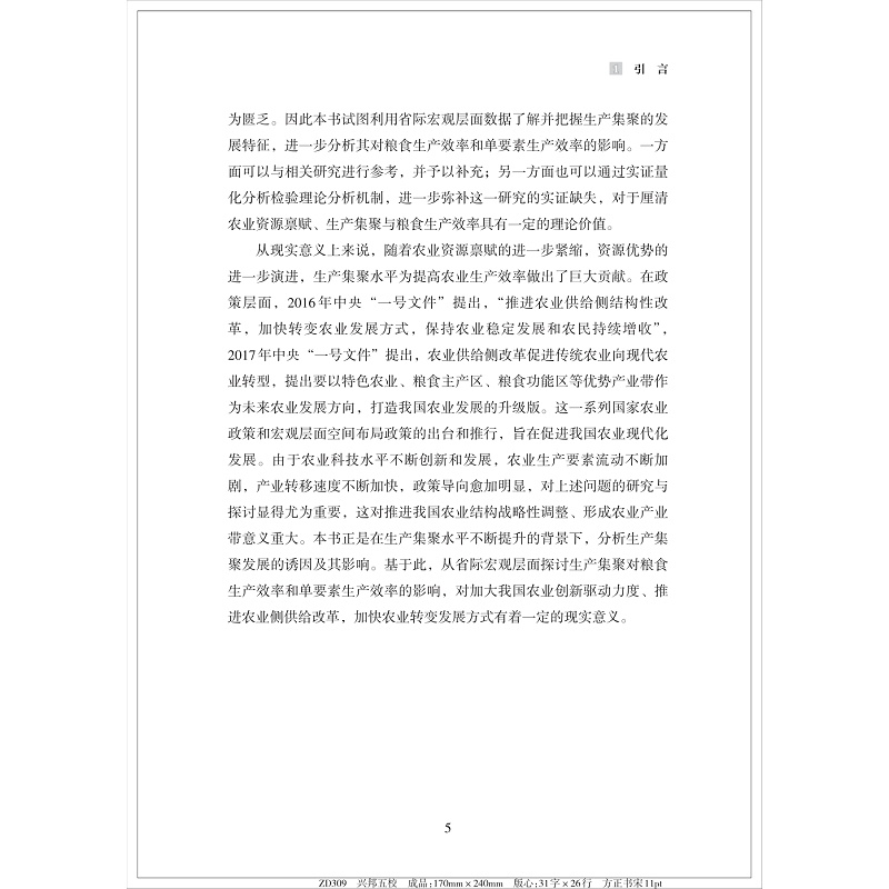 本书为教育部青年项目研究成果。本书利用1996—2015年省际面板数据,从生产集聚视角切入,在计量模型设定上采用多种手法进行分析,尽可能剔除模型中的内生性问题,通过系统性的理论和实证分析,深入研究了生产集聚水平对粮食生产效率的影响,并阐述了粮食生产效率区域异质性的原因。为促进我国粮食生产,提高粮食生产效率,保障国家粮食安全制定相关政策提供科学决策依据。