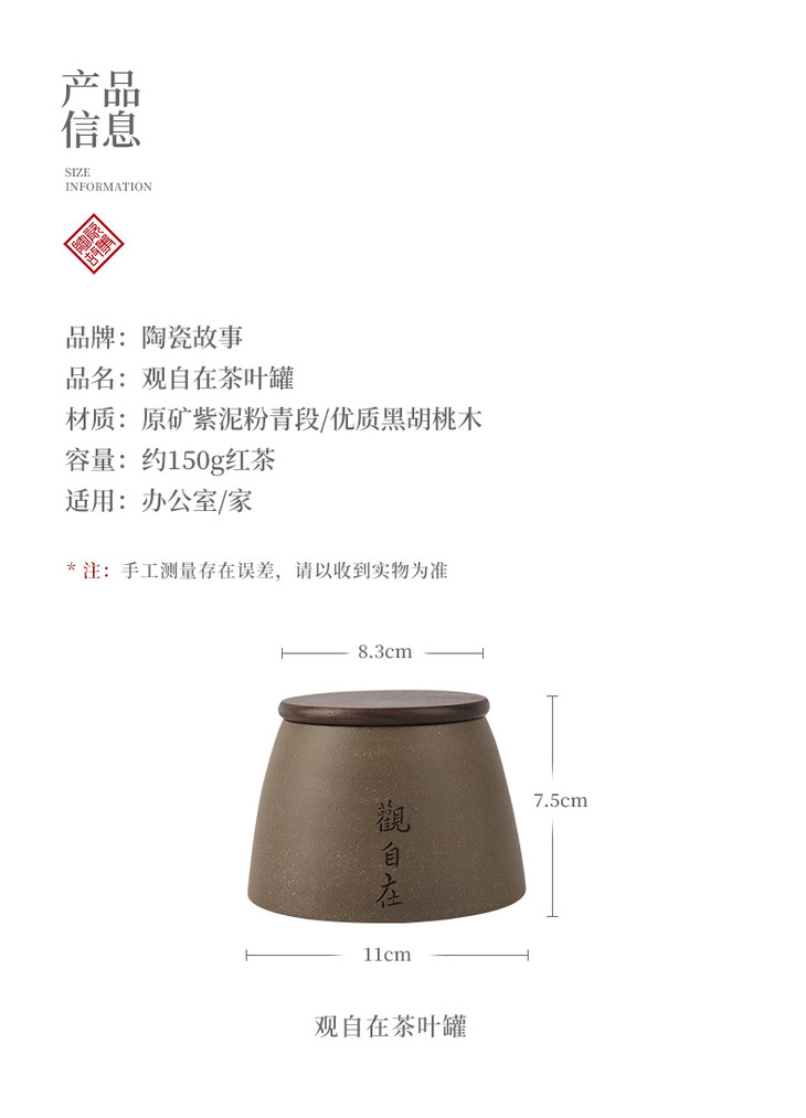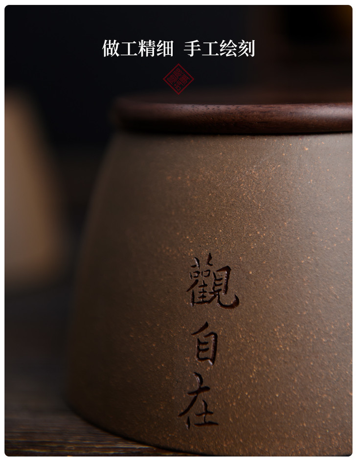 紫砂-宜兴紫泥茶叶罐观自在-黑胡桃木盖