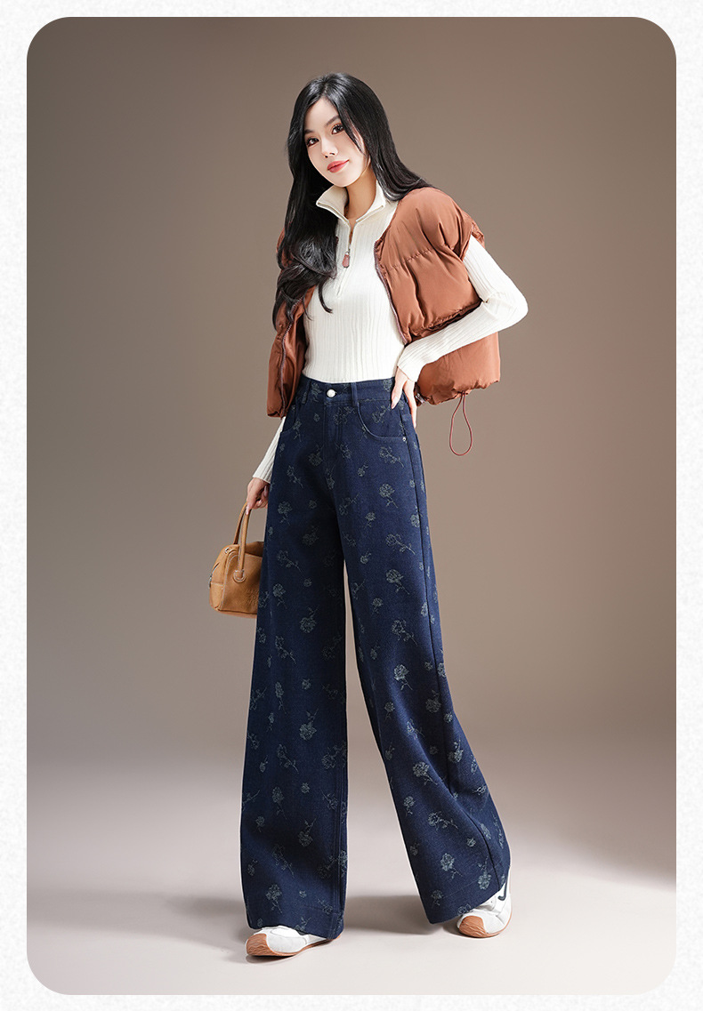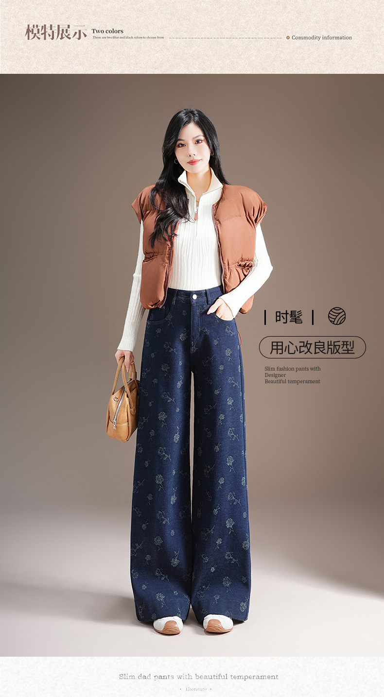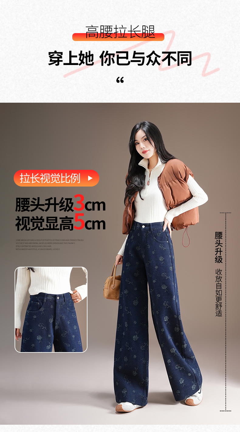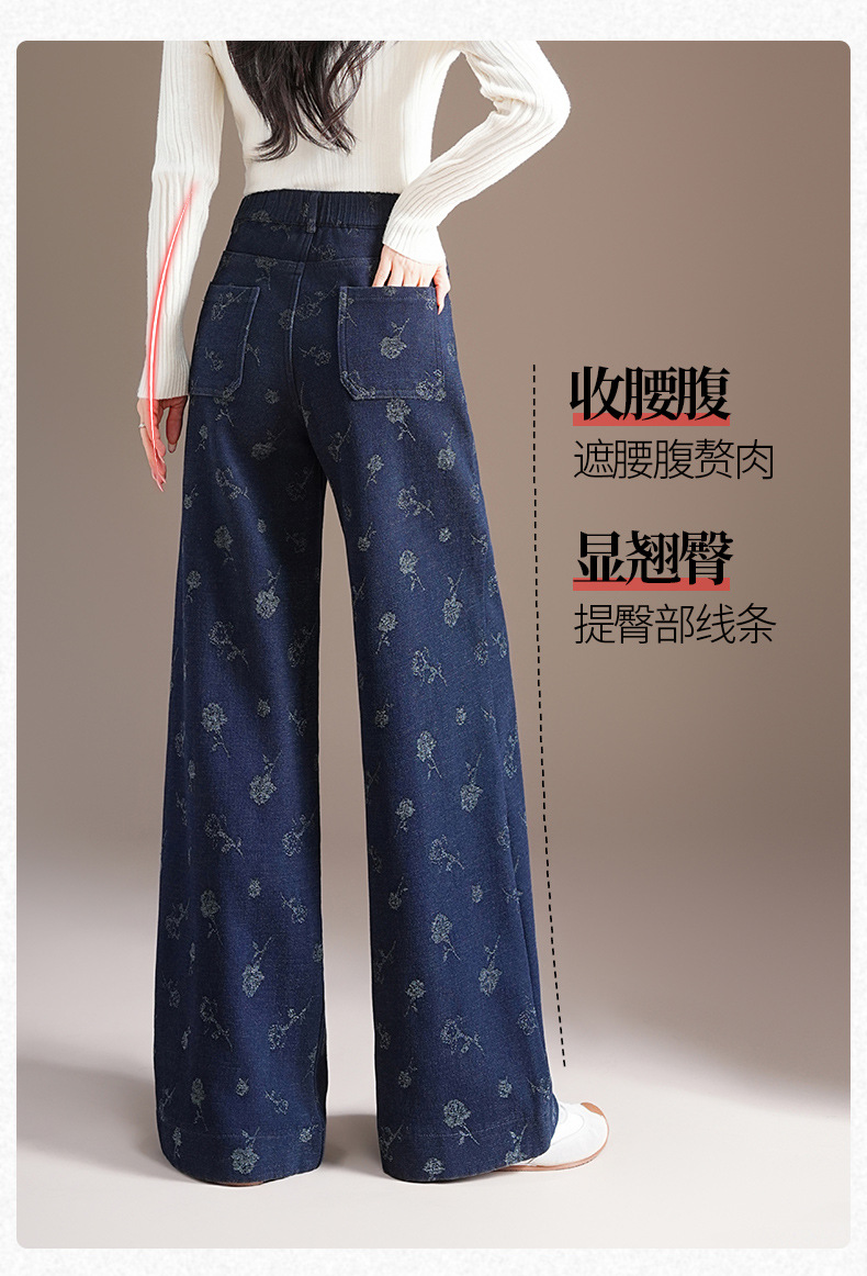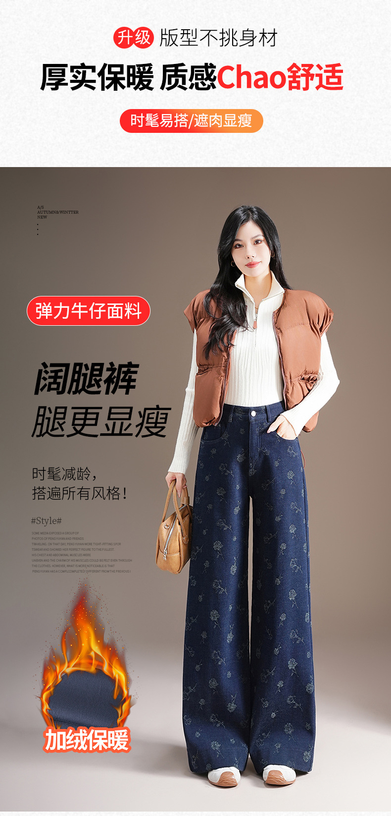 MYX印花牛仔阔腿裤垂坠感修身显瘦直筒裤2025年冬款加绒保暖拖地长裤