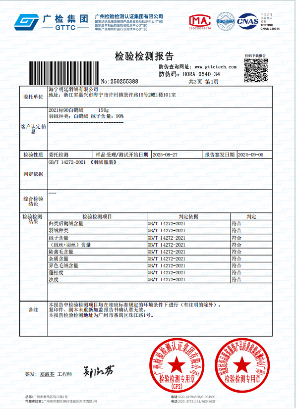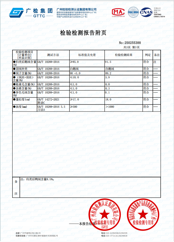 面料A:100%桑蚕丝 面料B:75%醋酸纤维 25%聚酯纤维 胆布:100%聚酯纤维 填充物:90白鹅绒(绒子含量88%)以上 充绒量:M码,110g;L码,115g;XL码,120g;XXL码,125g;XXXL码,130g