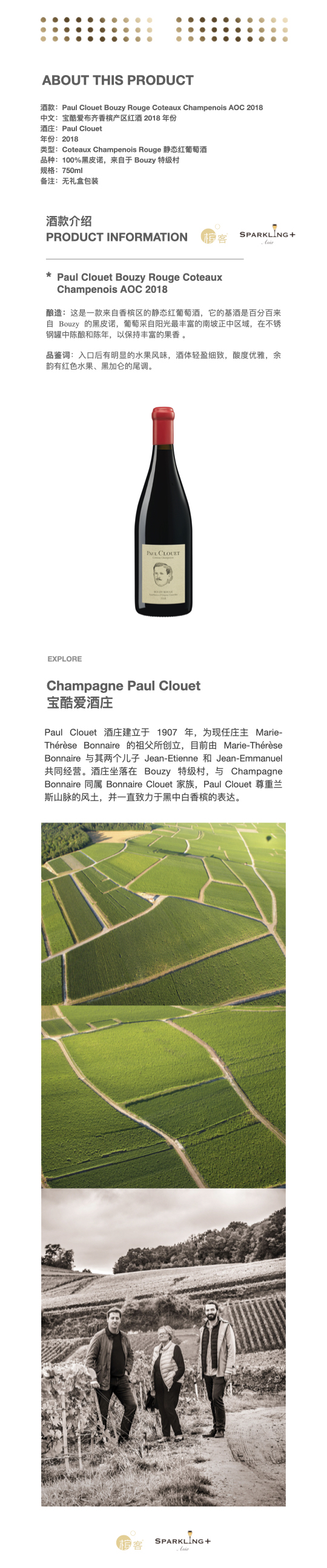 香槟区静态干红 · Paul Clouet Bouzy Rouge Coteaux Champenois AOC 宝酷爱布齐香槟产区红酒2015/2016/2018