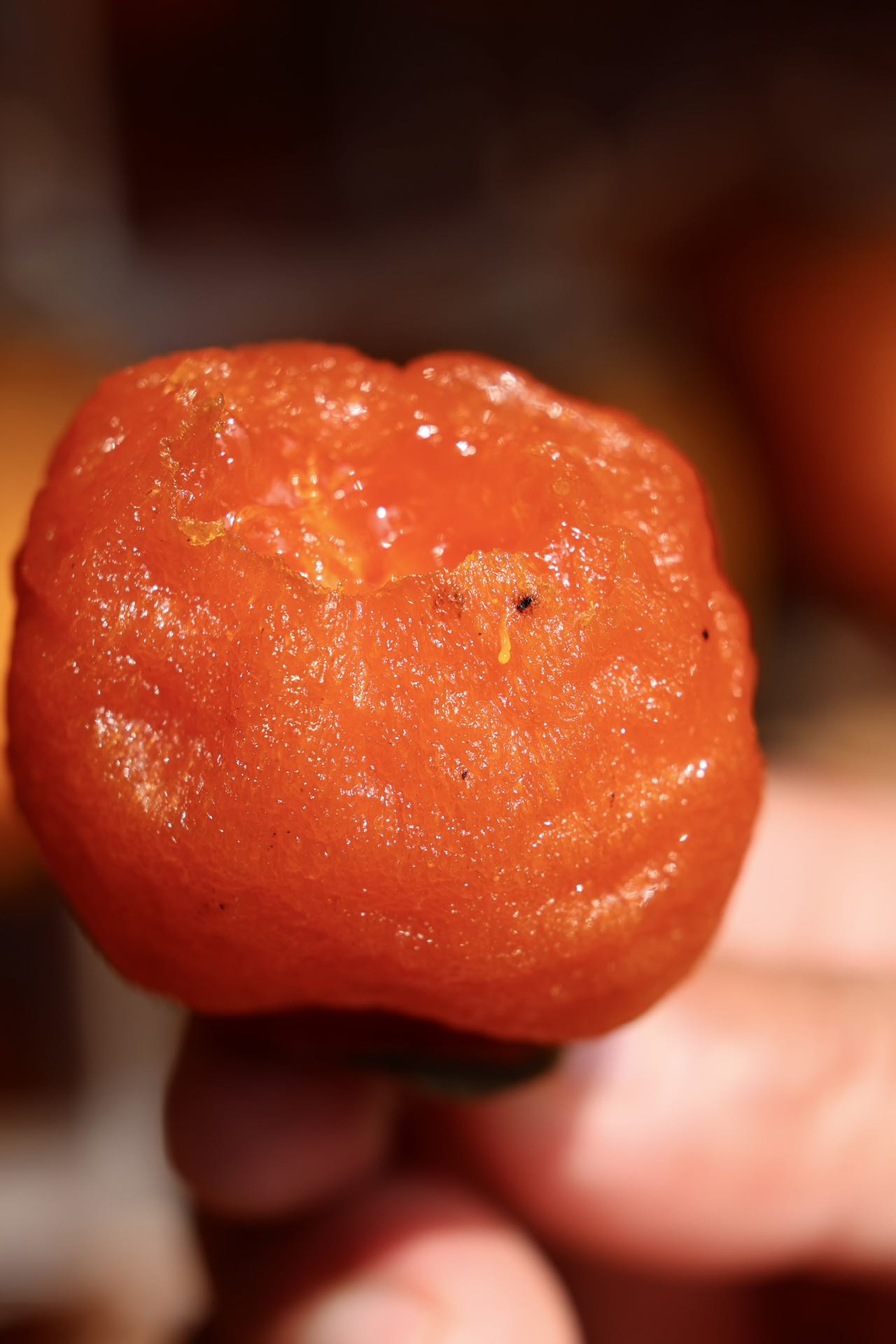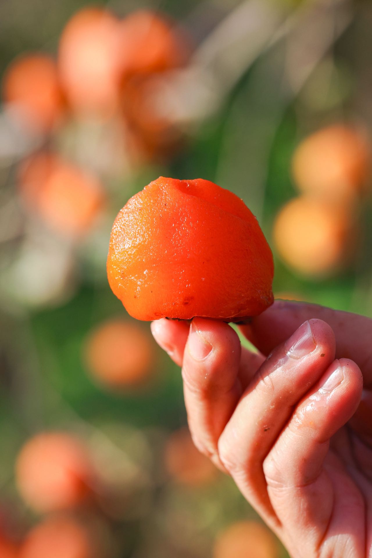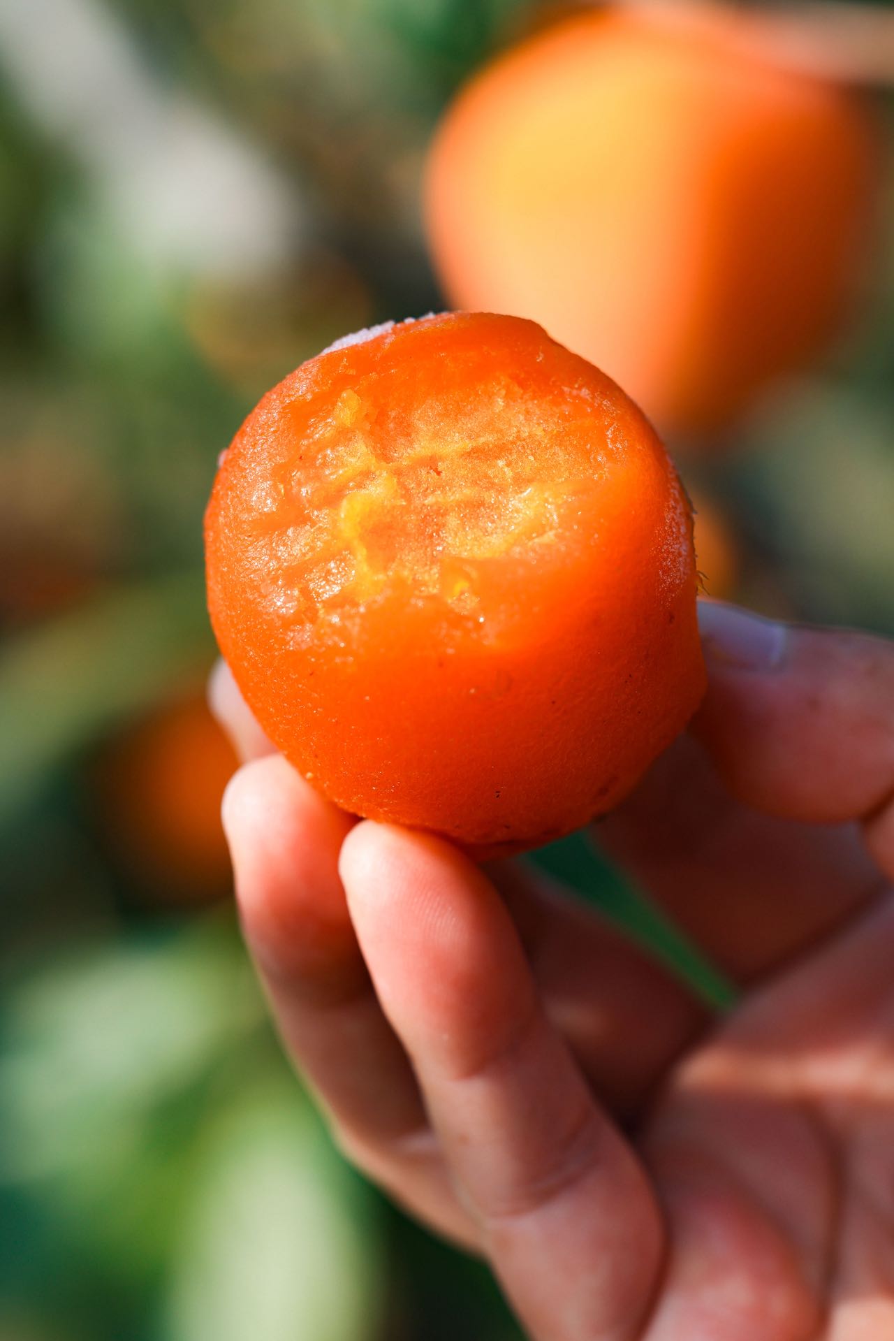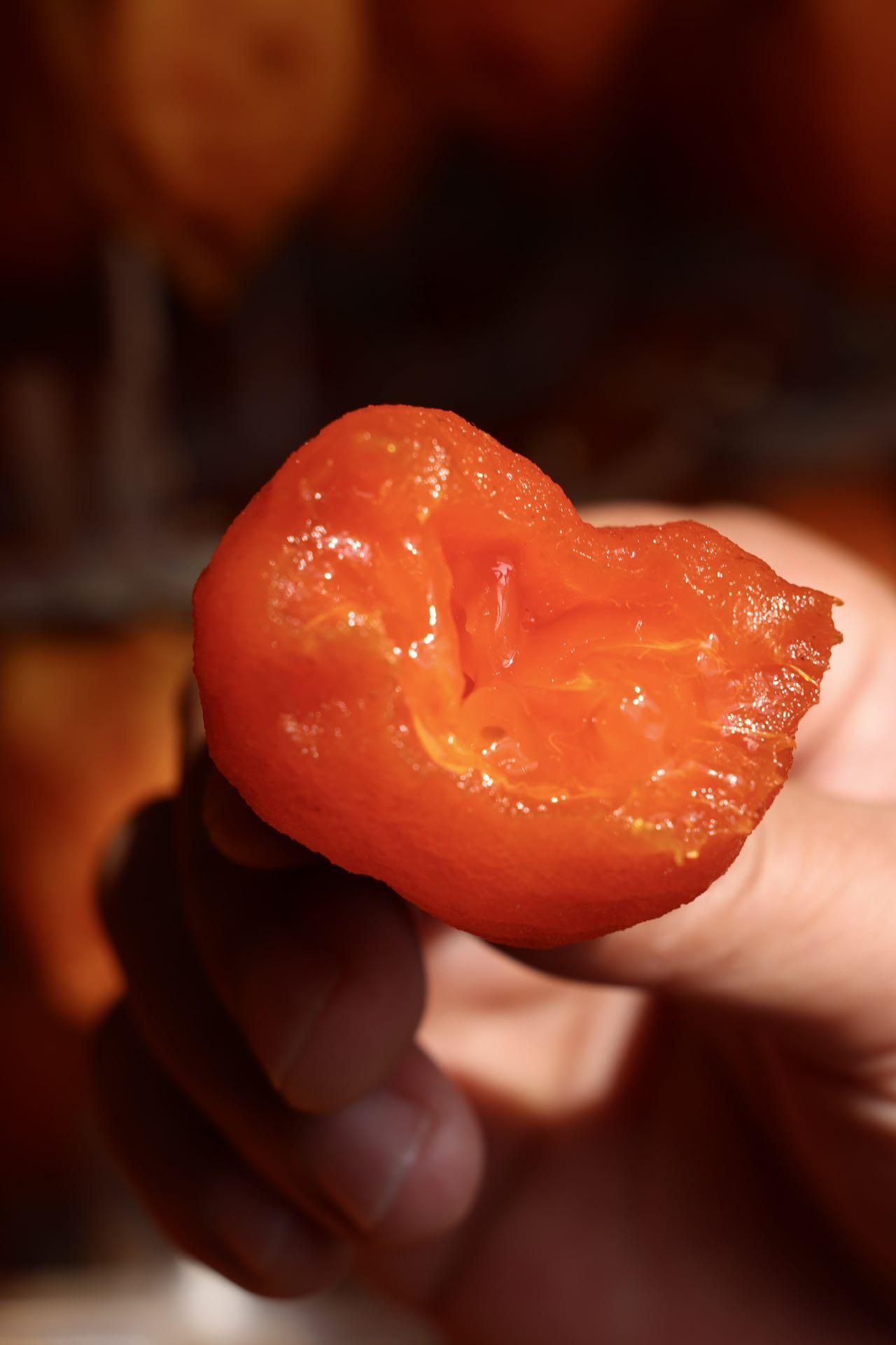 一果双魂,它的美妙,在于它巧妙地介于鲜柿的水润软糯和传统柿饼的蜜香筋道之间,尤其那口“冰凉沁人、绵密流心”的体验,让很多尝过的人印象深刻,给人一种层次丰富、循序渐进的独特口感体验——富平冰柿。
