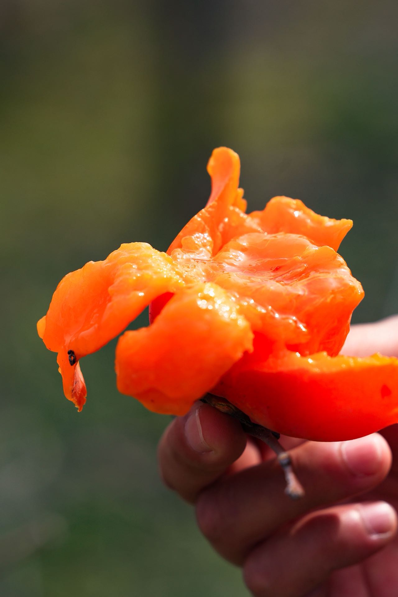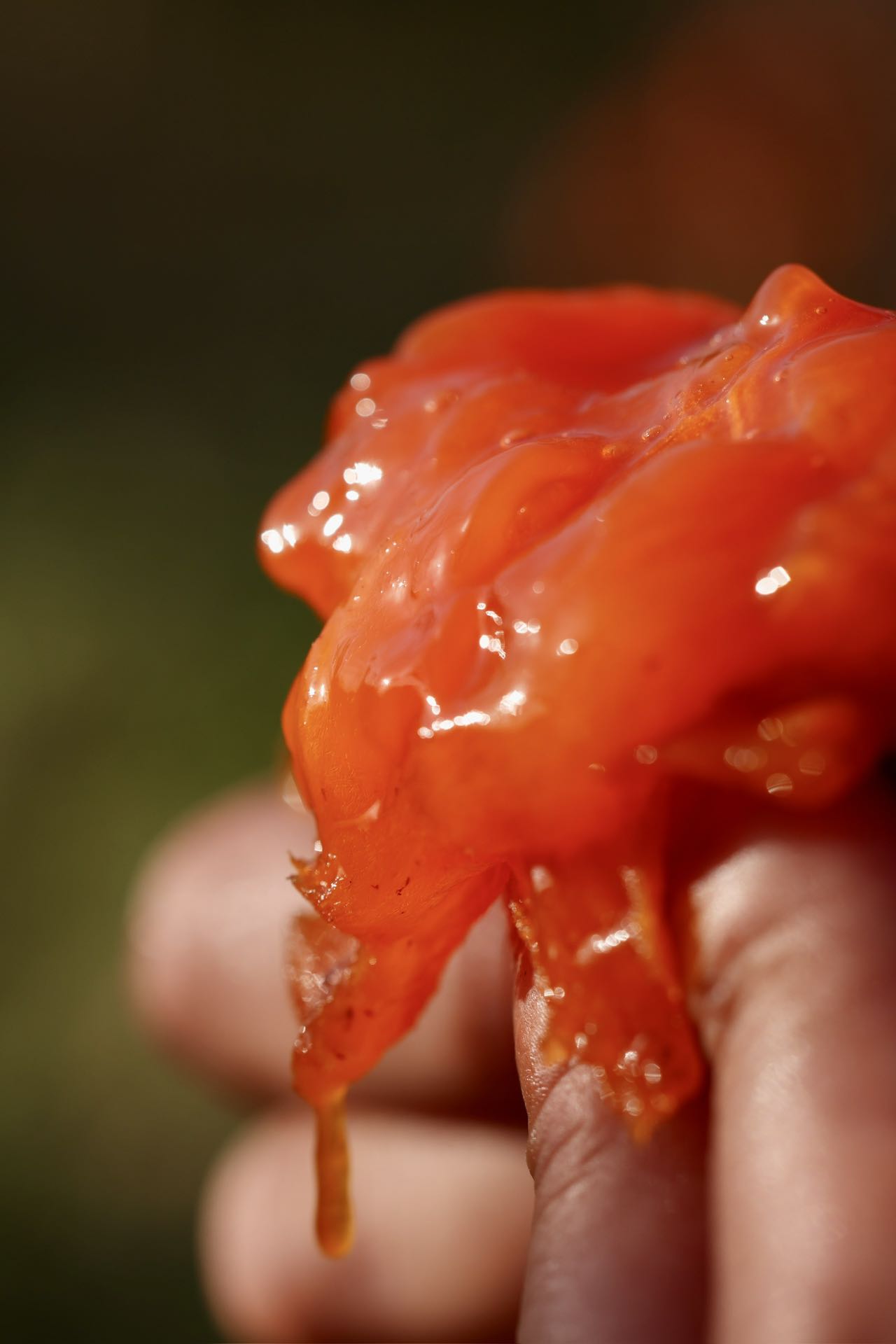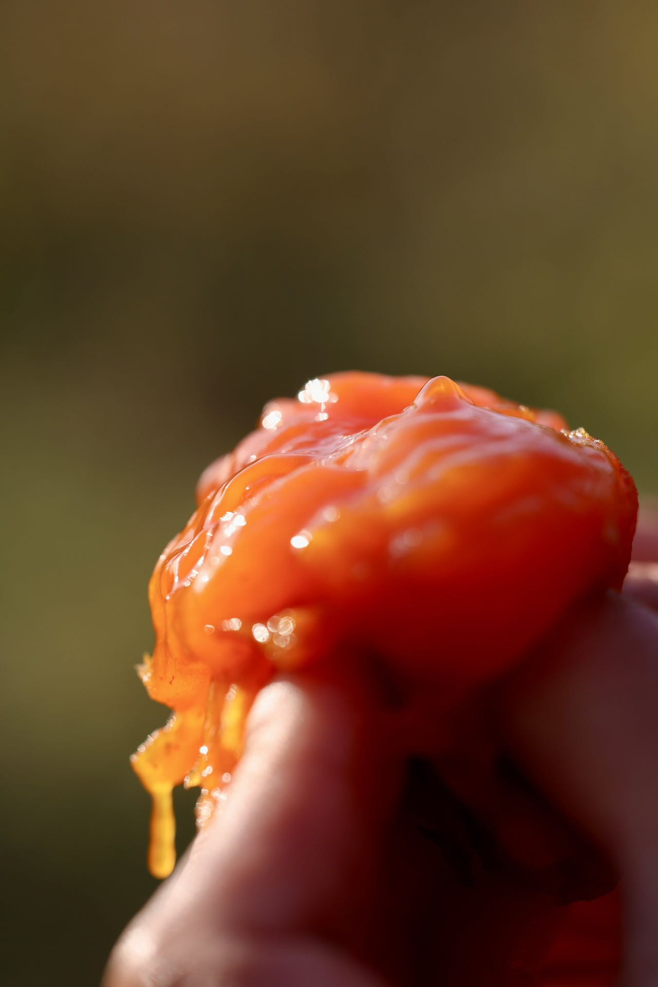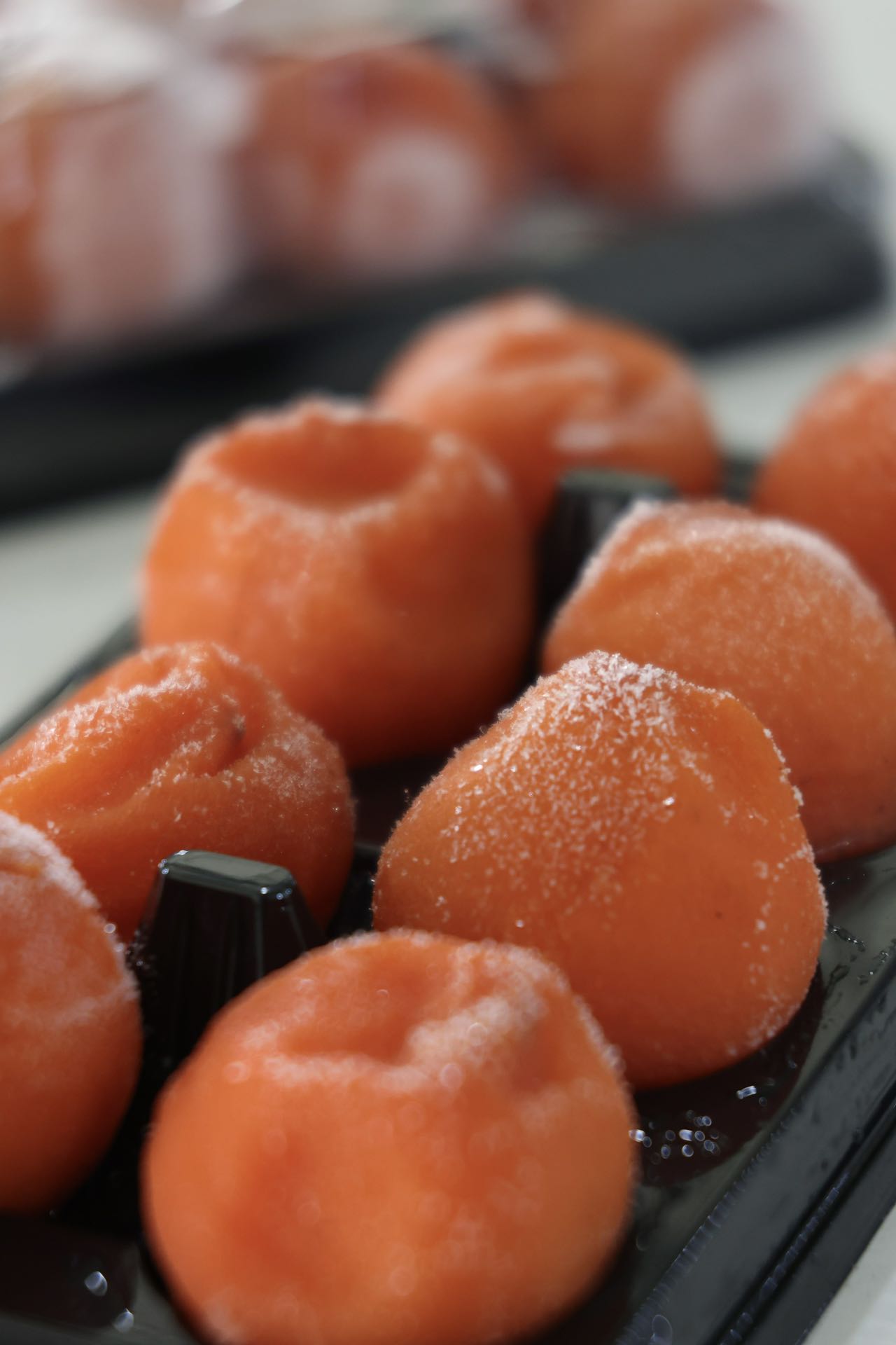 入口瞬间,这抹流心仿若被阳光打发的柿子冰淇淋,丝滑绵密地在舌尖融化,冰凉清甜的蜜意丝毫不腻,还带着富平尖柿特有的蜜香!偶尔还能嚼到果冻般滑脆的“小舌头”,平添一份食趣。