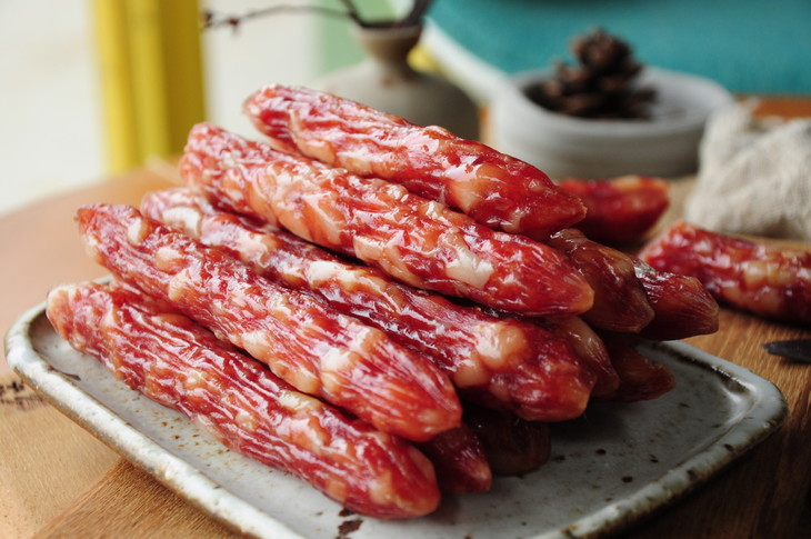 我们这次的腊肠加工,严格按照传统广式腊肠的加工方式。腊肠真空包装,因为没有添加防腐剂,所以需要冷冻保存,可保存12个月。