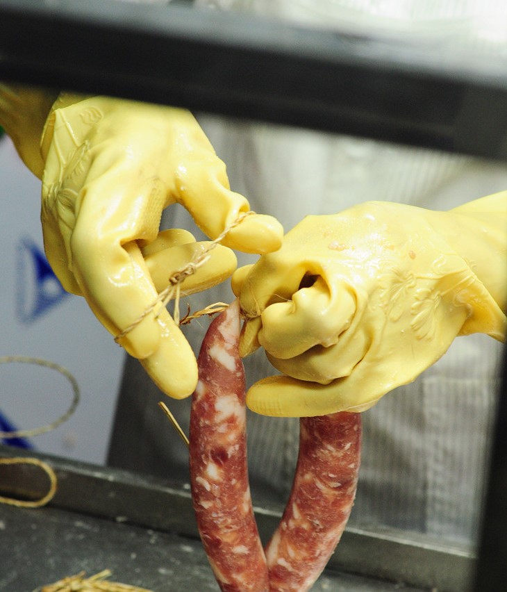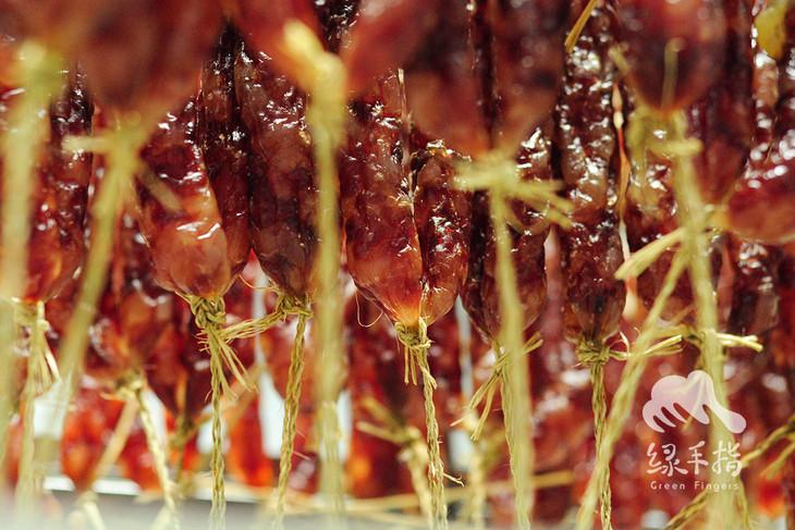 腊肠灌制后用稻草手工分段,在洁净环的烘房内烘干。