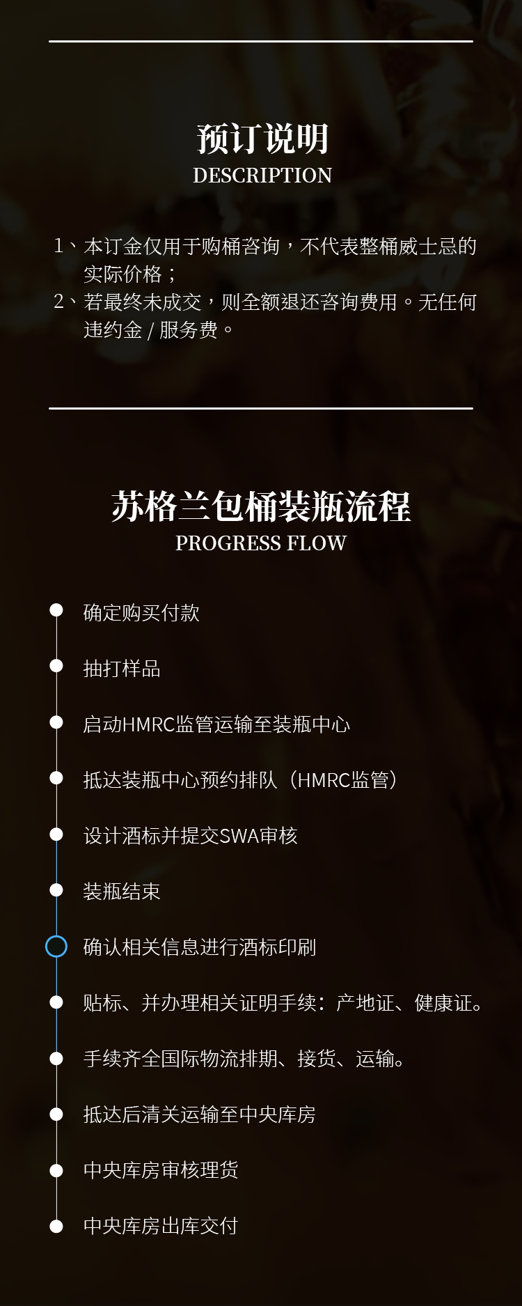说明:1、本订金仅用于购桶咨询,不代表整桶威士忌的实际价格;2、若最终未成交,则全额退还咨询费用。无任何违约金 / 服务费。