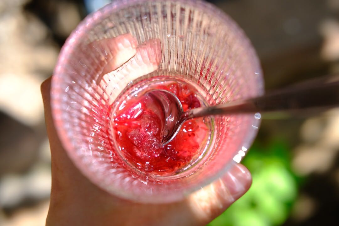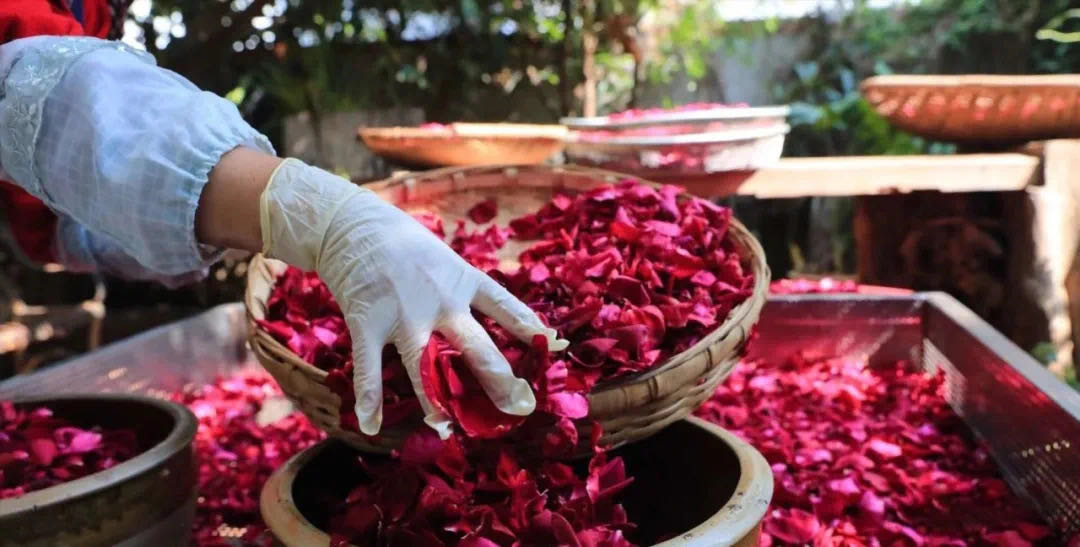 力度要刚刚好,打断玫瑰花瓣上的经络又不能揉碎,既祛除生涩之味,又保留玫瑰花瓣的形态和颜色。