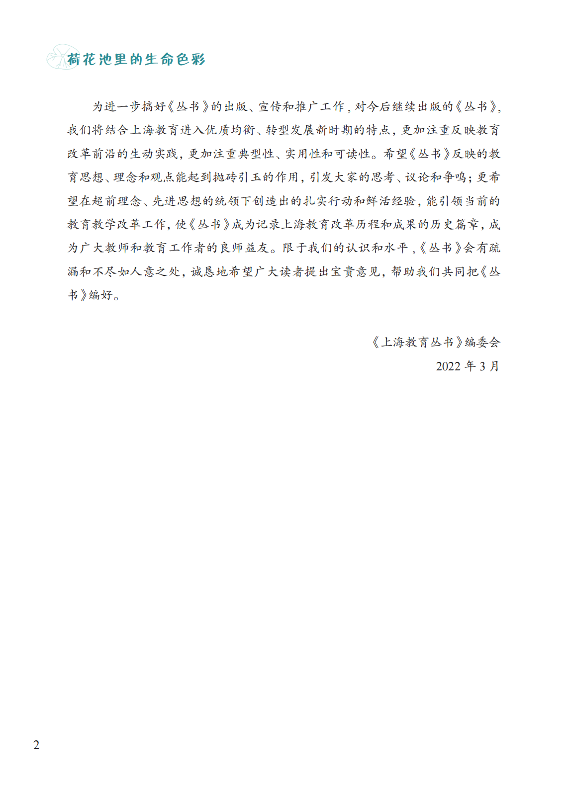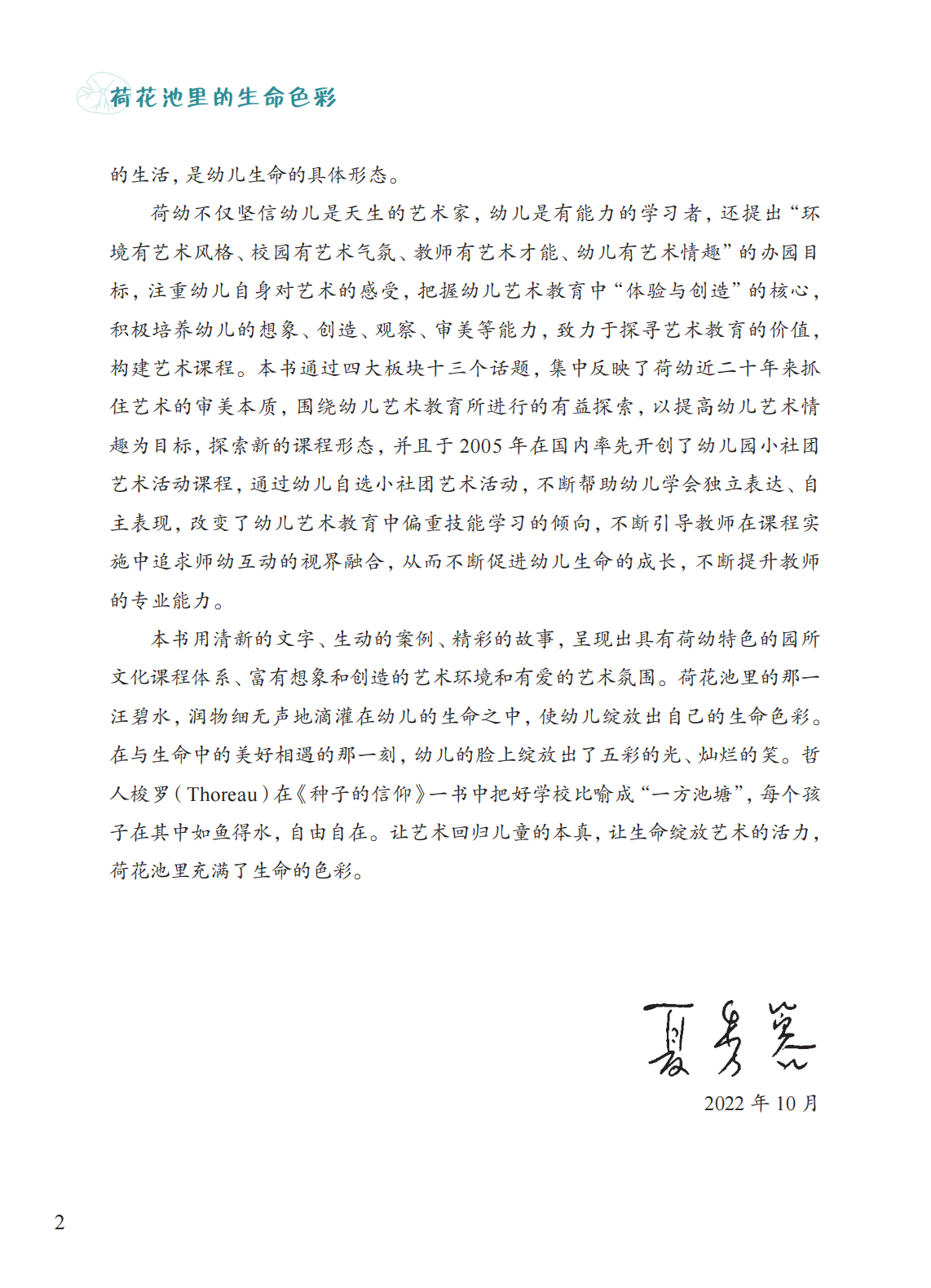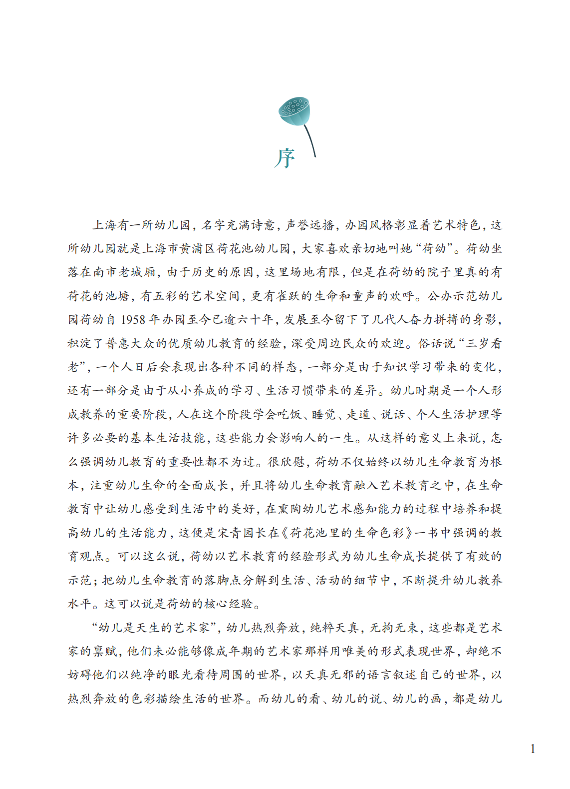 该书是上海教育丛书中的一本。上海市黄浦区荷花池幼儿园基于“视界,我与孩子共可能”的课程理念,对多年来艺术教育经验进行总结。稿件内容比较丰富,经验比较扎实,主要包括“幼儿是天生的艺术家”“拾花而行的课程时光”“幼儿园里的艺术生活”“有爱有成长”四讲十三话内容。“社”享童年,创设艺术气息浓郁、立德启智的课程化学习环境,让艺术教育回归儿童本真。同时,又立足新时代新背景,实现课程的可持续发展,随着课程不断更新迭代,从整合自主、渗透共融再到视界融合,拓展着艺术教育的内涵和外延,把艺术教育与幼儿终身发展紧密联系在一起。