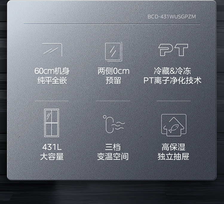 美的冰箱BCD-431WUSGPZM迷境灰60cm机身,平齐橱柜不凸出;PT离子净化循环,去味留鲜;三档电子变温空间,满足不同需求;