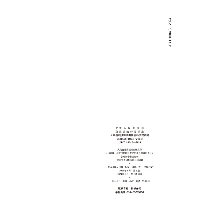 书名:公路基础设施长期性能科学观测网 第3部分:数据汇交规范(JT/T 1504.3—2024)