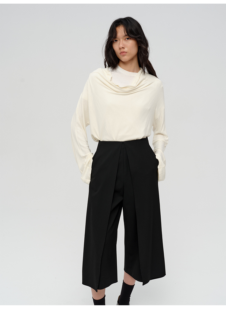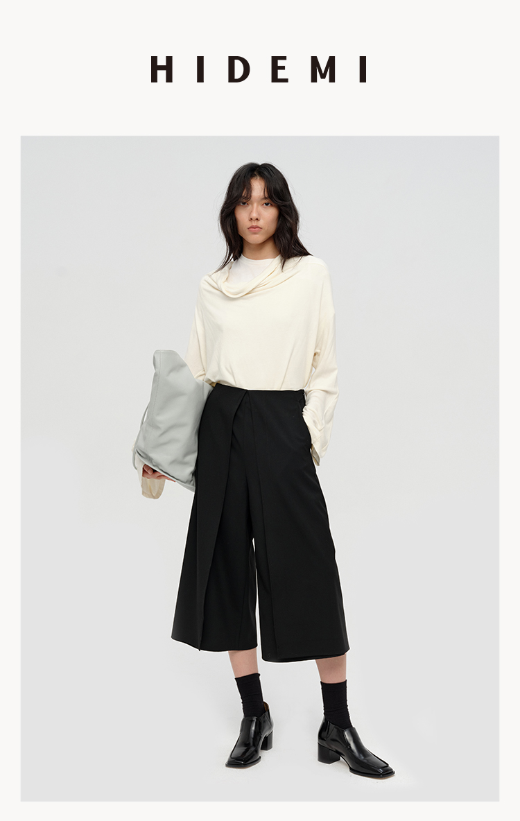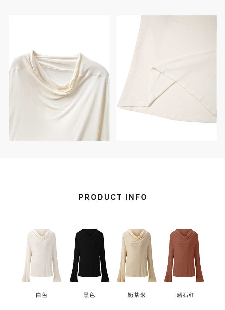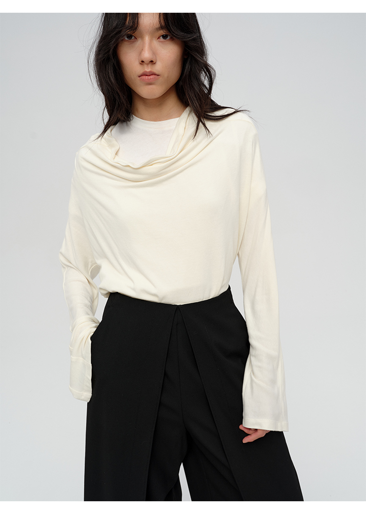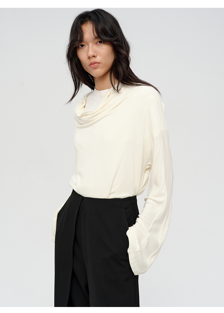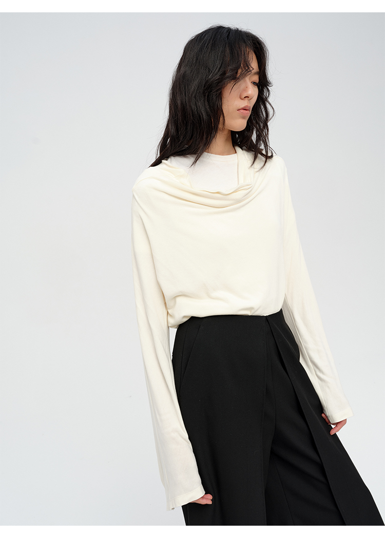 HIDEMI 极简设计感多种穿法荡漾领臻品混纺极细绵羊毛针织长袖弹力加厚款弹力T恤上衣 白色/黑色/赭石红/奶茶米
