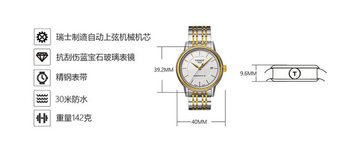 表壳 厚度 | 9.6 mm | 材质 | 精钢PVD镀金 |