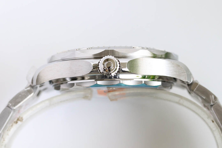 欧米茄海马的300米侧面和把头也通过精密的打磨。手表的10点钟方向是排氦阀,当潜水员浮出水面时,排氦阀可以从手表中开释氦气,确保手表的防水性能不受损坏,当然作为复刻腕表复原的只是外观制造,并没有正品的排氦功用。3点位置的表冠用来调节时间日历。