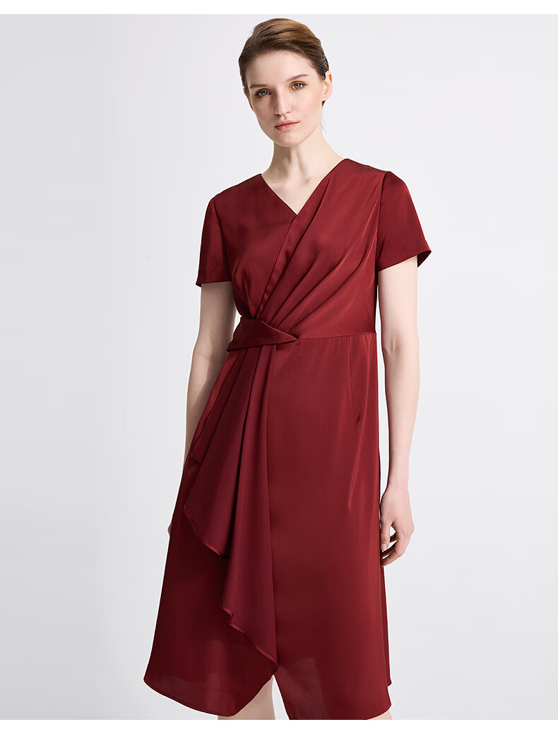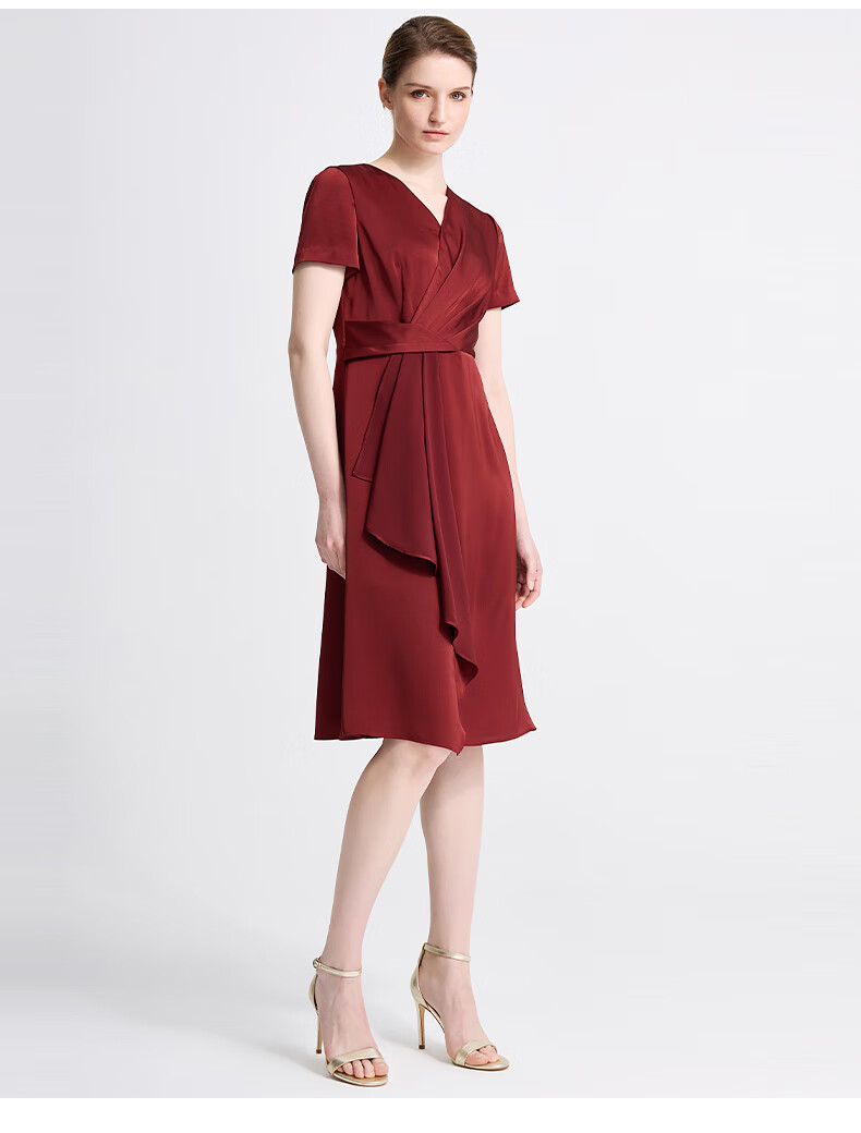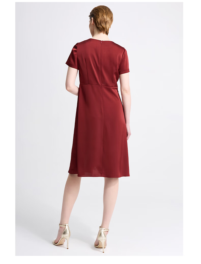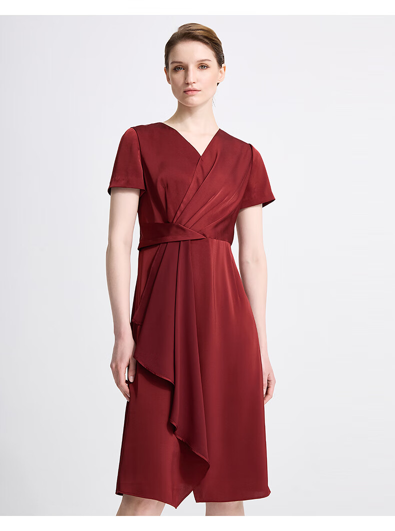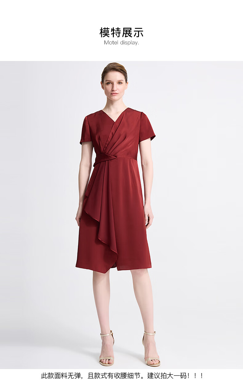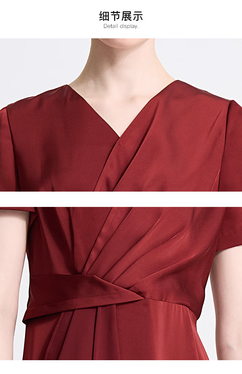 皮尔卡丹女装酒红色蕾丝喇叭袖V领连衣裙显瘦气质短袖A字裙减龄装