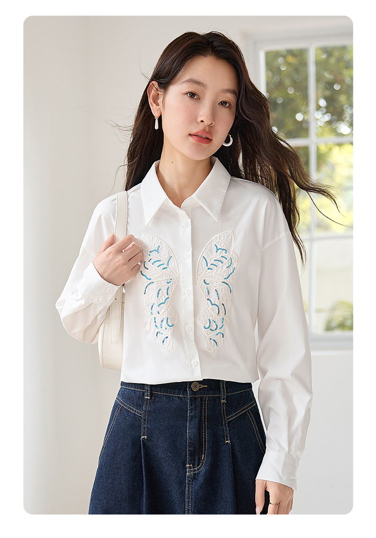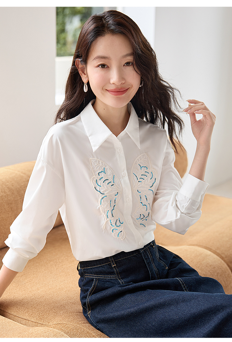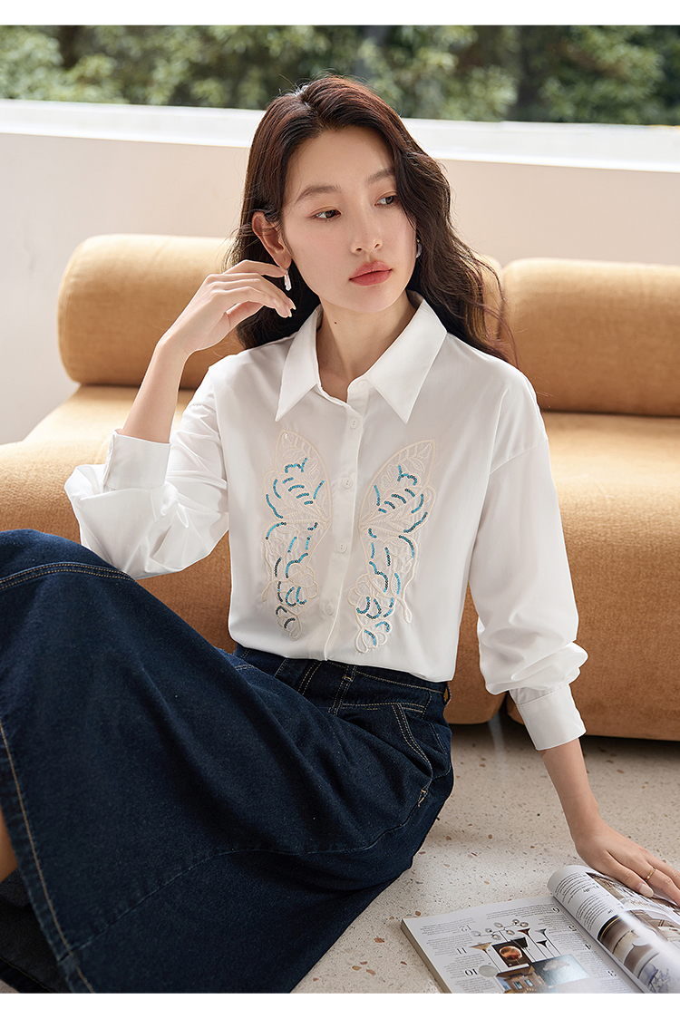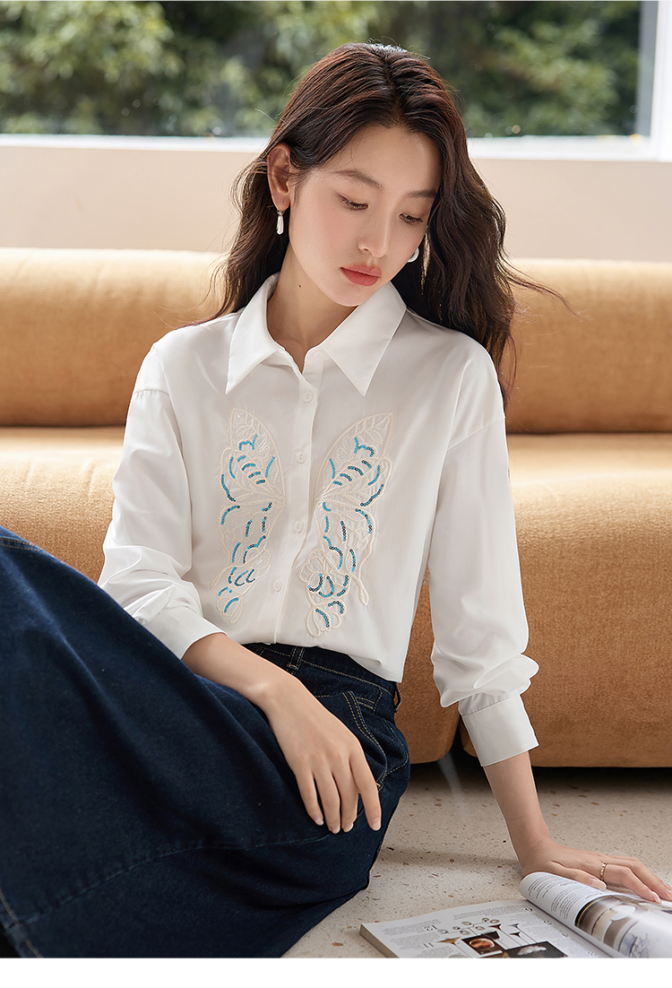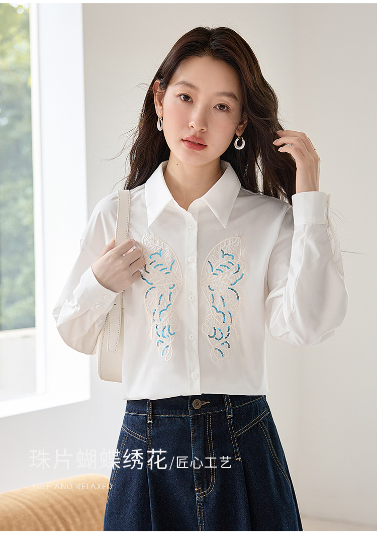【年终特卖】熙世界珠片蝴蝶刺绣衬衣长袖减龄好看的白色衬衫上衣2025秋新款