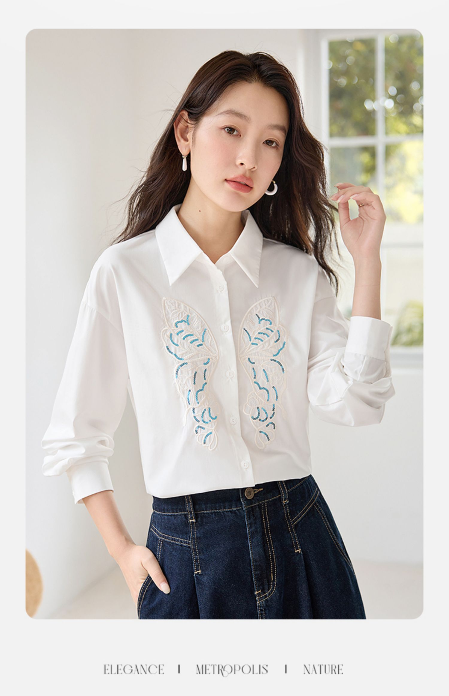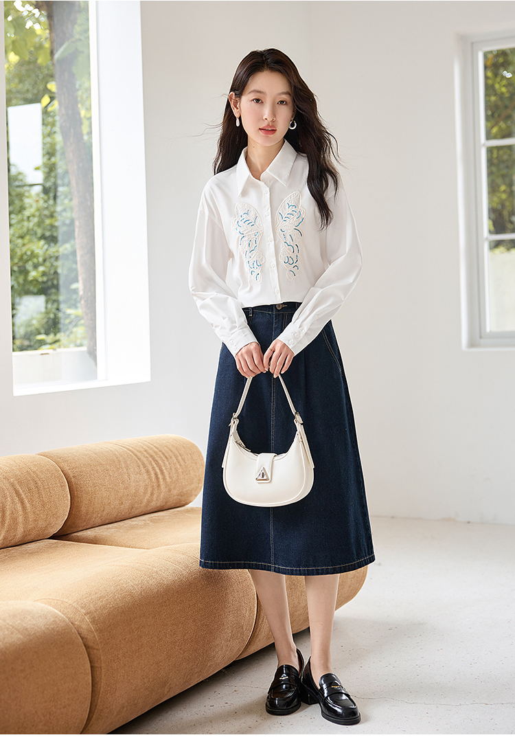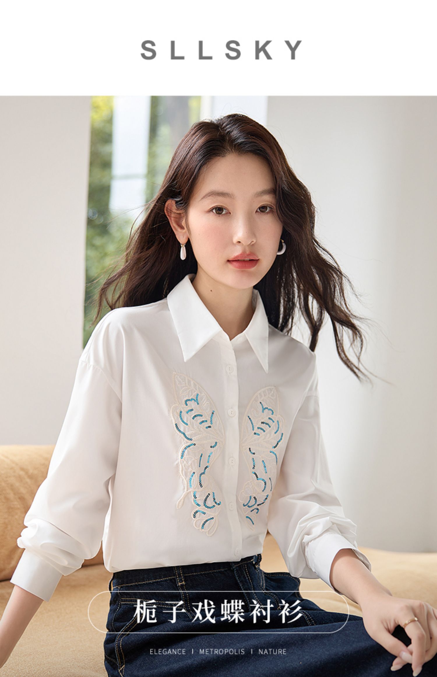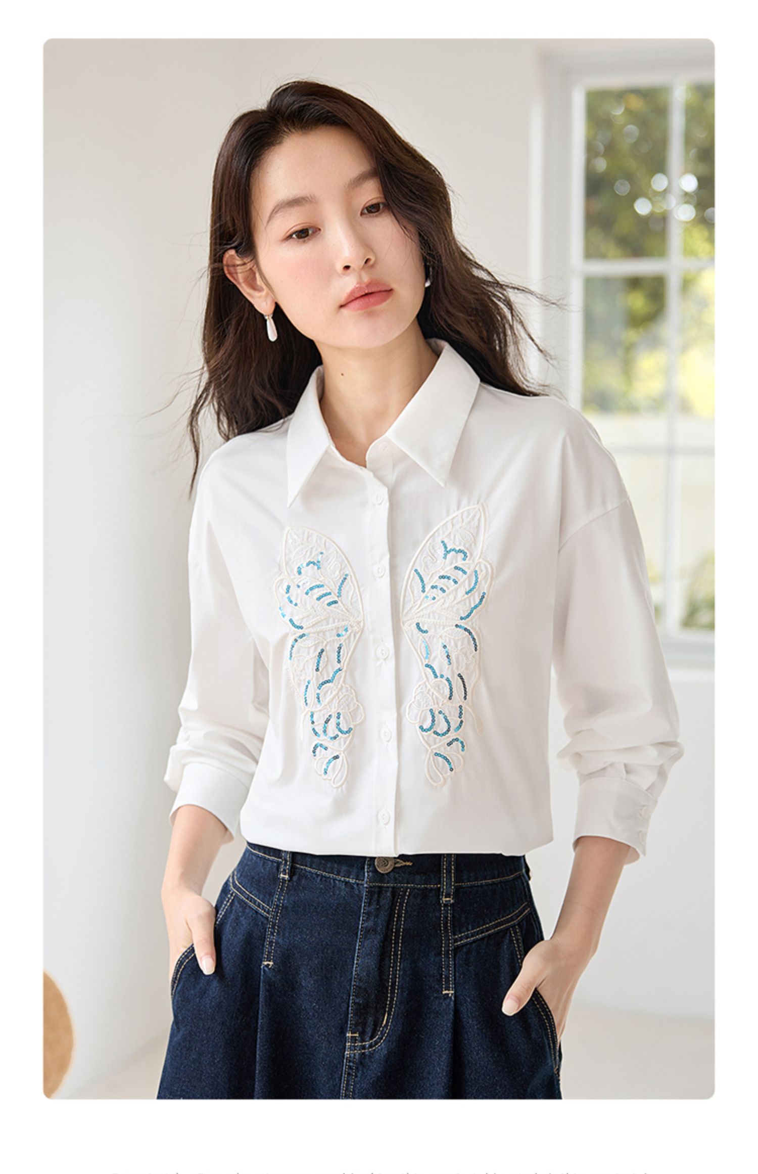 【年终特卖】熙世界珠片蝴蝶刺绣衬衣长袖减龄好看的白色衬衫上衣2025秋新款