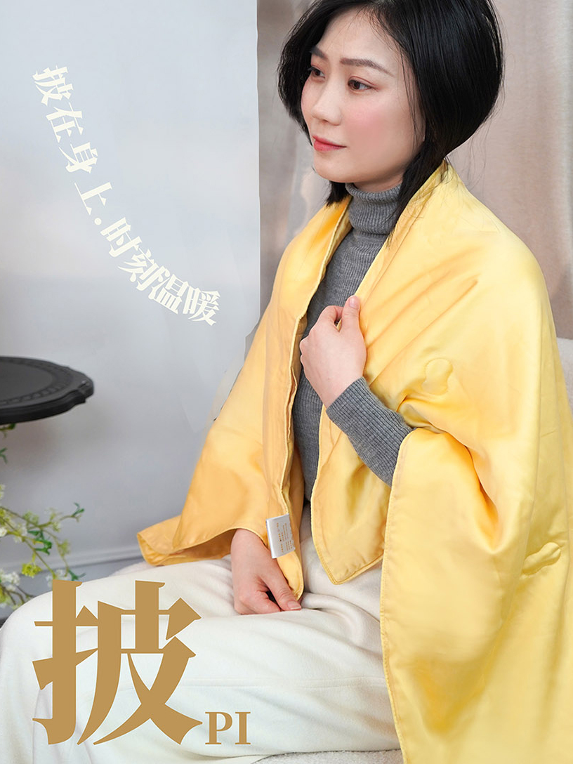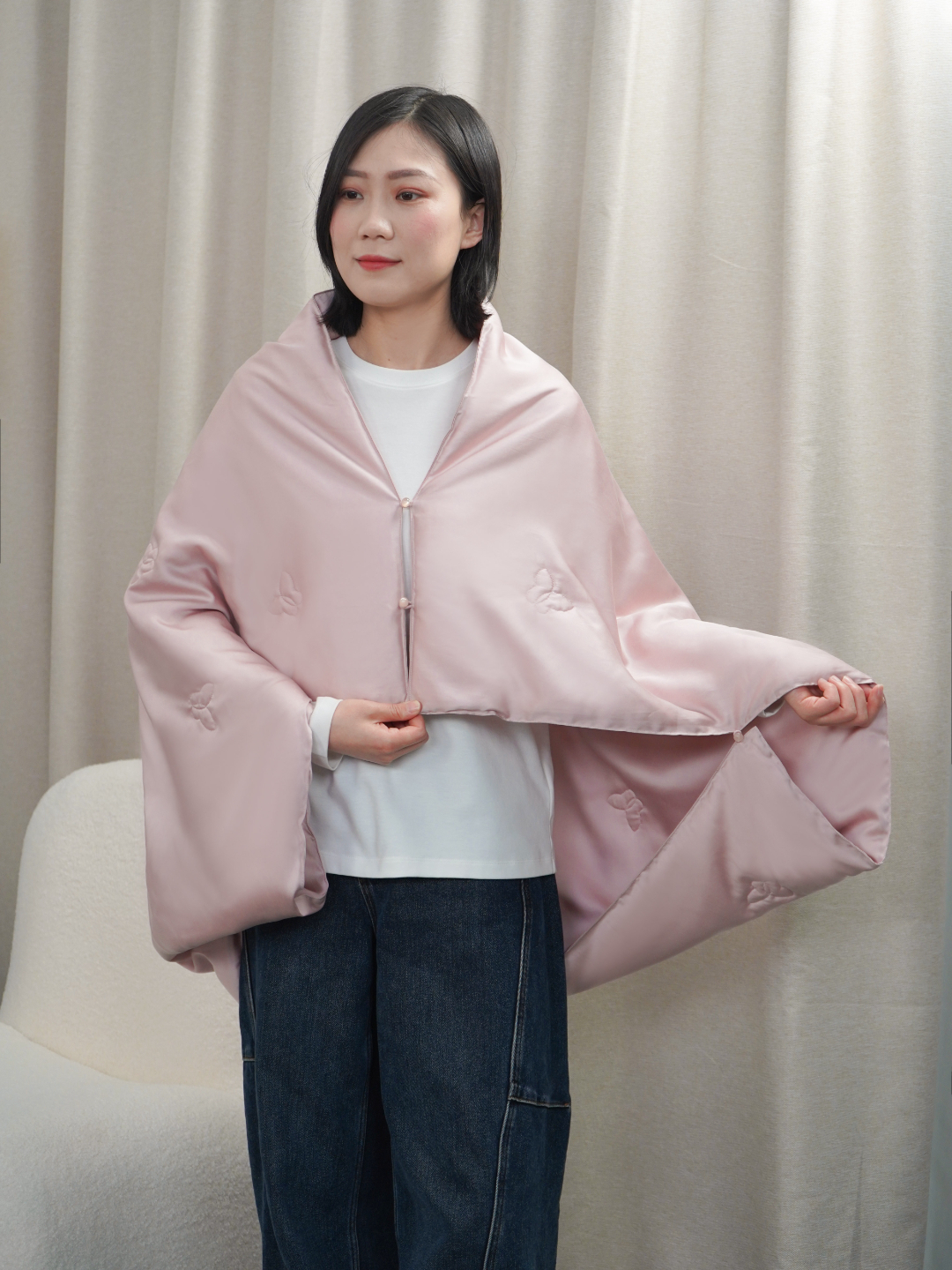 值得一提的是,这款纯蚕丝小被功能多样,一毯多用。展开是一条舒服的盖被,披上即成一件系扣斗篷,不易滑落,甚至能直接作为外搭穿着。“还有更多使用场景,就等待大家自己去探索了。”刘双双一边演示一边笑着说。