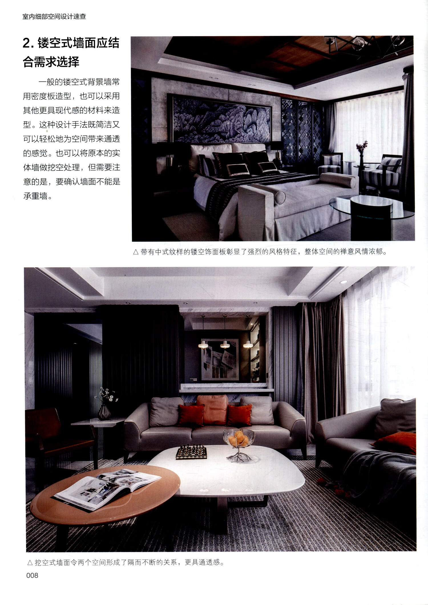 更特别的是,本书在图典的基础上,不忘对设计要点进行提炼。尽量做到精练出实用的细部空间设计要点,并且根据设计要点,选择出相对应的实景图,非常直观地向读者展现设计点。本书分为墙面、吊顶、地面、隔断、瓢窗、楼梯、吧台、室内门八章,内容上,从整体的布局到细部的设计都有介绍,基本涵盖了空间设计的各个方面。
