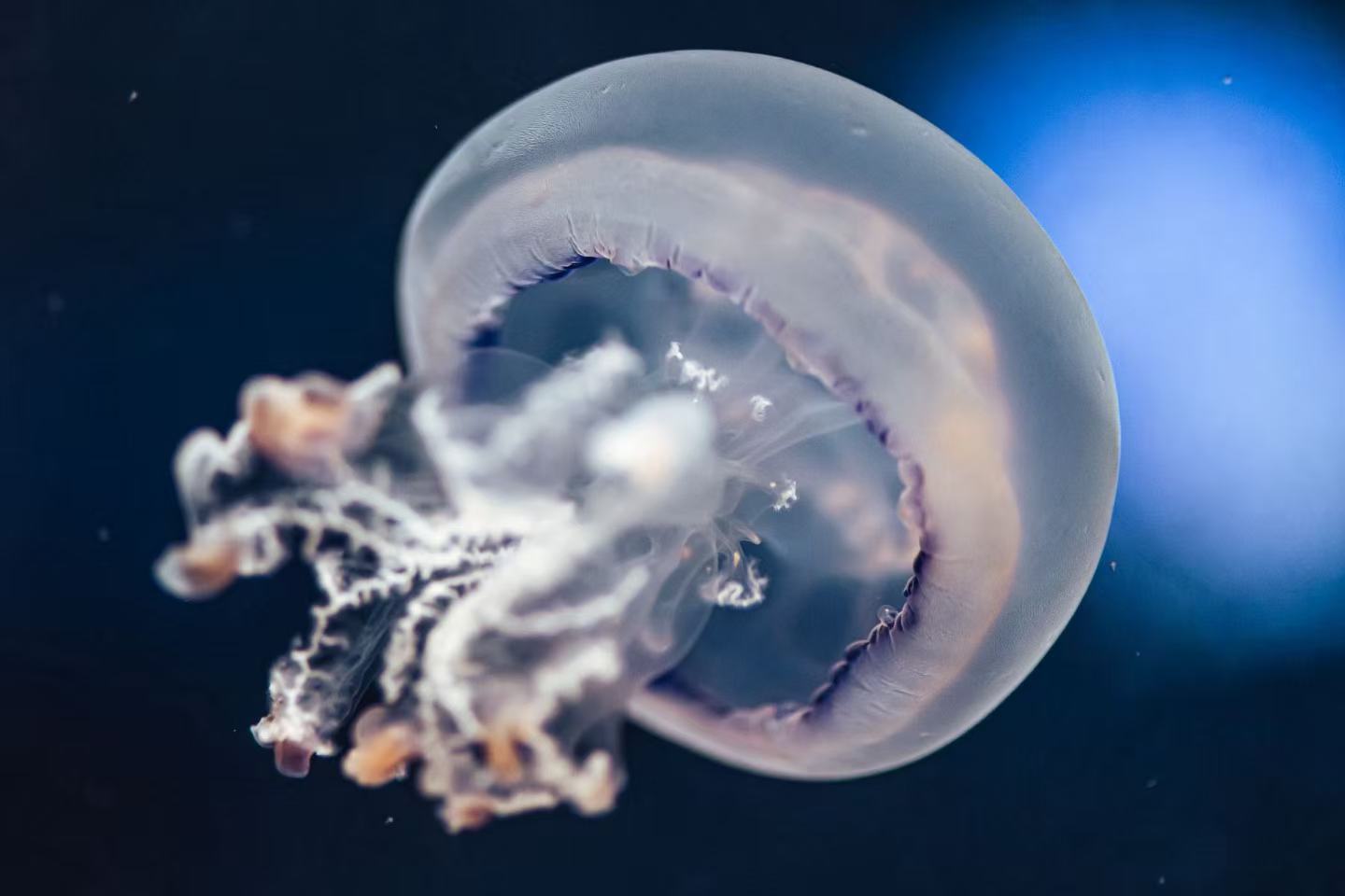 详细介绍:桶水母,是一种大型水母。主要分布在大西洋的东北部(包括英国南部与西部的海岸)、亚得里亚海、地中海、黑海和亚速海,是英国海域最常见的水母,它们伞体呈半球形乳白色,但趋于透明。伞体边缘无触手,但是有一圈若干蓝紫色半圆状瓣的感觉器官 伞状体下口腕为一大柄,该柄包含一个短柱状基部干体,16条各拥有三个分支的干体,以及一个有皱摺的口。它的身体其后再进一步分为8条褶皱的触手与三翼细长的末端附属物。桶水母目前是英国水域中最大的水母。一般而言, 它的体重最重可达35kg,伞径通常在40厘米左右,但是最长可达150cm或更大 由于它们可以长到垃圾箱盖大小,所以人们对它还有一个俗称:垃圾箱盖水母。