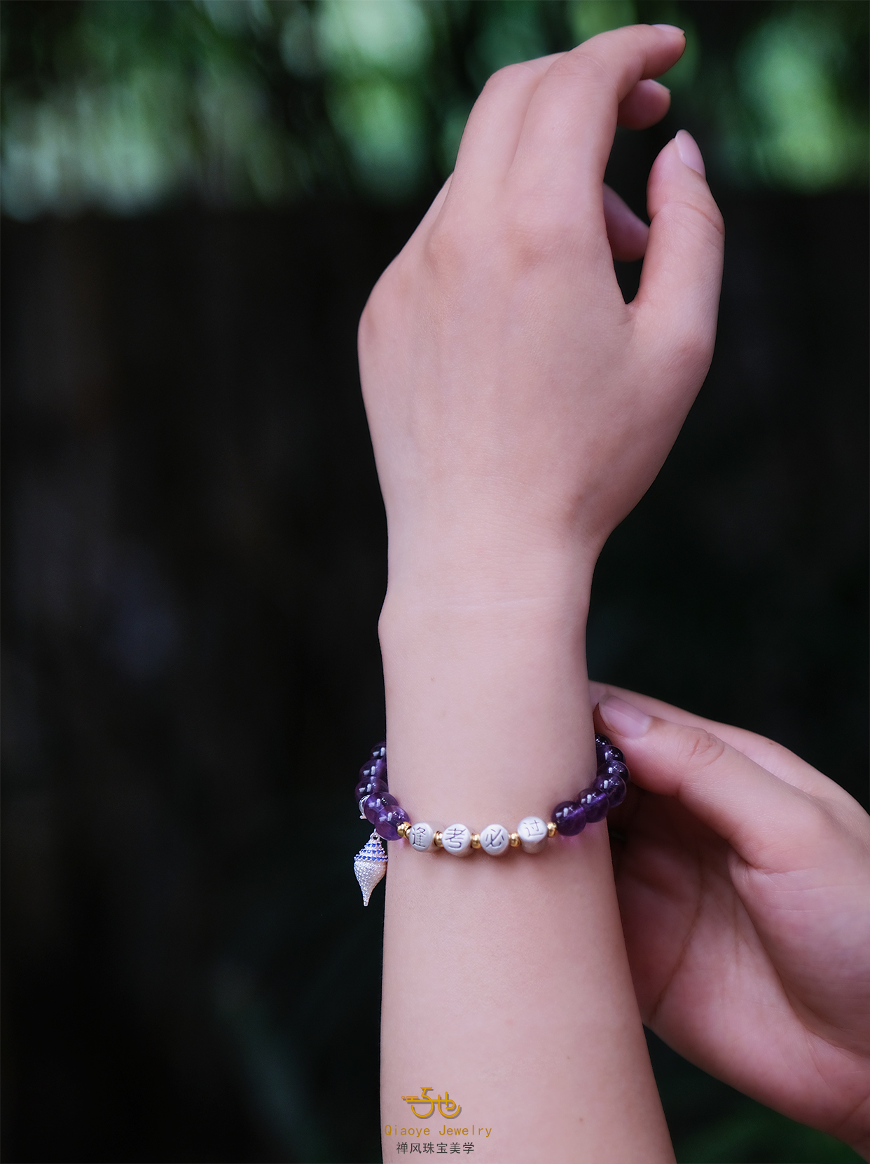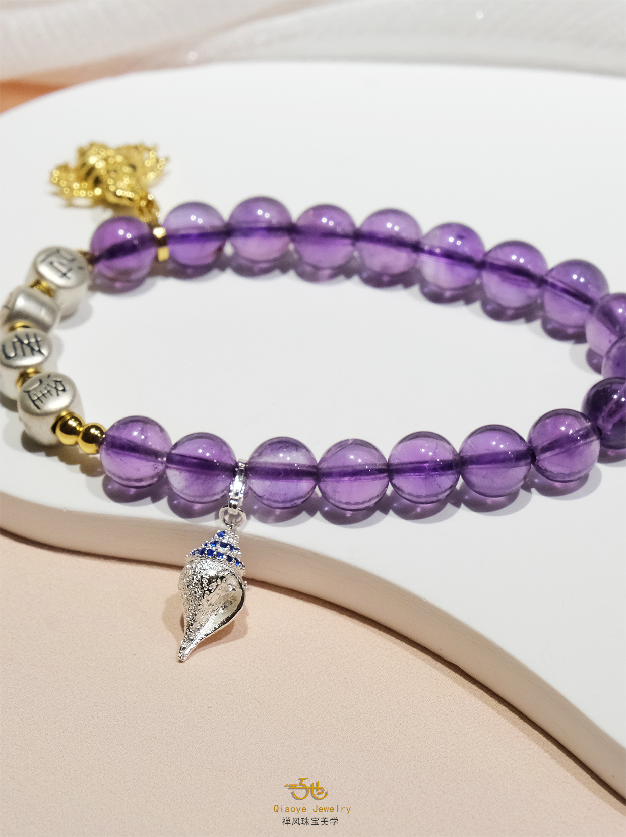 “金榜题名”银配件,承载着对莘莘学子学识有成的殷切期盼;银大象寓意吉祥、稳重、力量,常象征平安顺遂、万象更新;花代表美好、生机与浪漫 。二者与紫水晶搭配,为手链增添灵动与祥瑞,既具美学价值,又蕴含丰富文化内涵,寄托着对佩戴者学业顺遂外,生活也能如繁花般绚烂、安稳似大象的祝愿。