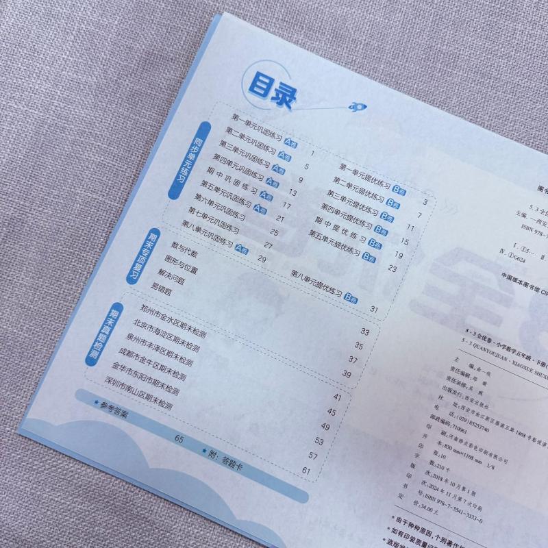《5·3全优卷》系列小学数学五年级下册BSD,以近期新版《课程标准》为依据,广泛吸收教学一线的先进理念,严格遵循学生的认知规律,命题科学合理,能够有效地帮助学生检测知识的掌握程度。本书适用于整个学期的学习,包括“同步单元AB卷”“期末专项复习卷”“期末测试卷”。“同步单元AB卷”,用于每单元的训练,A卷用于大部分学生的知识掌握的检测,B卷用于中等及以上学生的提升检测。“期末专项复习卷”,按专项分类,每个专项细分知识点。