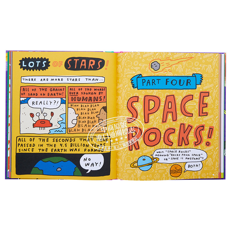 阅读这本 128 页的书籍,带您进入外太空,其中包含您想知道的关于宇宙的一切,充满有趣的事实、笑话、漫画等等!