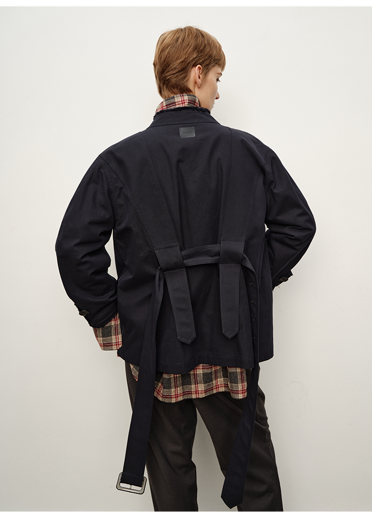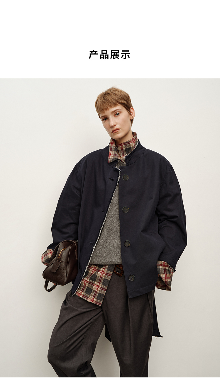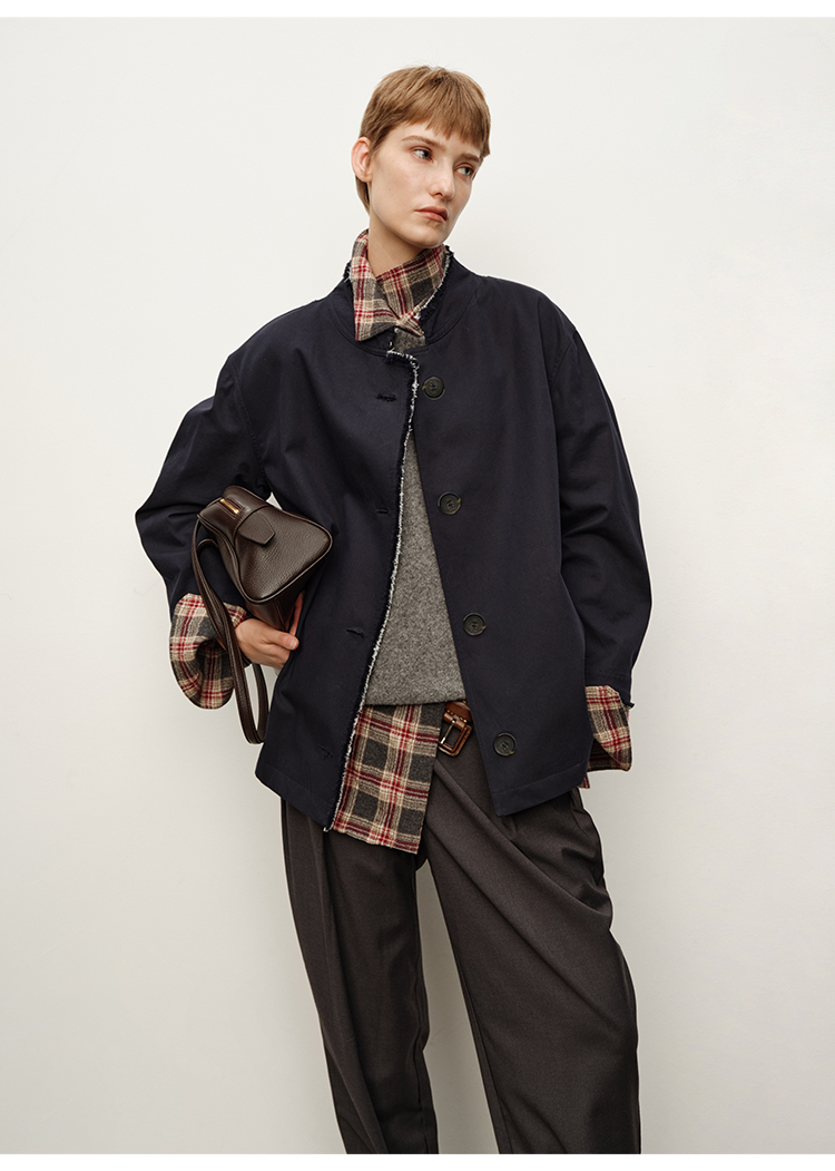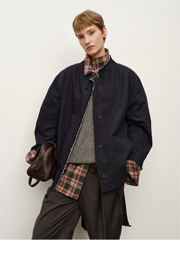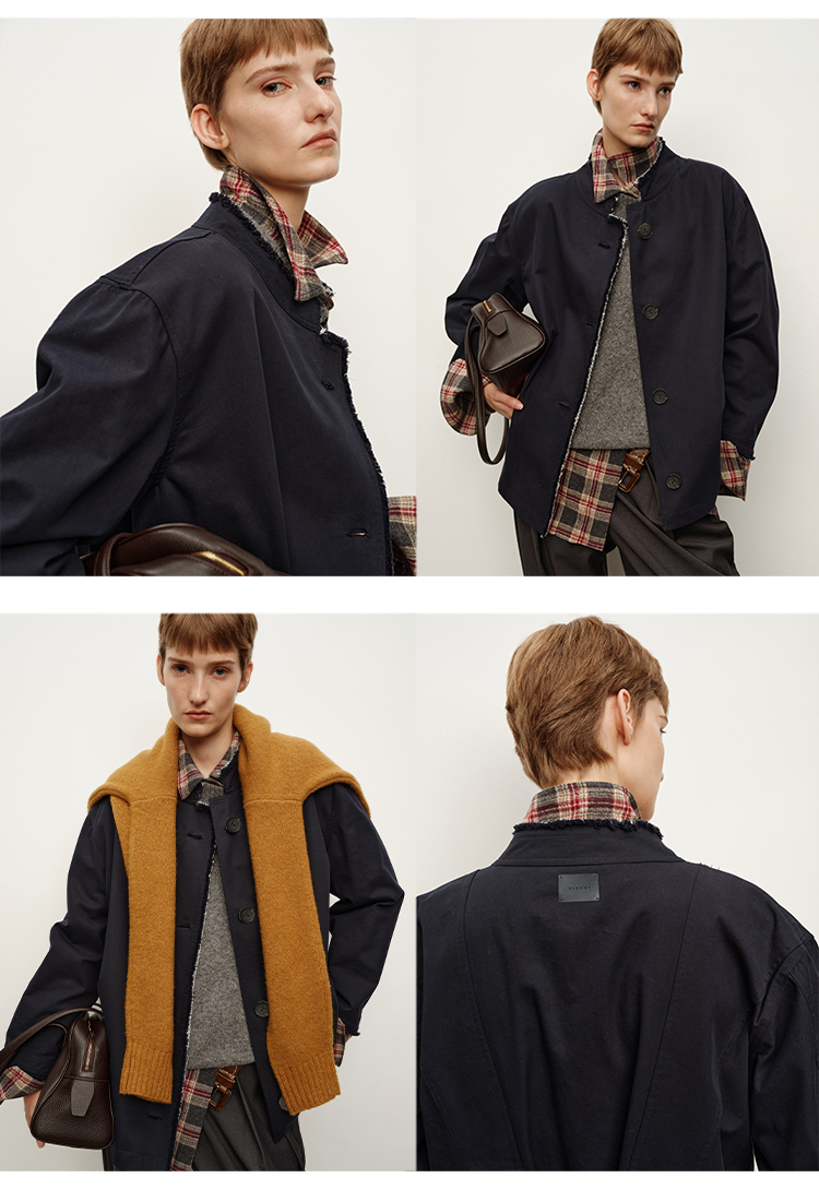 HIDEMI 深藏青极简手工毛边双层拼接立领口袋款短款外套