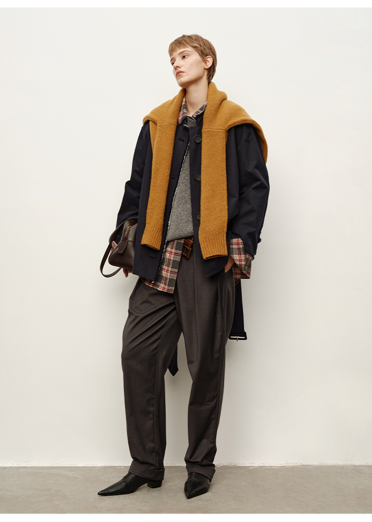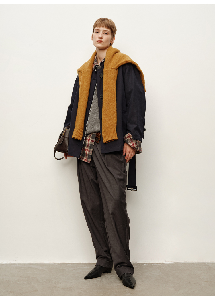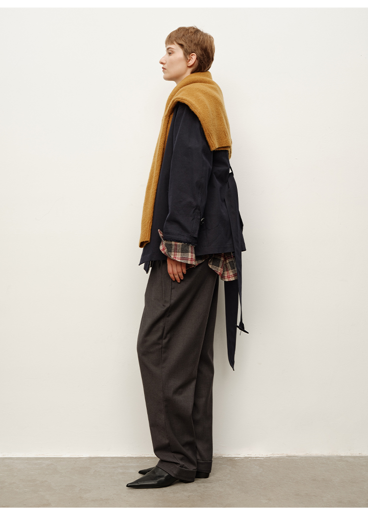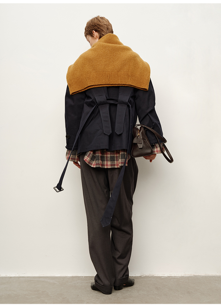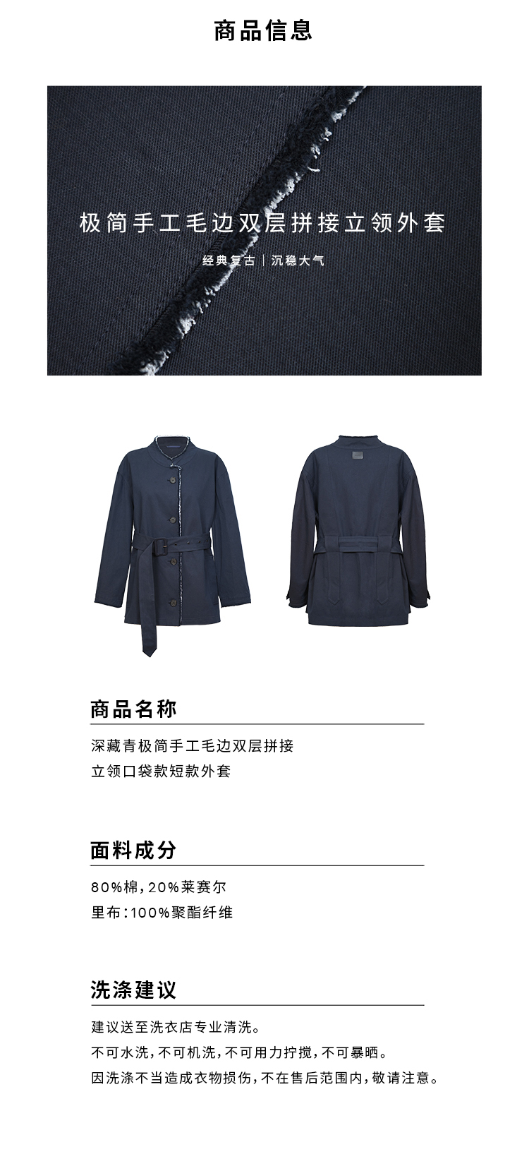 HIDEMI 深藏青极简手工毛边双层拼接立领口袋款短款外套