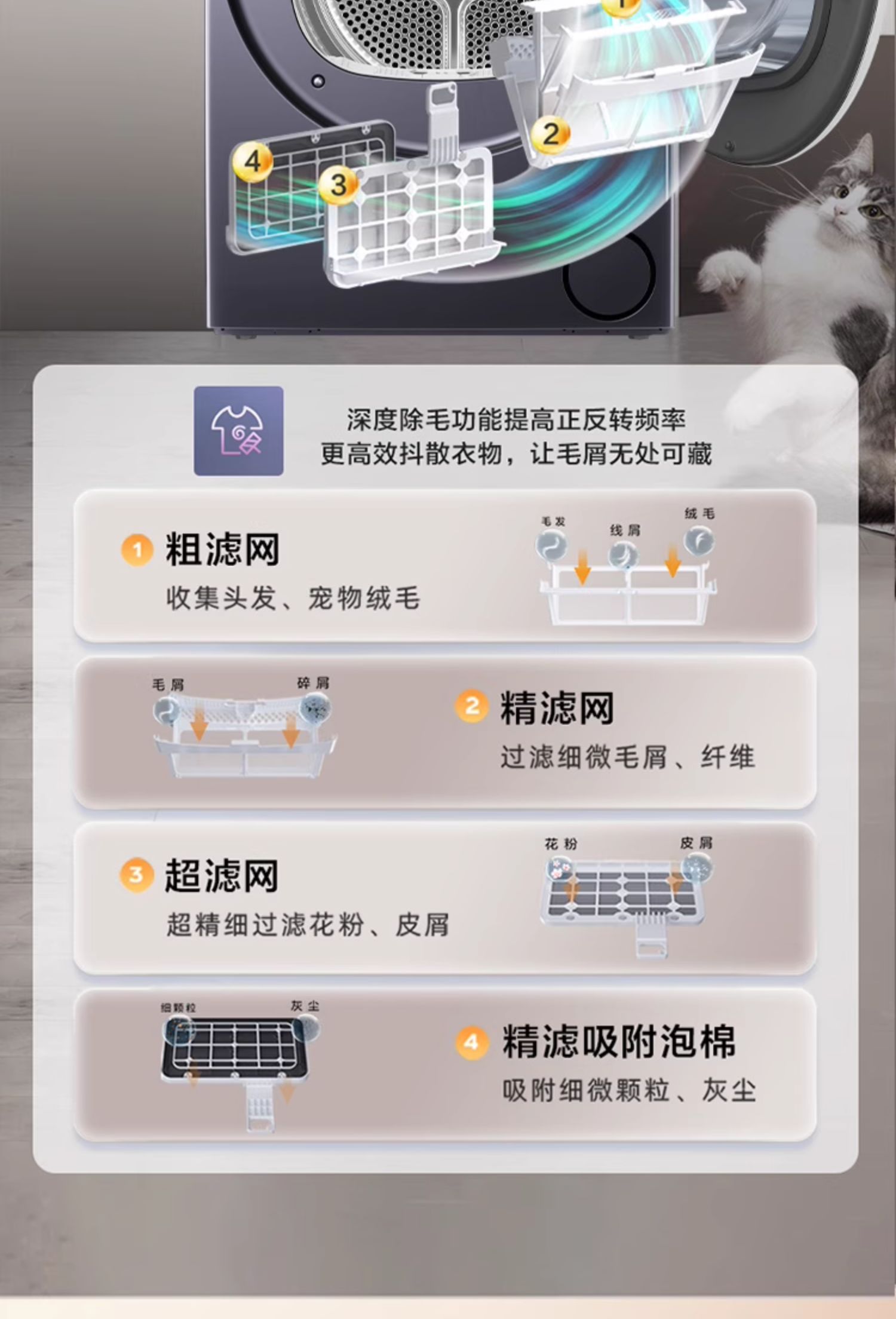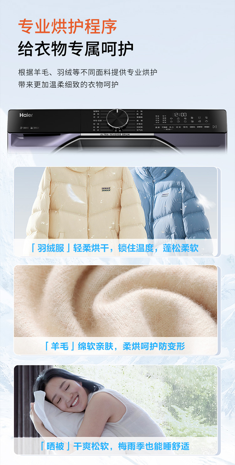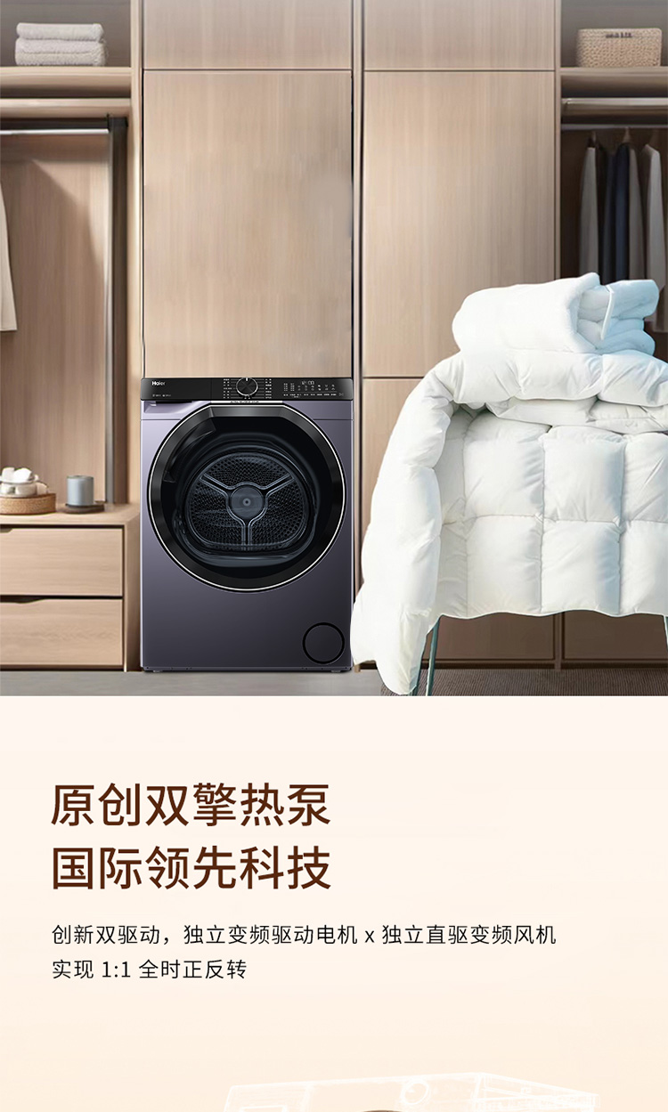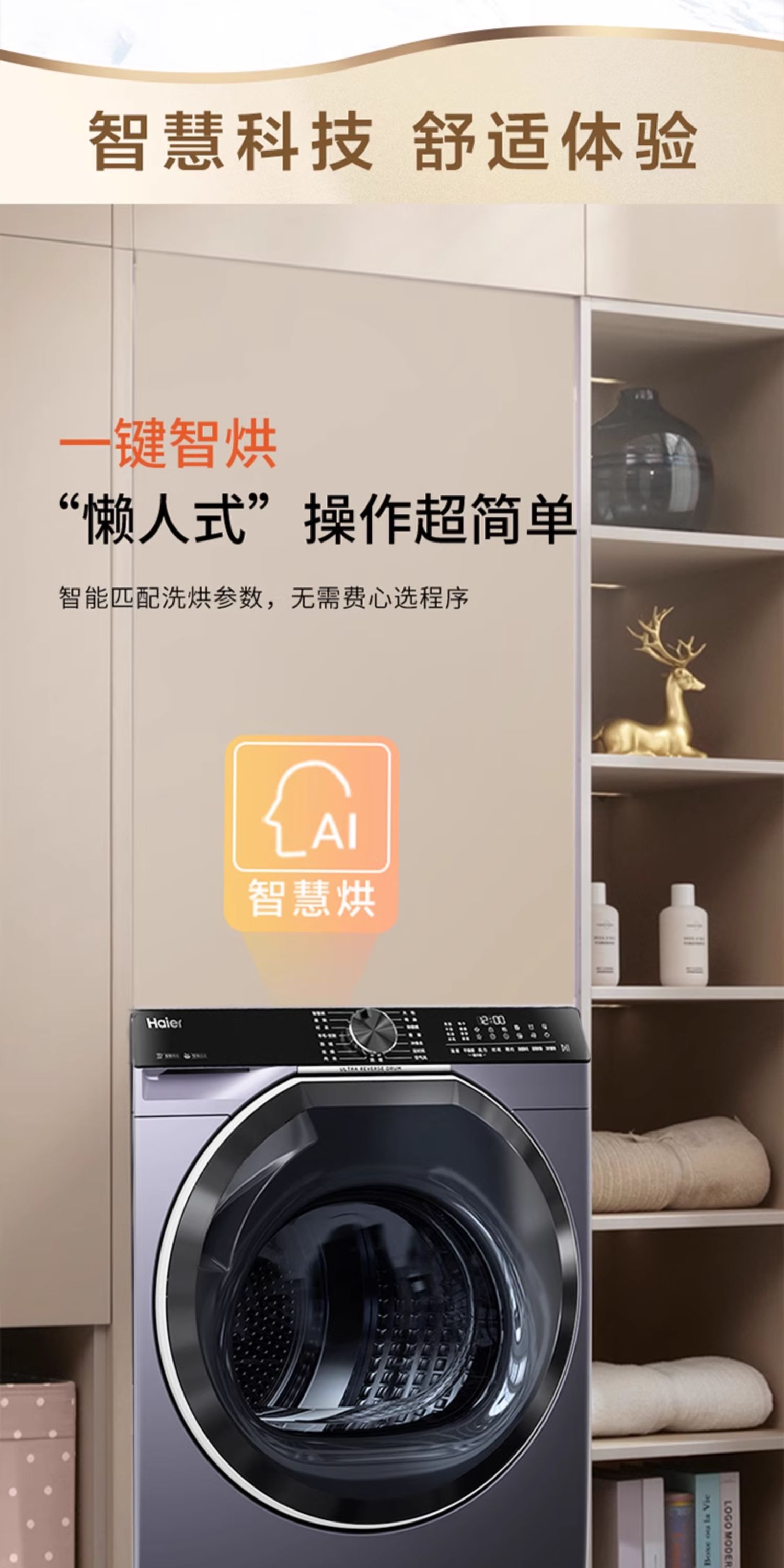 海尔(Haier)【滚筒式烘干机】热泵类10kg家用干衣机 1:1正反转匀烘衣干即停免熨烫烘衣神器GA100-S557B 【云溪557】双擎热泵+1:1正反转+深层除毛屑