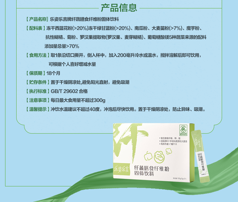 【预售 急单慎拍】无限极乐姿乐言牌纤蔬膳食纤维粉固体饮料 105g(5g*21)原价108元