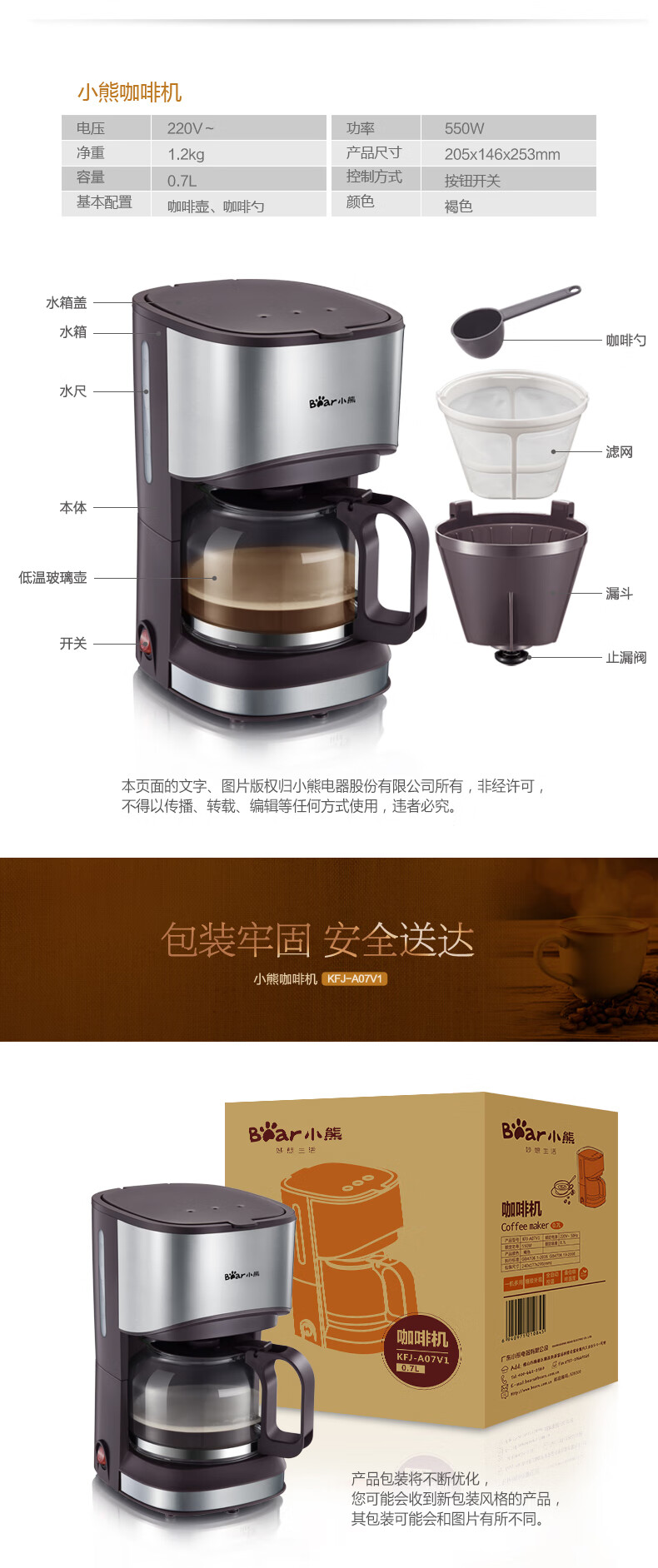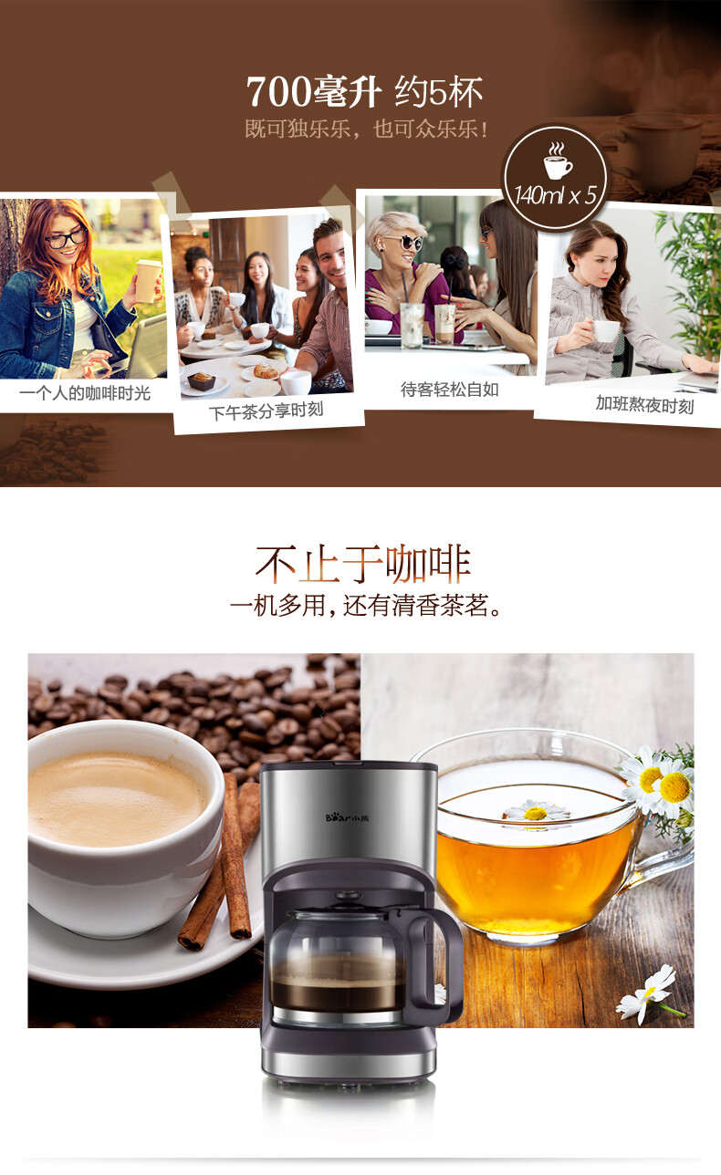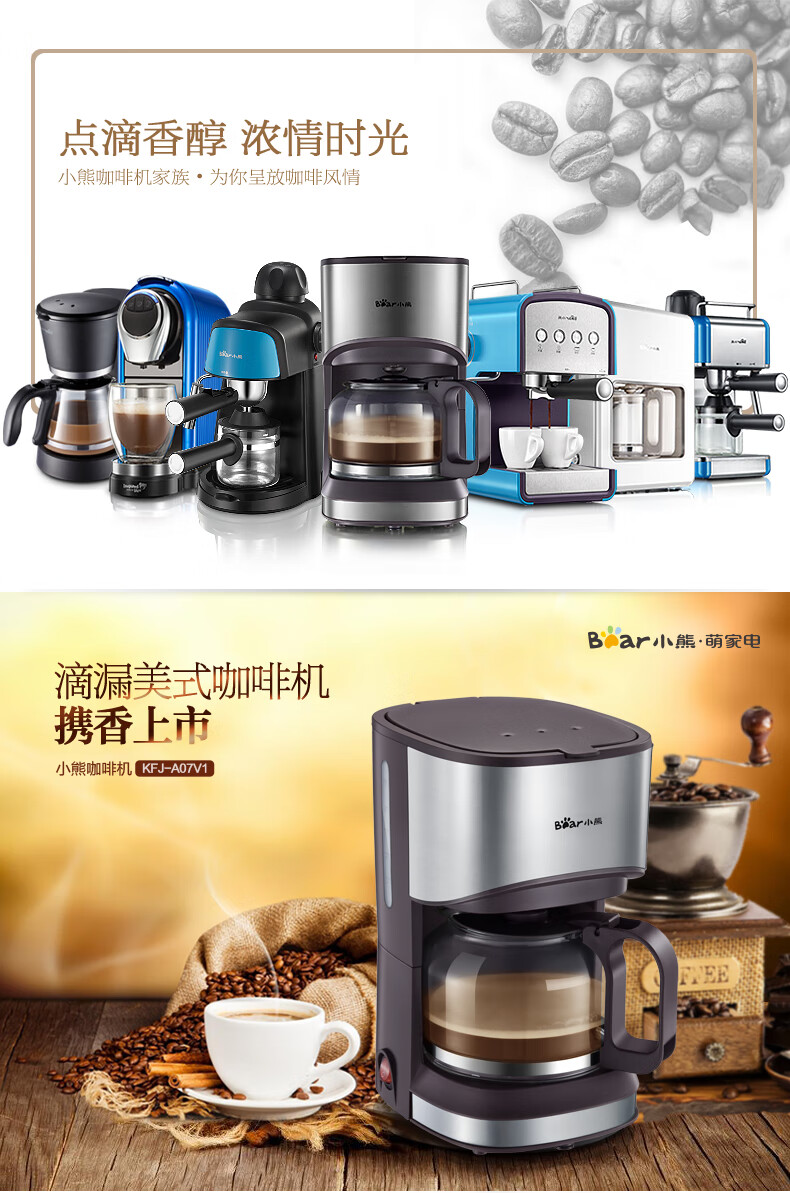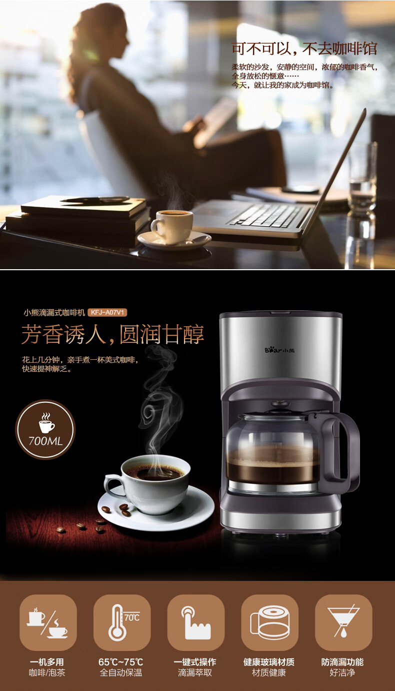 小熊(Bear) 咖啡机 美式家用 0.7L全自动滴漏式小型泡茶煮咖啡壶 KFJ-A07V1 滴漏萃取