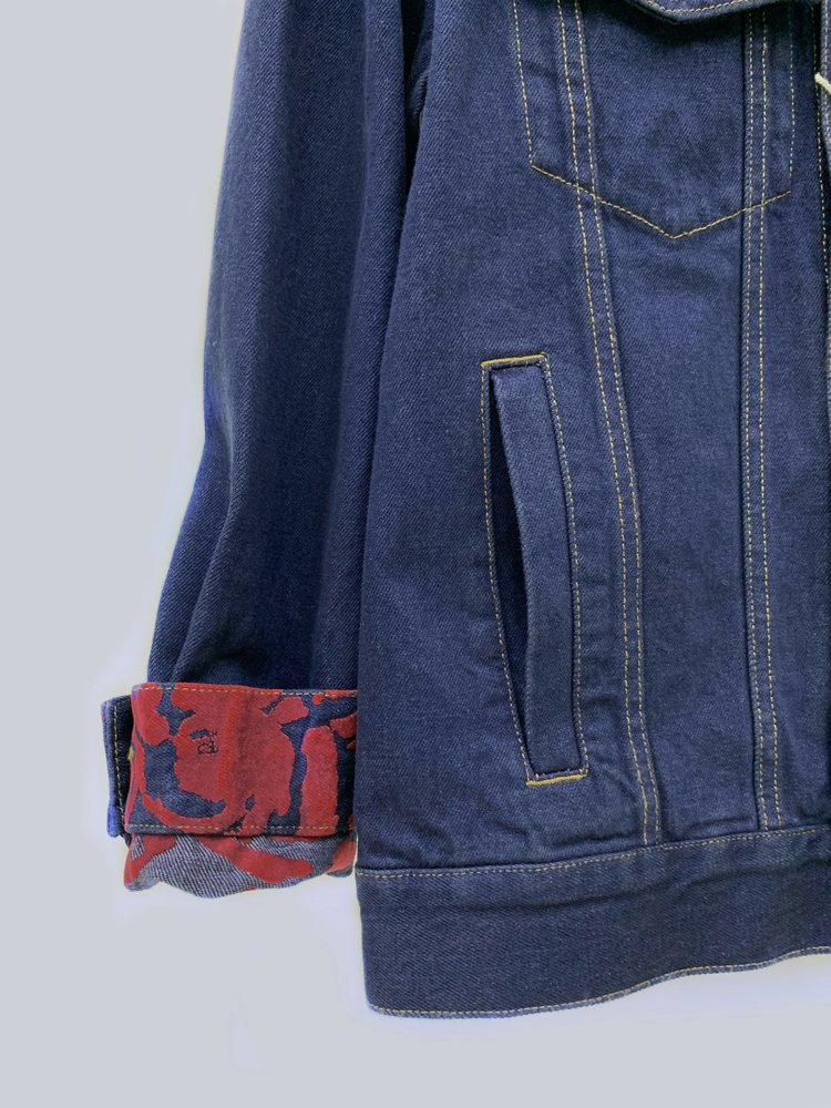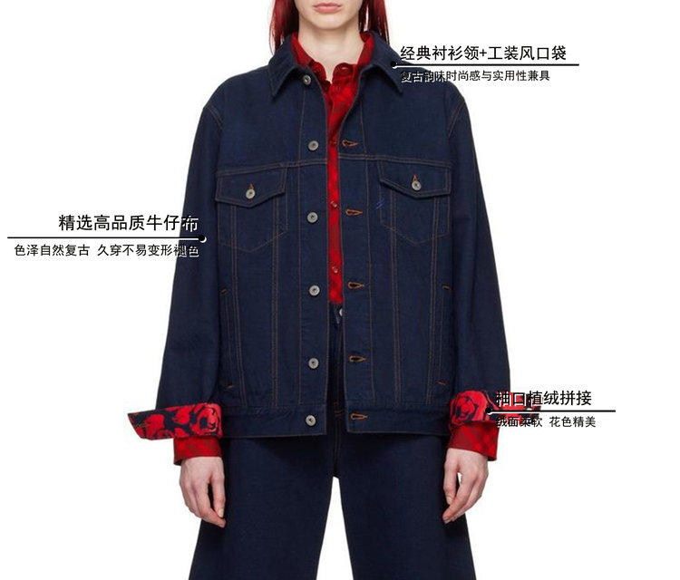不同于普通牛仔外套的单调,袖口处拼接了花色植绒面料。