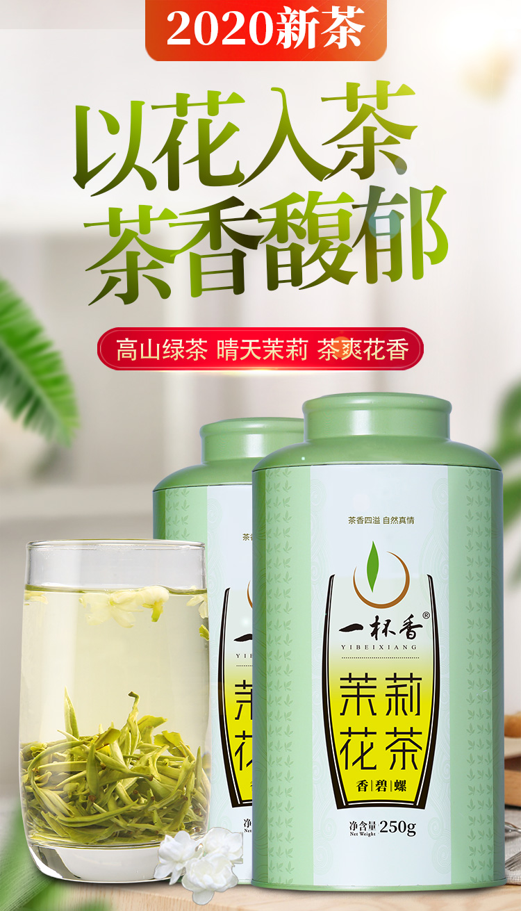 一杯香浓香茉莉花茶2罐共500g礼盒装茶叶2020新茶花草茶散装茗茶