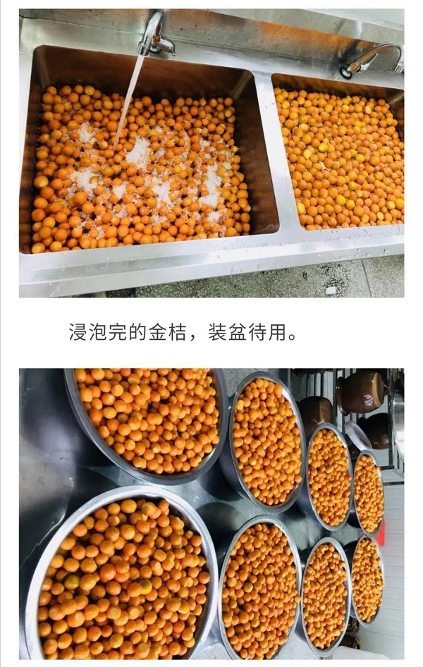 从桃八园运来的金桔, 经过清洗挑选后,用盐水浸泡。