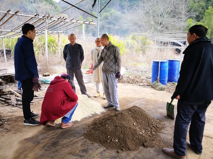 工人们把扩繁的菌肥一袋又一袋倒到金桔树下,让苍老的金桔树焕发青春。
