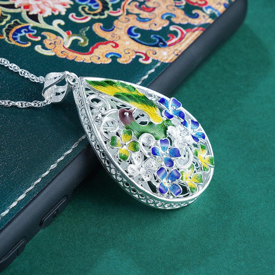 【设计理念】:凤凰凌花而舞,繁华富贵,雍容之态。寓意吉祥、华贵。拉丝的工艺将凤凰的形态完美呈现,运用景泰蓝点翠,更加生动形象。