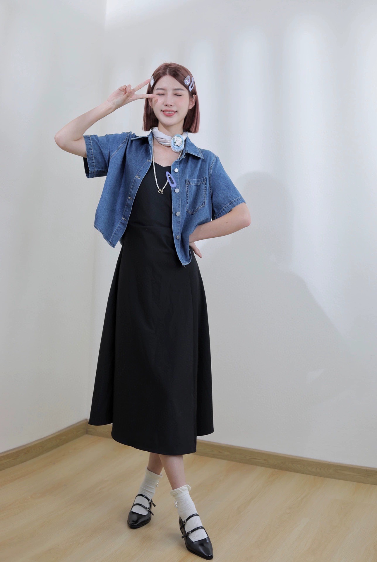 335579 # 牛仔蓝 M-L 港风设计感短袖牛仔衬衫 韩版薄款翻领牛仔衫