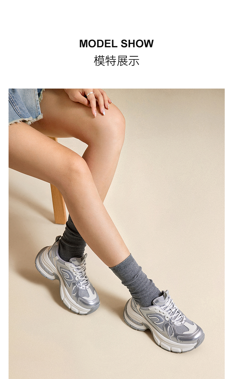 千百度银色网面时尚老爹鞋女款秋季运动休闲鞋A24430020